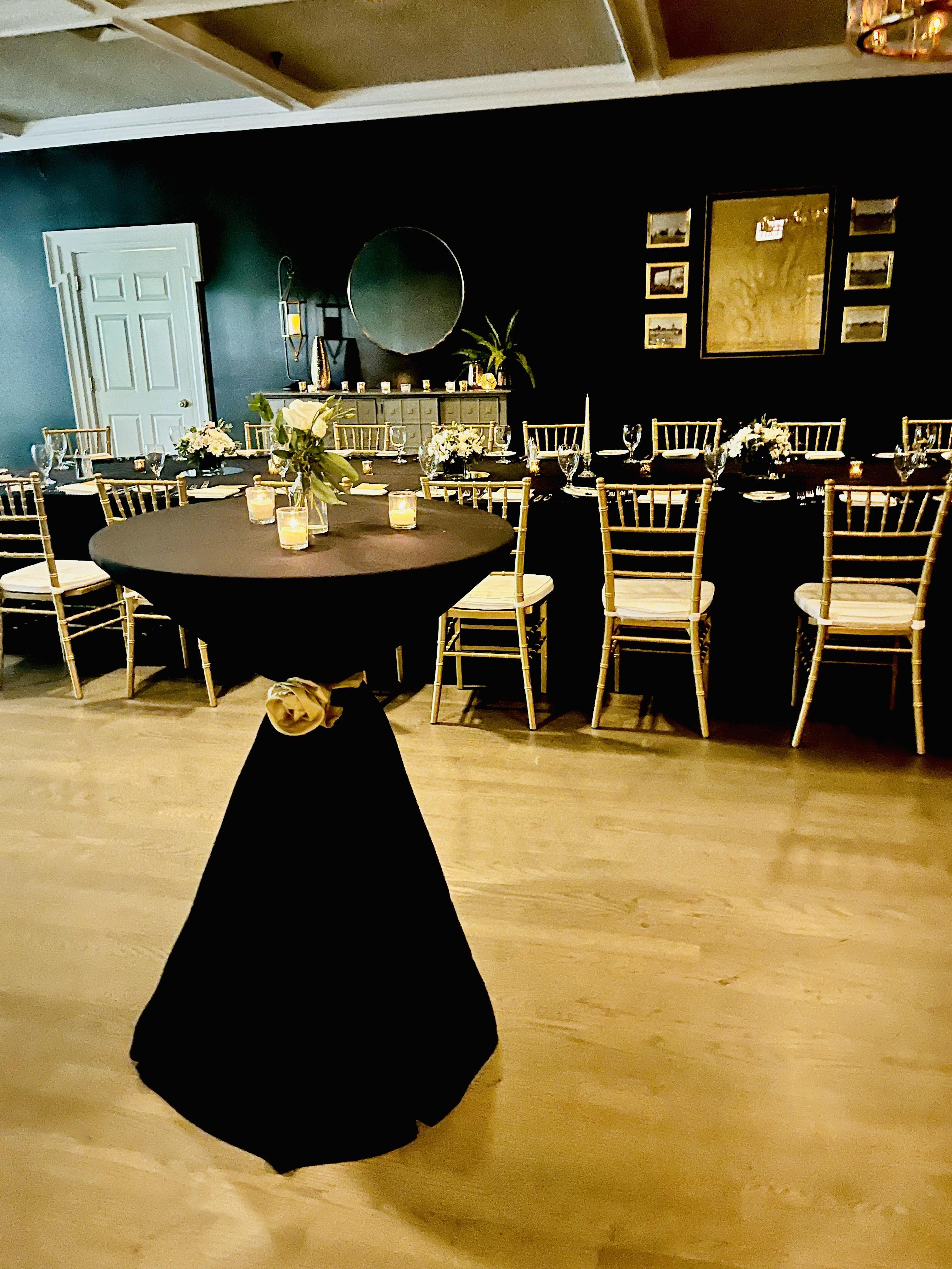 This space features a 3800 square foot room which has room-dividers for smaller parties. We also have a beautiful newly renovated connected patio. Guests love the mid-century chandeliers that are dim-able to your preference.
