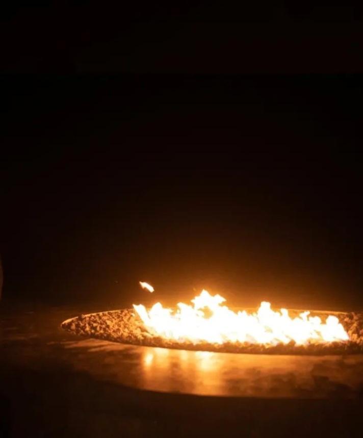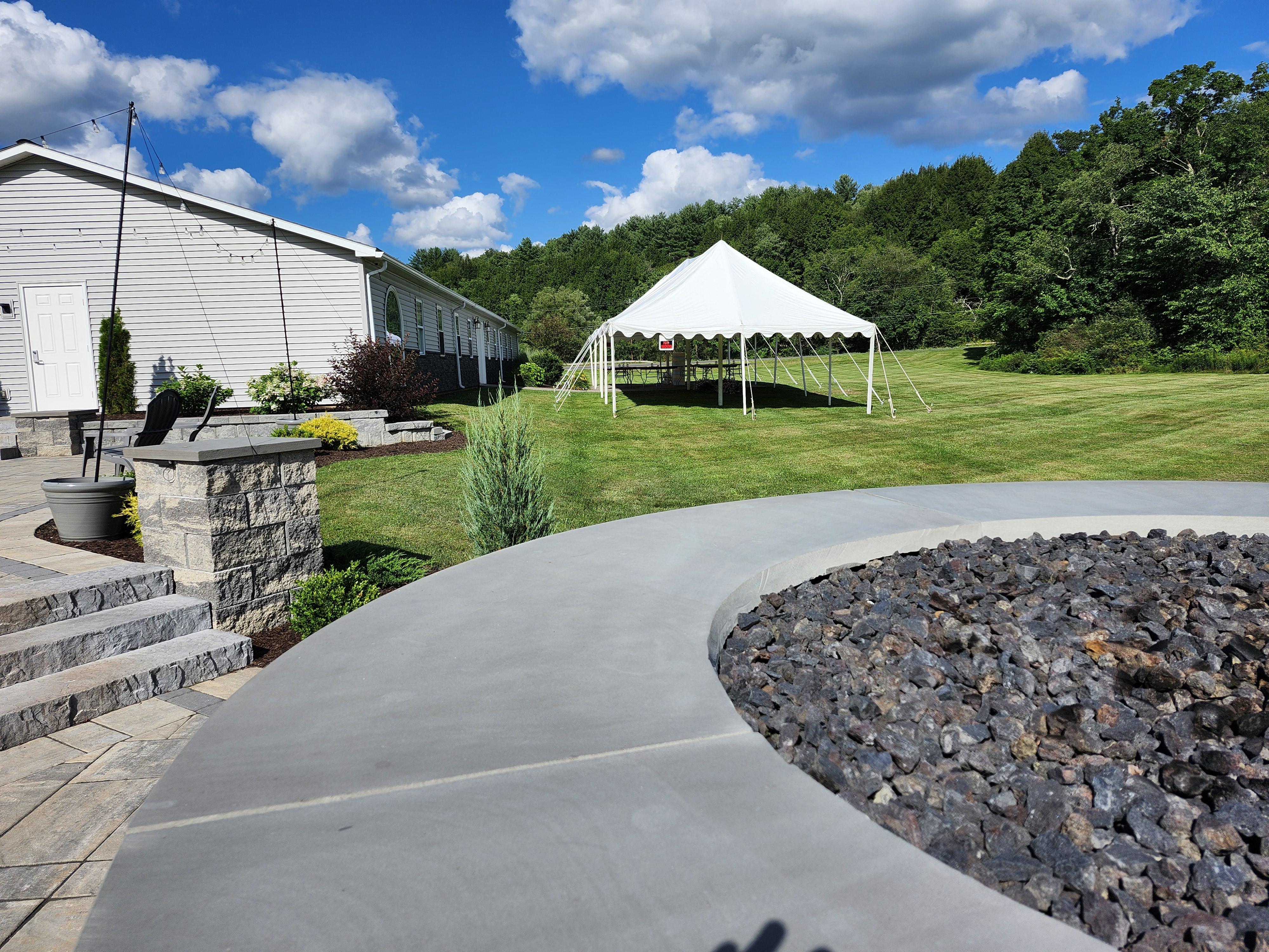 One of two patios at The Grove. Built in bar and bistro lighting. Stand up propane firepit is a beautiful feature. Private spot surrounded by grassy areas and trees.
