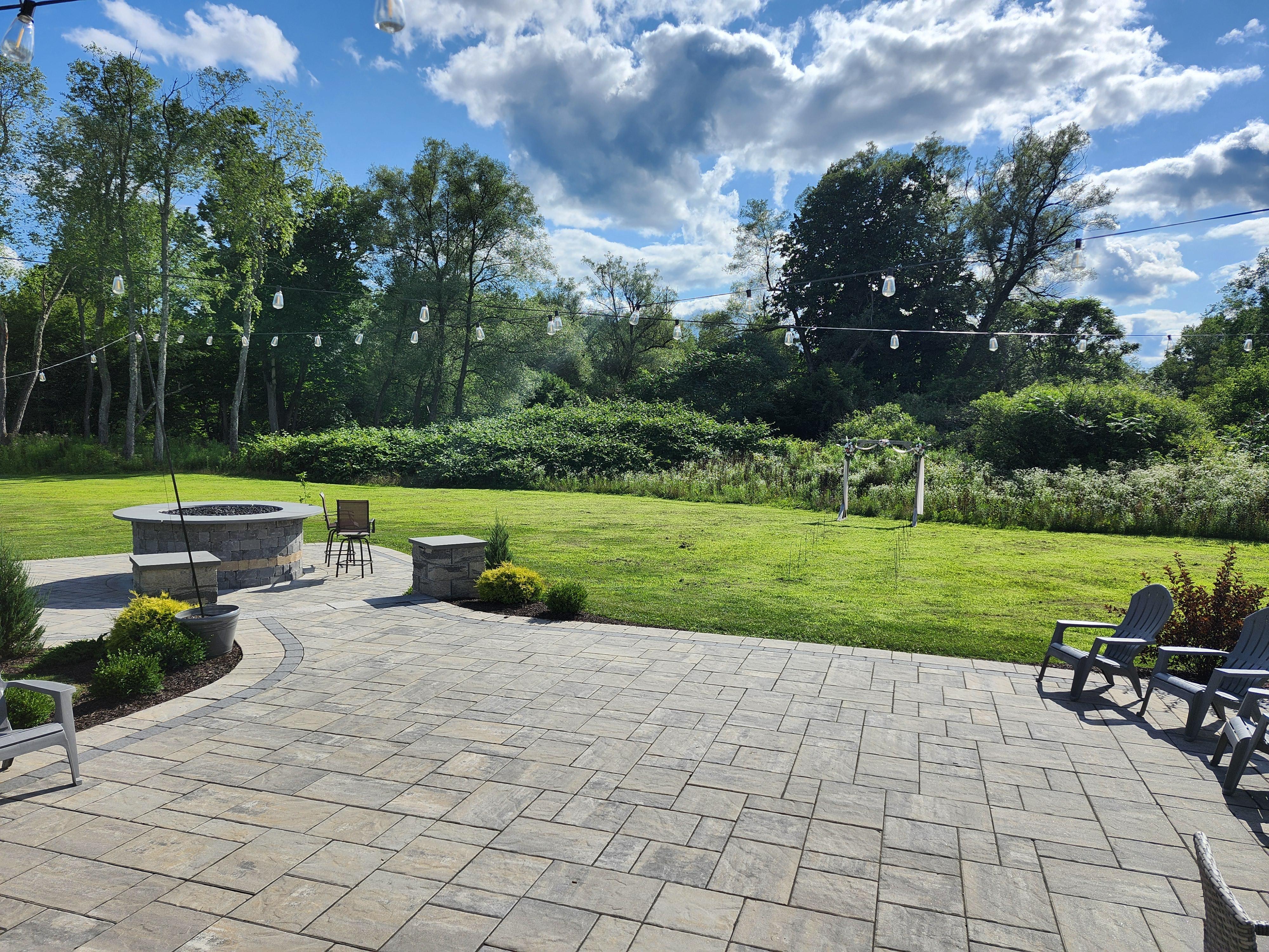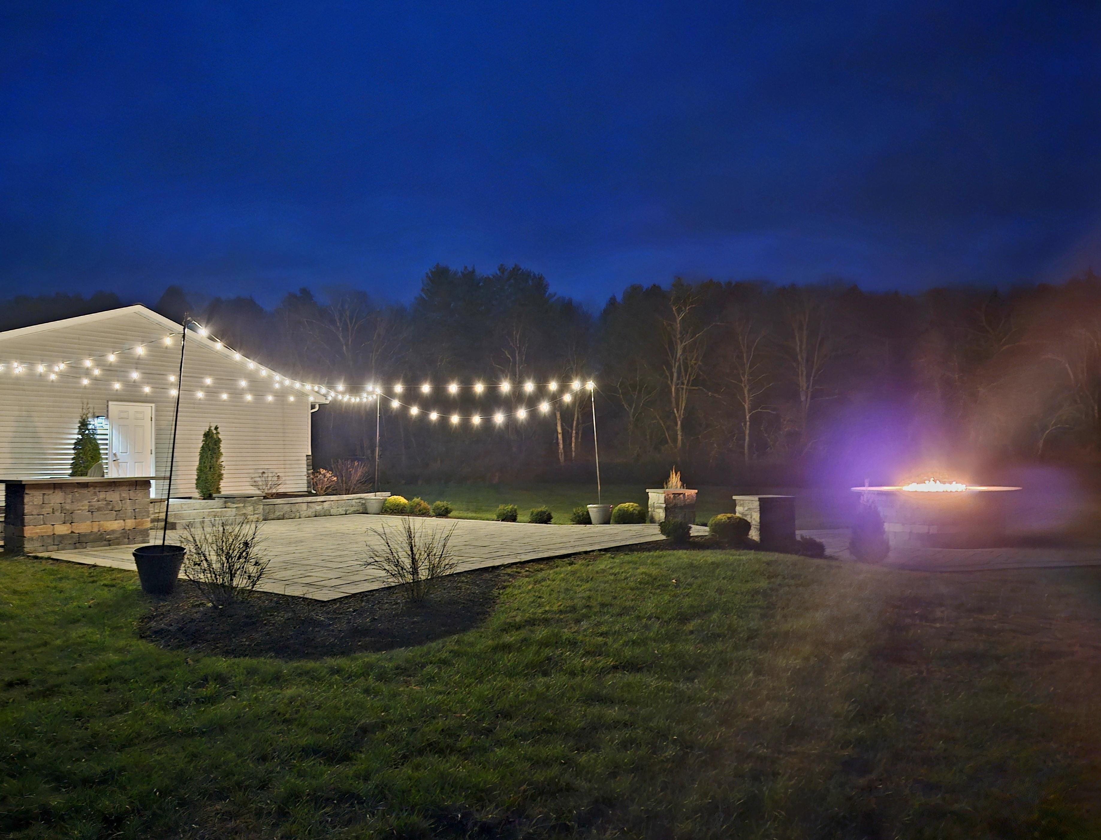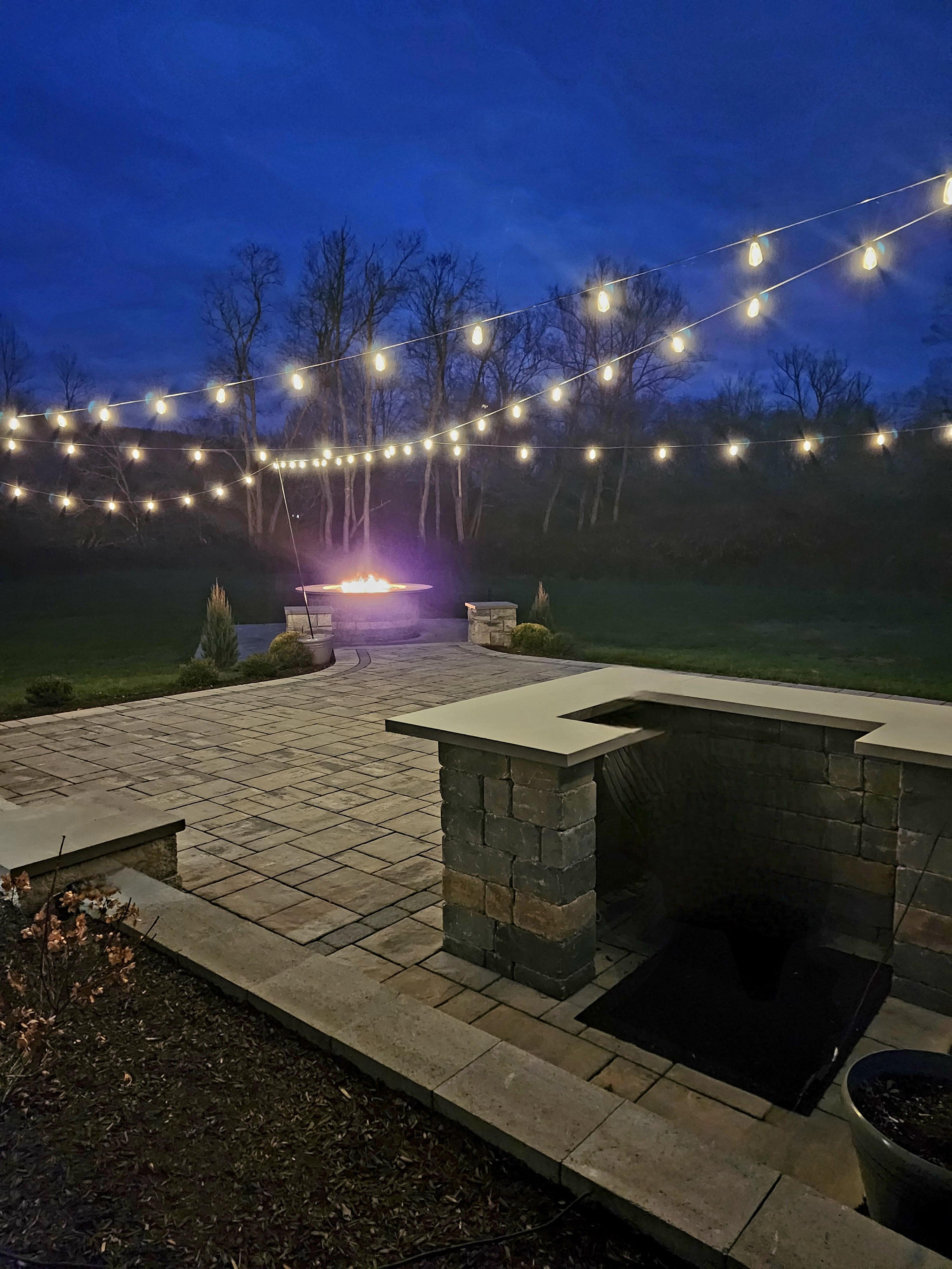 -Bistro Lighting -Stone Bar -Stand up propane fire pit - large stone patios, 2 levels