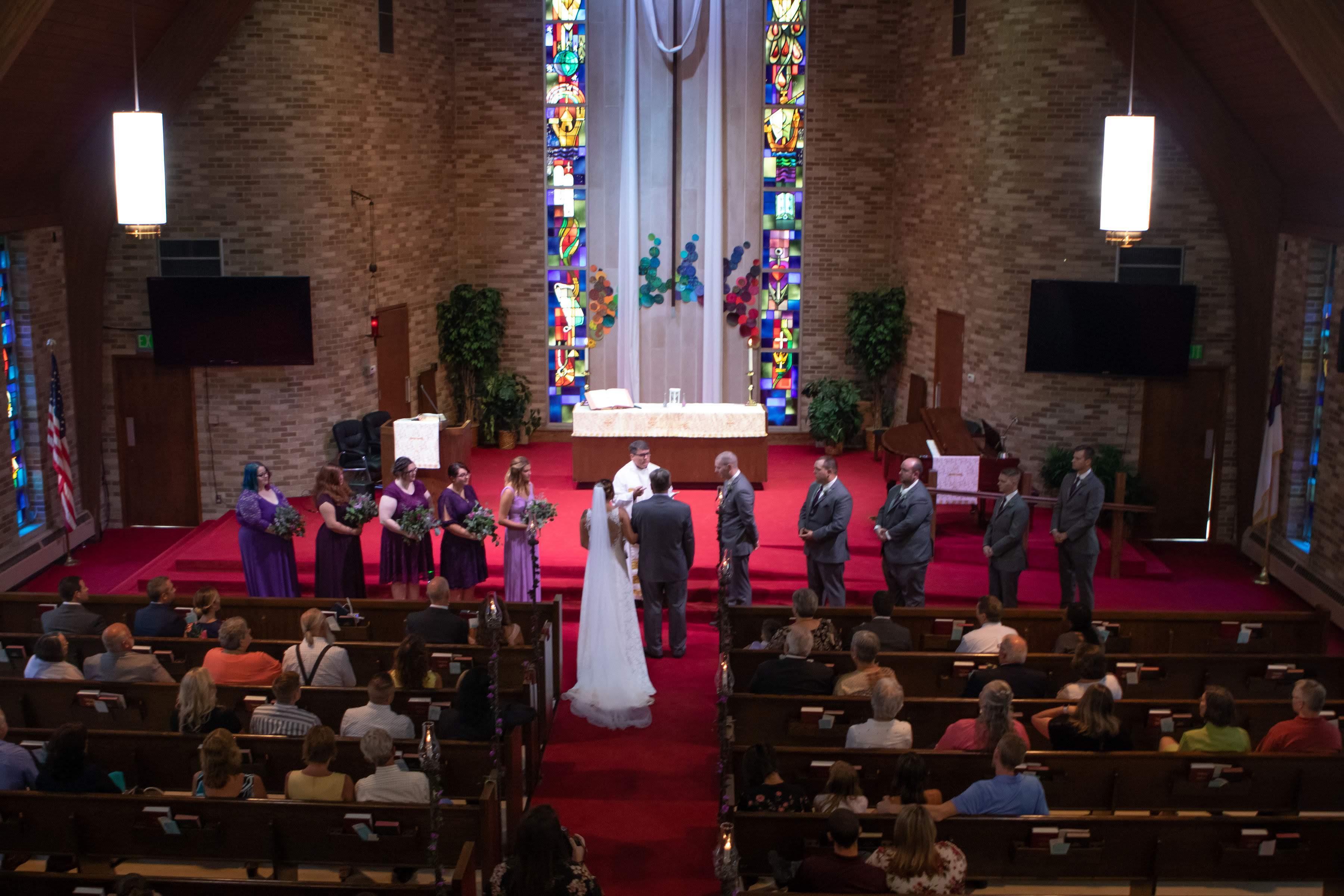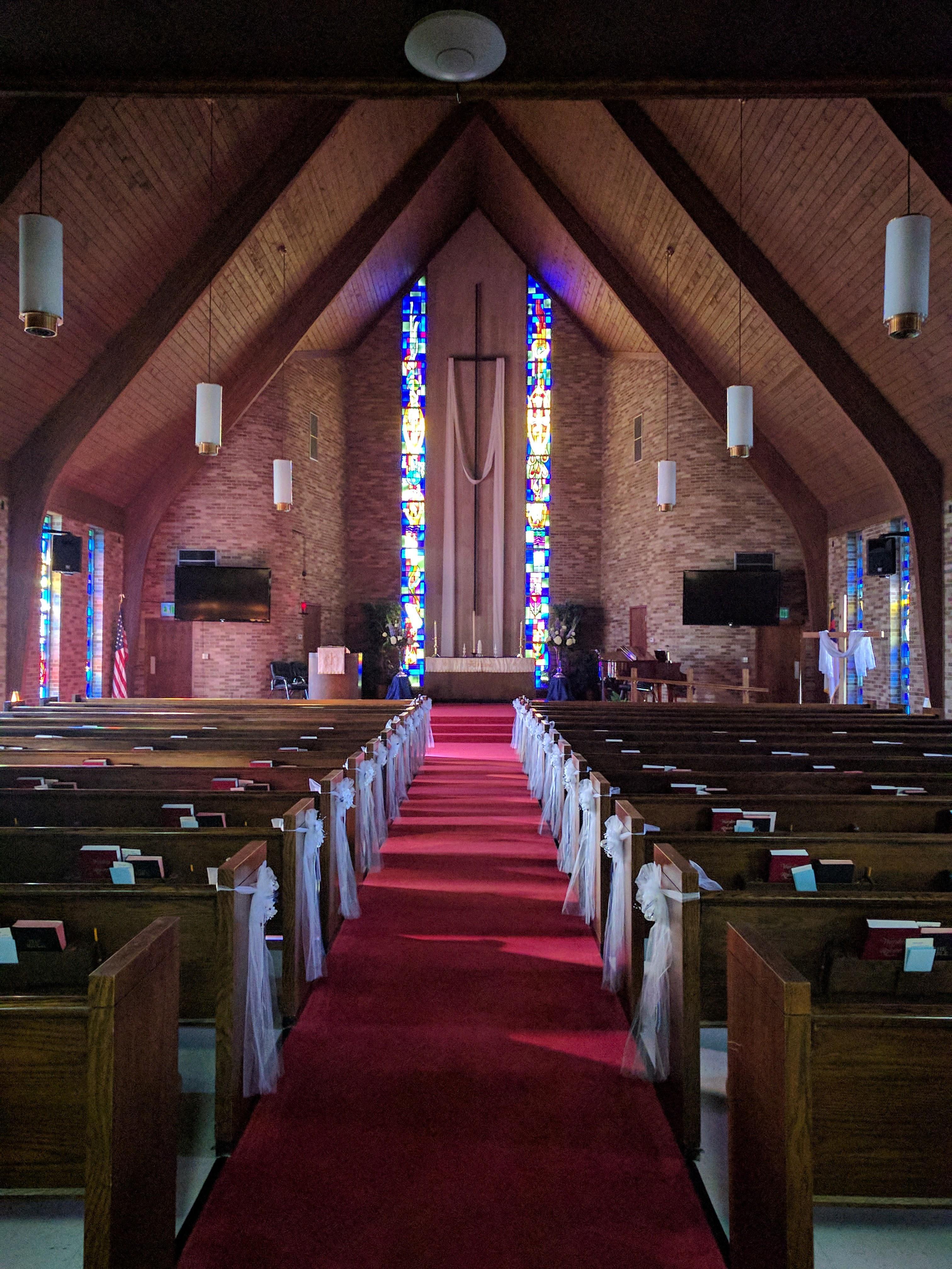 Guests can be seated in wooden pews that surround a carpeted aisle leading to a stunning altar space. A vaulted ceiling, brick walls, and eye-catching stained glass windows create a beautiful backdrop for heartfelt wedding ceremonies.