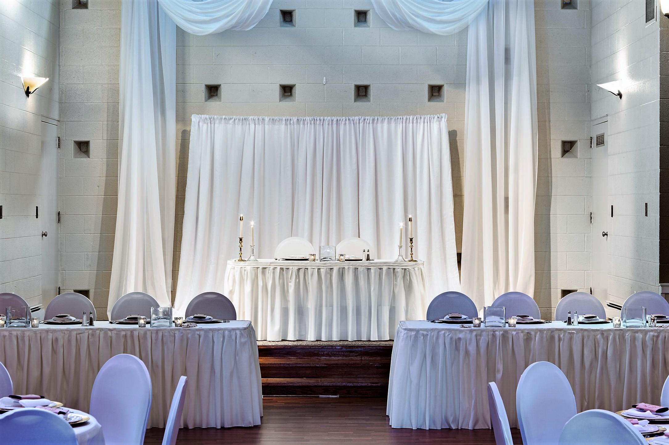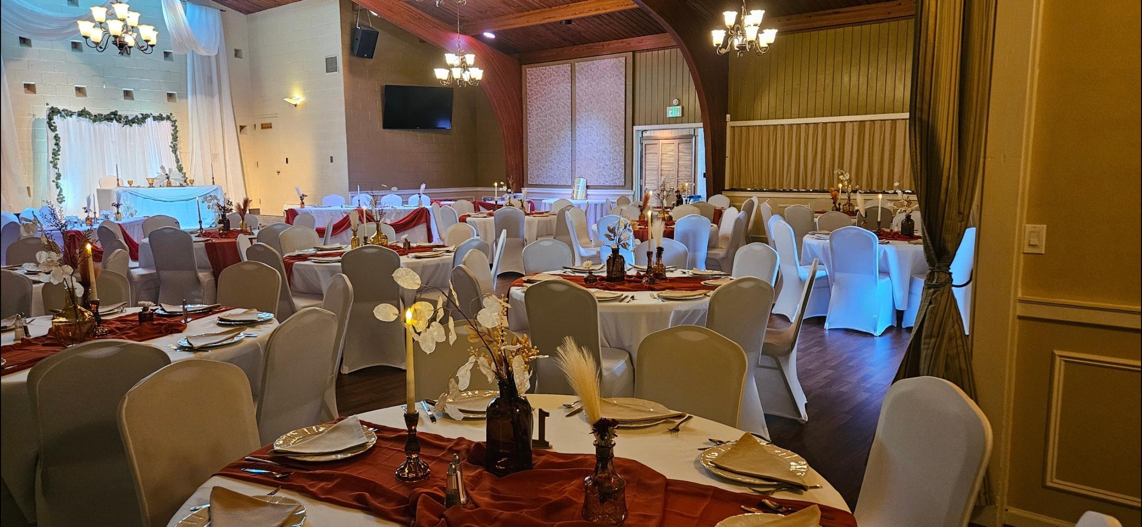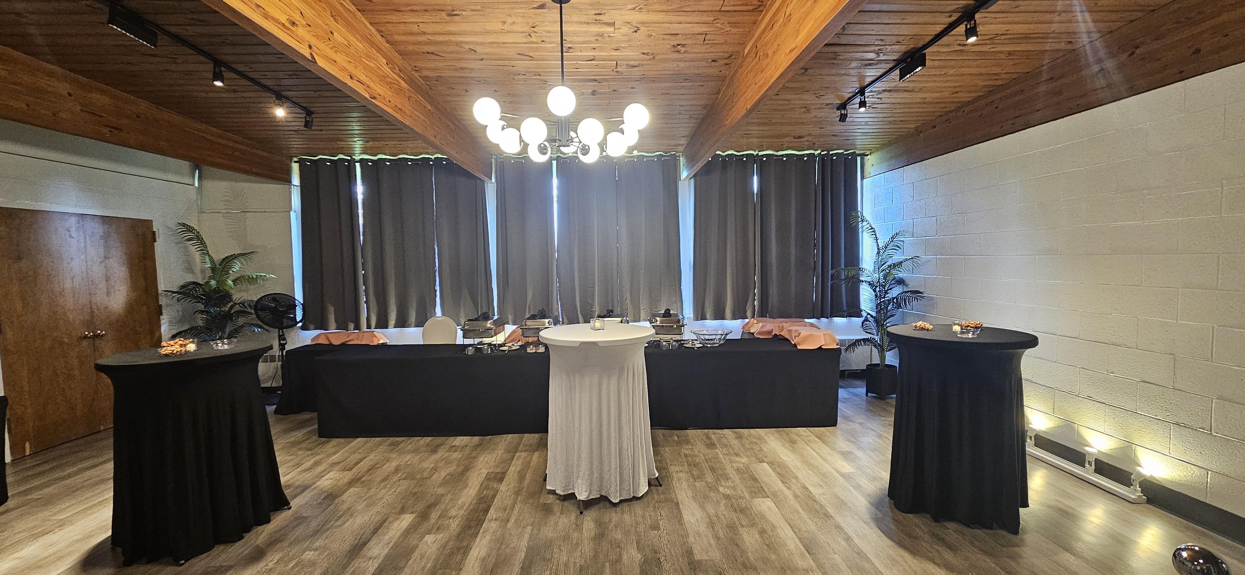 This room features neutral décor, providing a versatile backdrop that can be effortlessly transformed to match any color scheme or event theme. The high ceiling, accented with polished wooden beams, recessed spotlights, and chandelier lighting, adds a sense of warmth and sophistication. At one end of the room, a spacious brick alcove is beautifully illuminated by overhead stained glass, creating a stunning focal point. This area is perfect for seating the couple of honor.