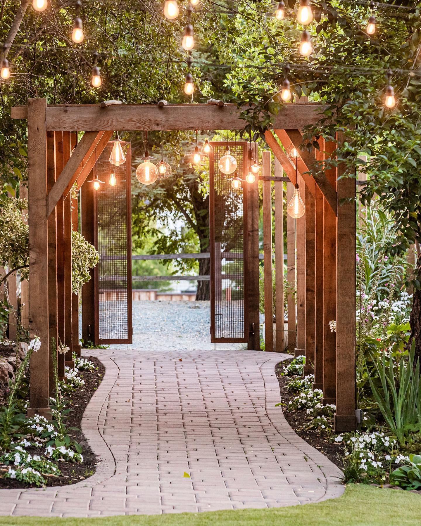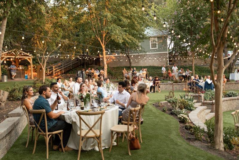 Cocktail Hour at the Cocktail Jungle. Your guests will follow a floral-lined, winding garden path to our 30' x 50' covered arbor, where cocktail hour unfolds beneath our shaded, string-lit pergola. It’s a serene, storybook setting to sip and gather between ceremony and reception. This space can also be transformed for more intimate celebrations — accommodating a ceremony of up to 80 guests or a reception for 60 or fewer.