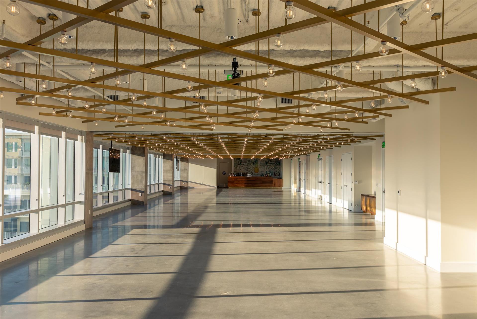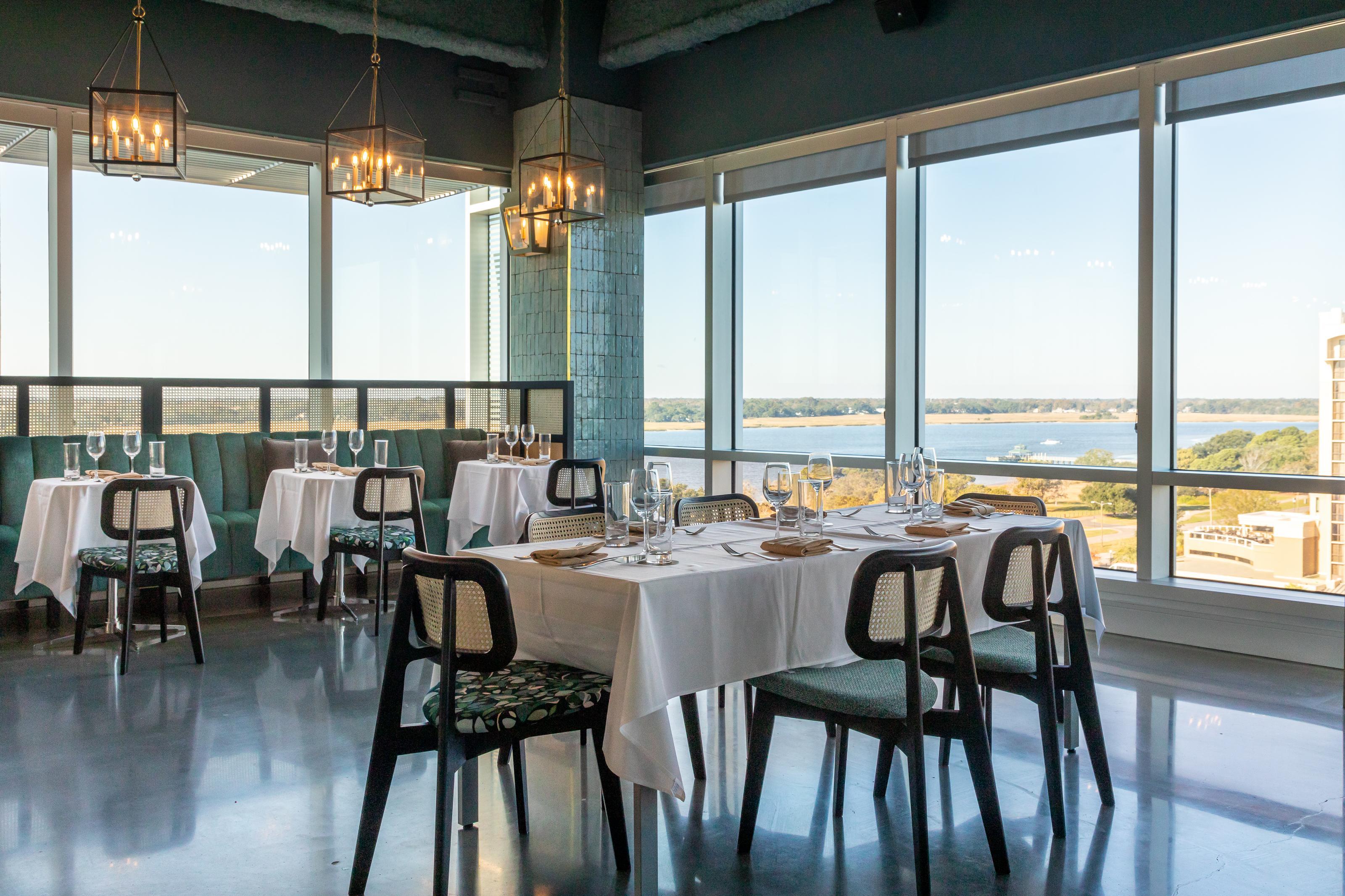 Floor to ceiling windows in each event space offer one of a kind views of the Ashley River, bridges, metropolitan expanse and beyond. The ballroom features seating for 250+, a custom built-in bar, and vast open space for a number of setup options. Two air walls allow this space to be partitioned into 2-3 separate ballrooms. Polished concrete floors set the sophisticated scene with endless options for plated or reception style celebrations, casual cocktails or rehearsal dinners.
