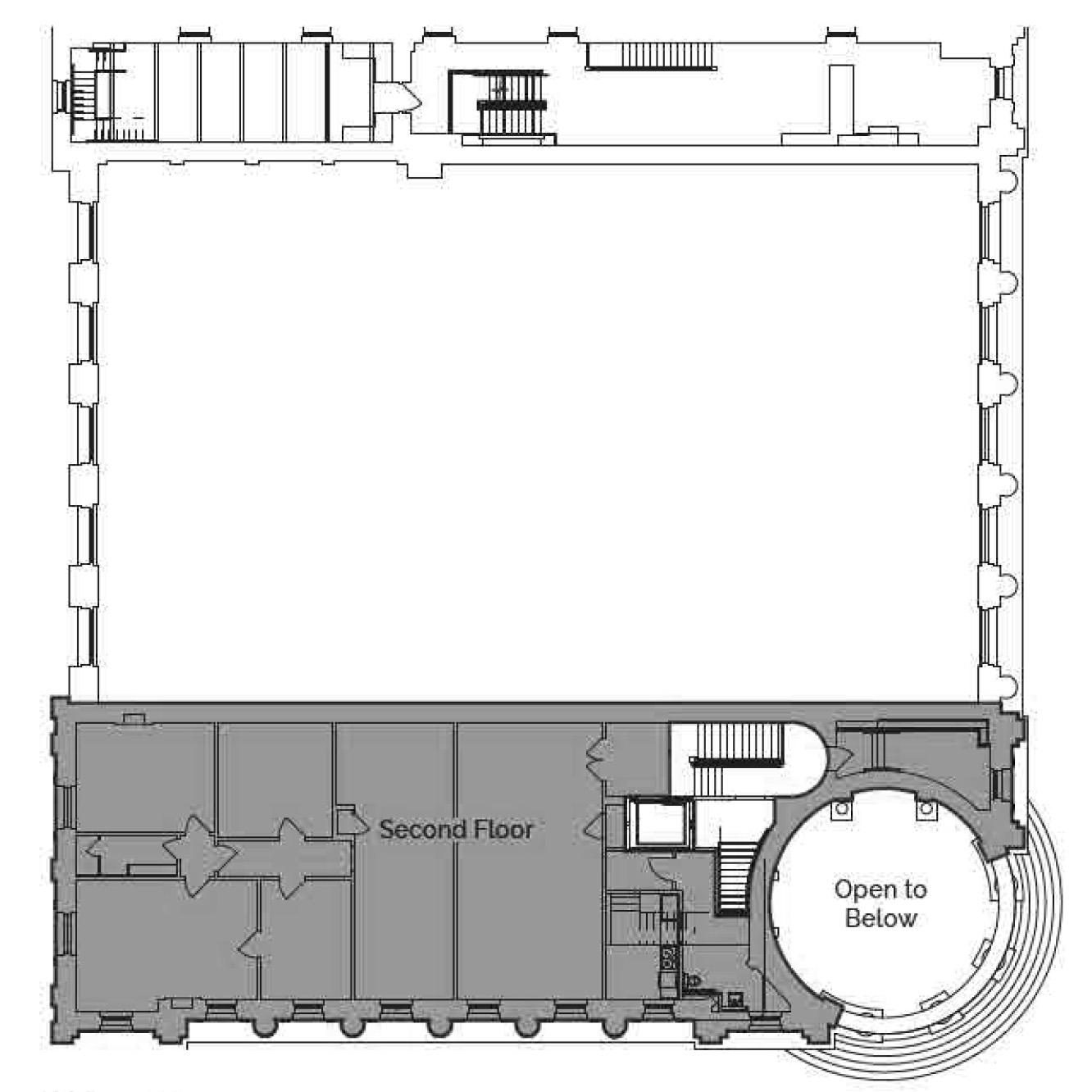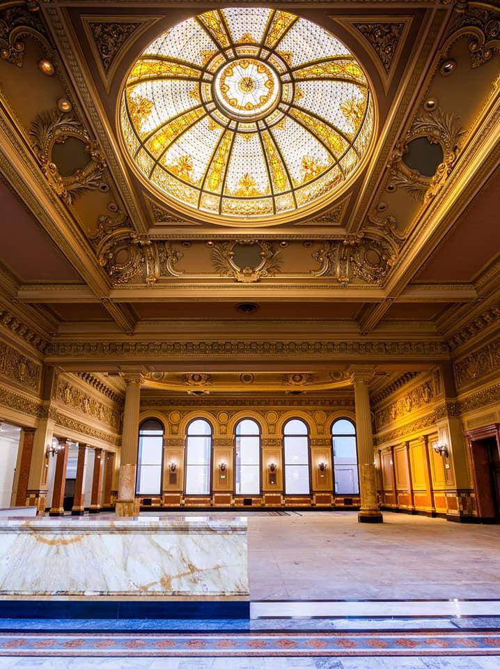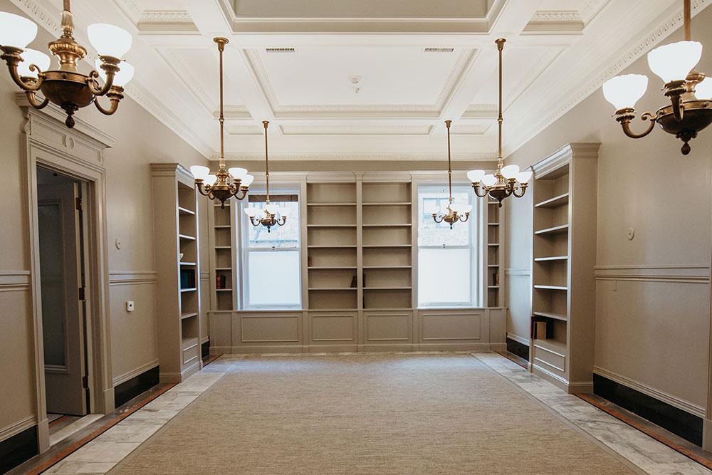 The Main Banking Hall showcases the exquisite craftsmanship and quality of its 1892 construction and its unique, expansive space features an original bank teller counter, opulent gold detailing, and breathtaking stained glass skylights. The Hall also includes a suite of bankers’ offices, as well as a substantial marble-encased vault with original safe doors and fittings.
