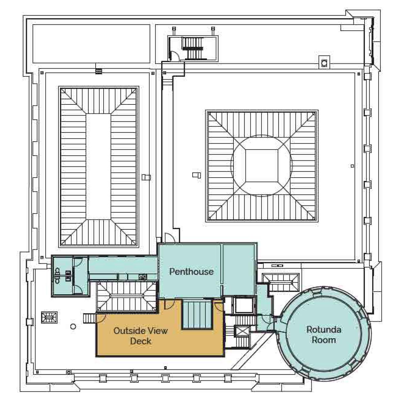 The Penthouse’s loft-style space boasts lots of natural light and private access to The Hibernia’s dome and outdoor deck, providing the ideal setting for rooftop happy hours, intimate weddings, receptions, elegant dinners, and gatherings with friends.