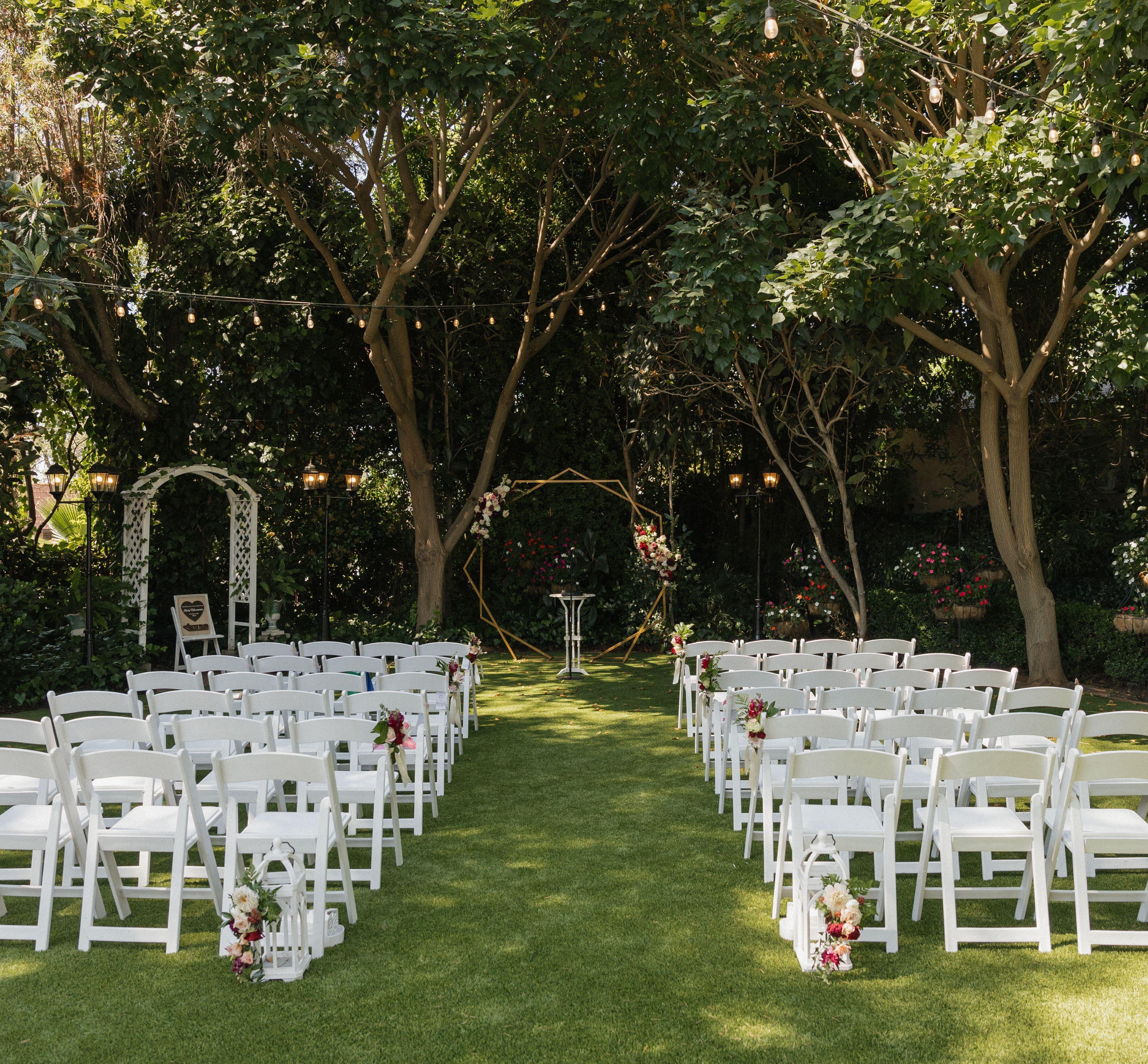 Beautiful, lush garden space completely surrounded by greenery, whimsical lighting, market lighting and the perfect space for your reception!
