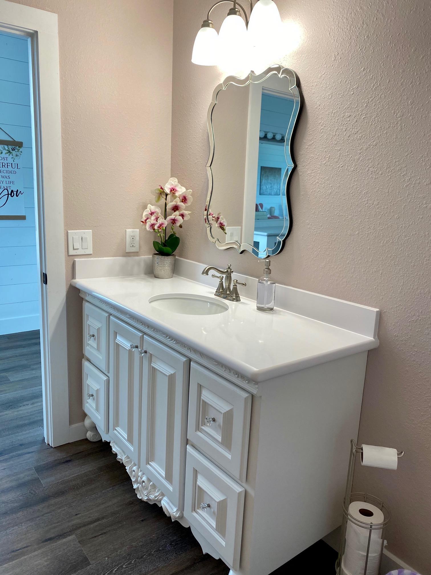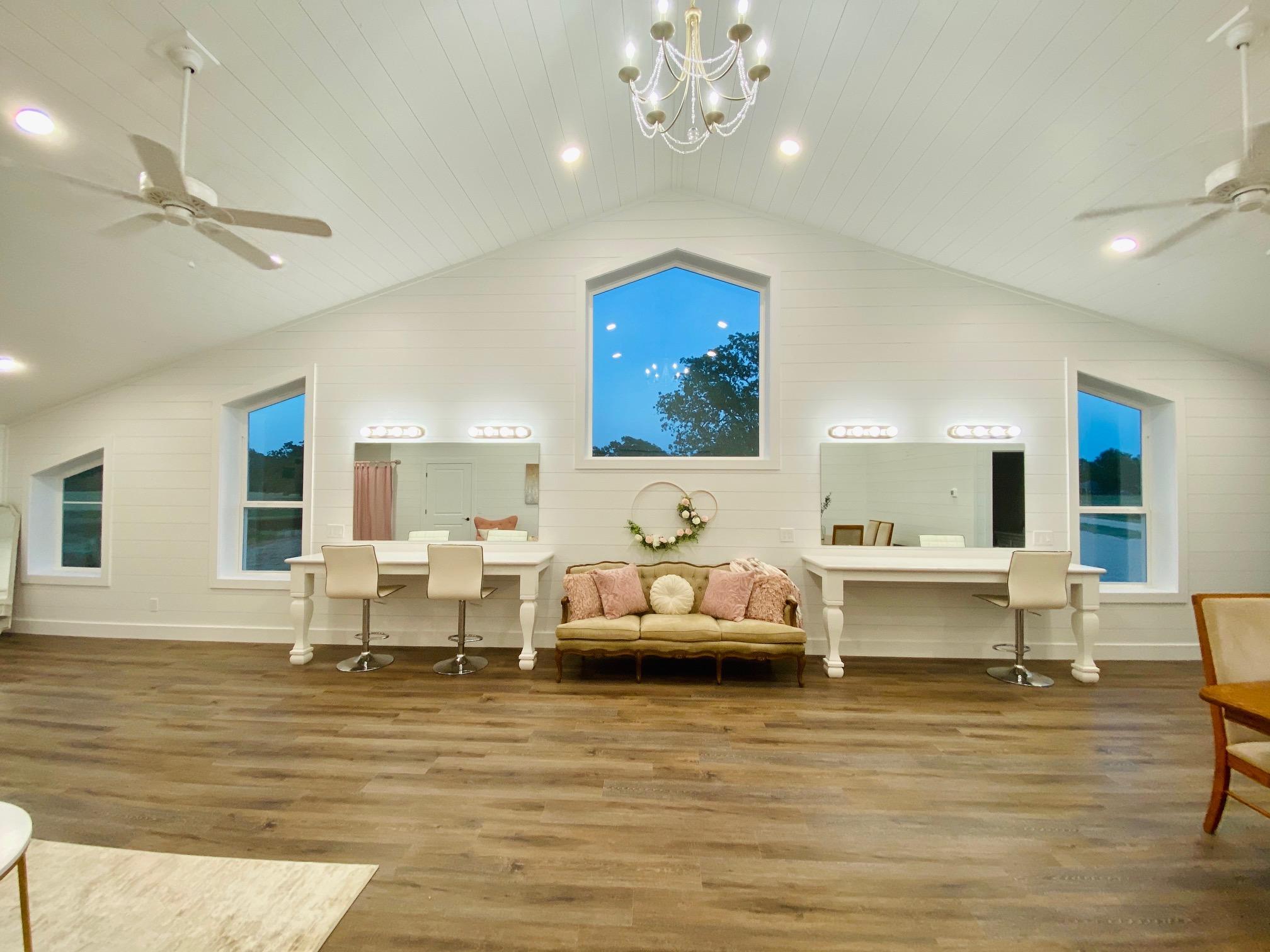 Spacious area with all the natural sunlight for make up and hair. 2 vanities with 3 chairs at each station. Full bathroom. Kitchenette area with keurig and microwave. Full size refrigerator. We have 2 antique couches and 2 beautiful chairs for sitting and pictures. We also have a dining table for a nice brunch with your favorite ladies.
