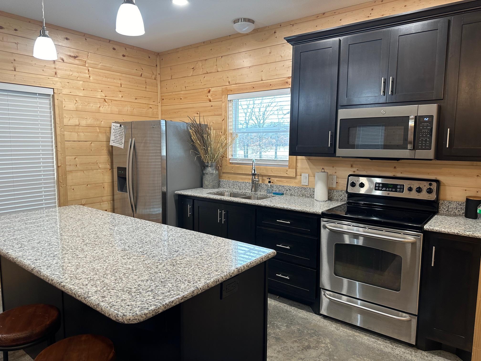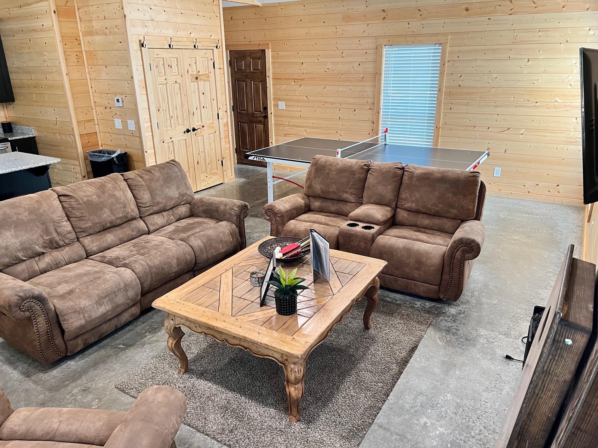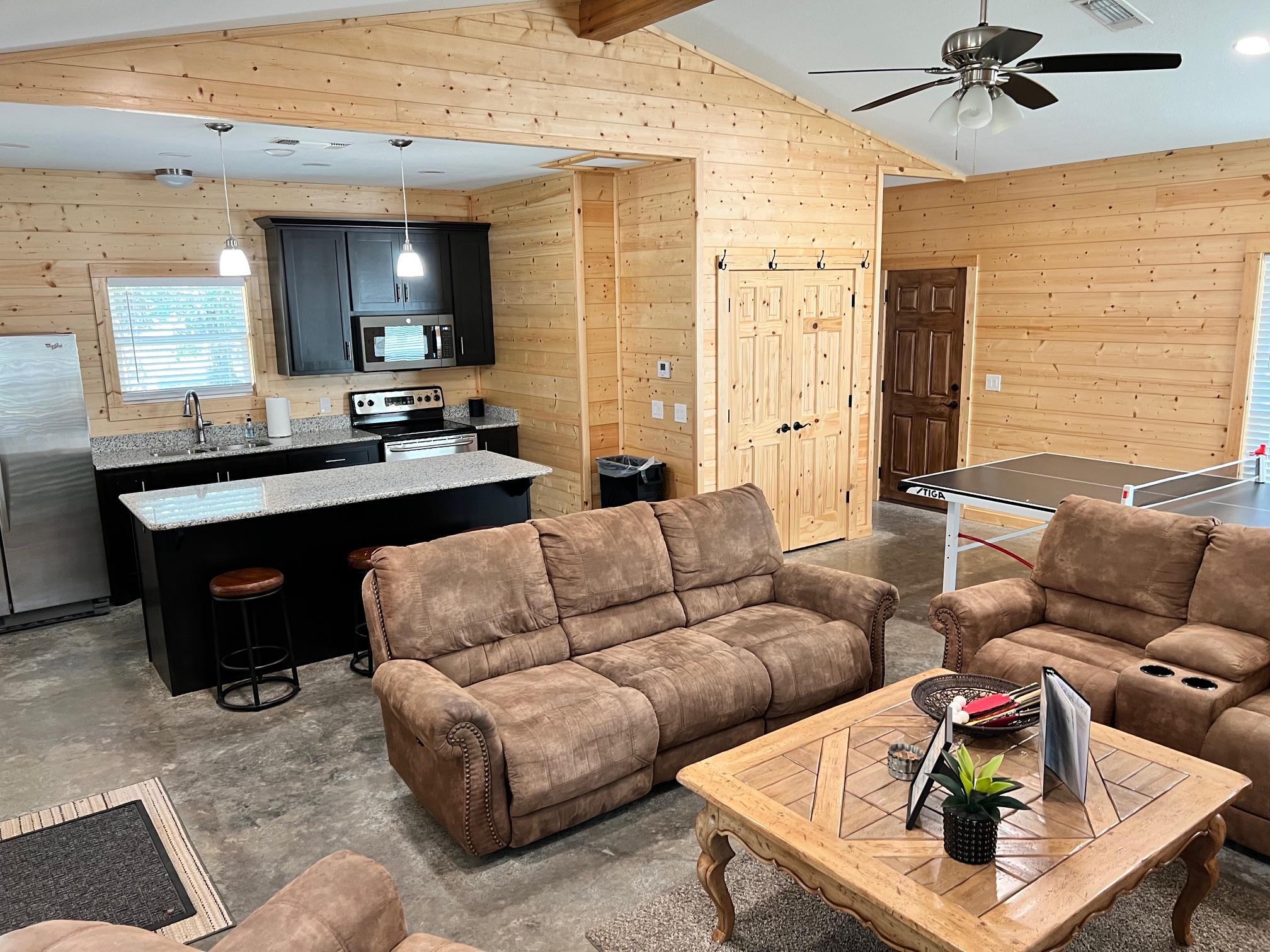 Wall mount TV Ping pong table Stocked pond for catch and release fishing Full kitchen Full bathroom