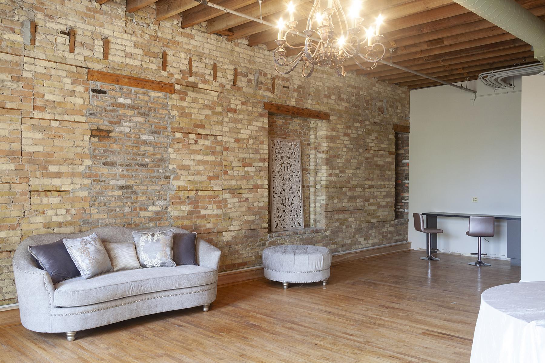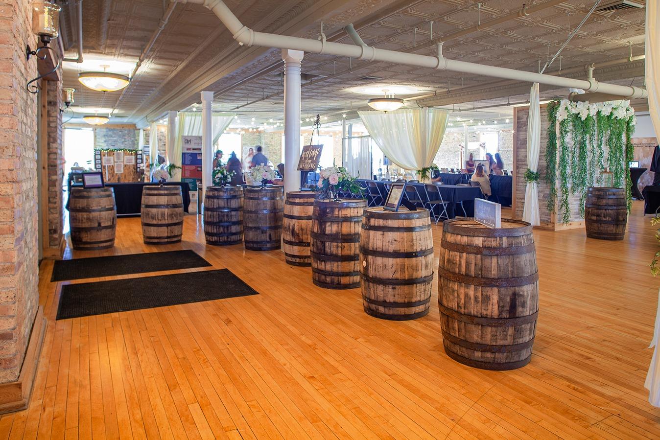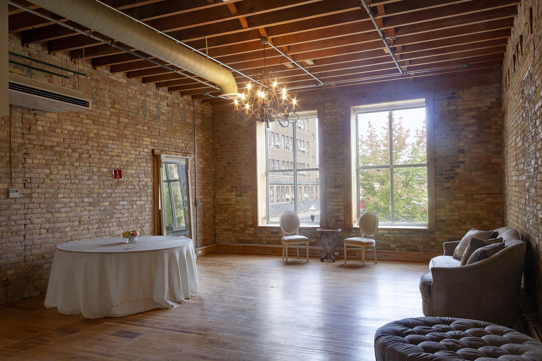 This beautiful loft is the ultimate blank canvas on which to create your vision with a great central Elgin location. Oversized floor-to-ceiling windows stream ample light onto the golden hardwood floors and weathered brick walls, and a beautiful ceiling of decorative pressed-tin tiles adds a vintage charm. Our space can be divided into smaller sections for an intimate affair, or to create individualized areas during a larger event—whatever your imagination can divine!