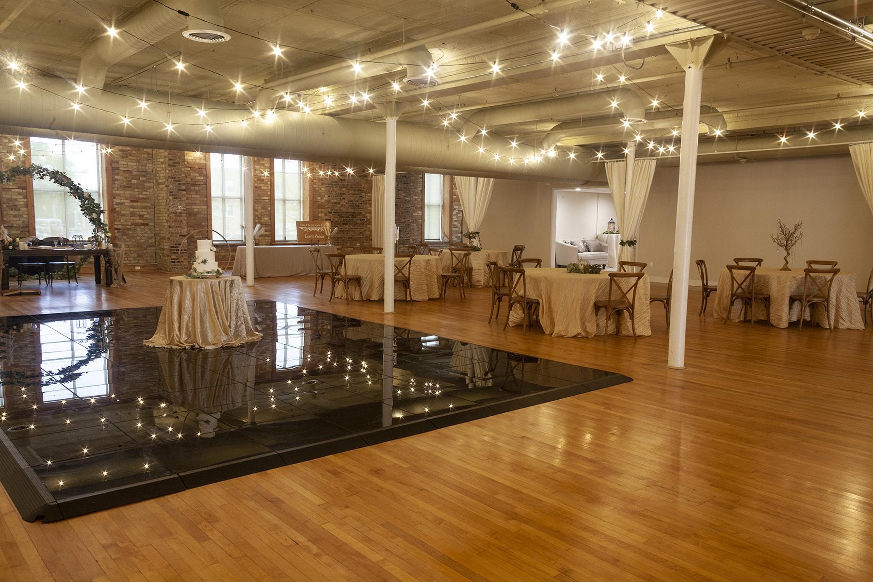 The Highland Loft Event Space's Second Floor Loft is an exclusive 17,000sf space with a large bridal suite , private bathroom and wet bar all residing on the second floor A centralized LED dance floor , spacious bar, tasting room are available for your needs on your wedding day.