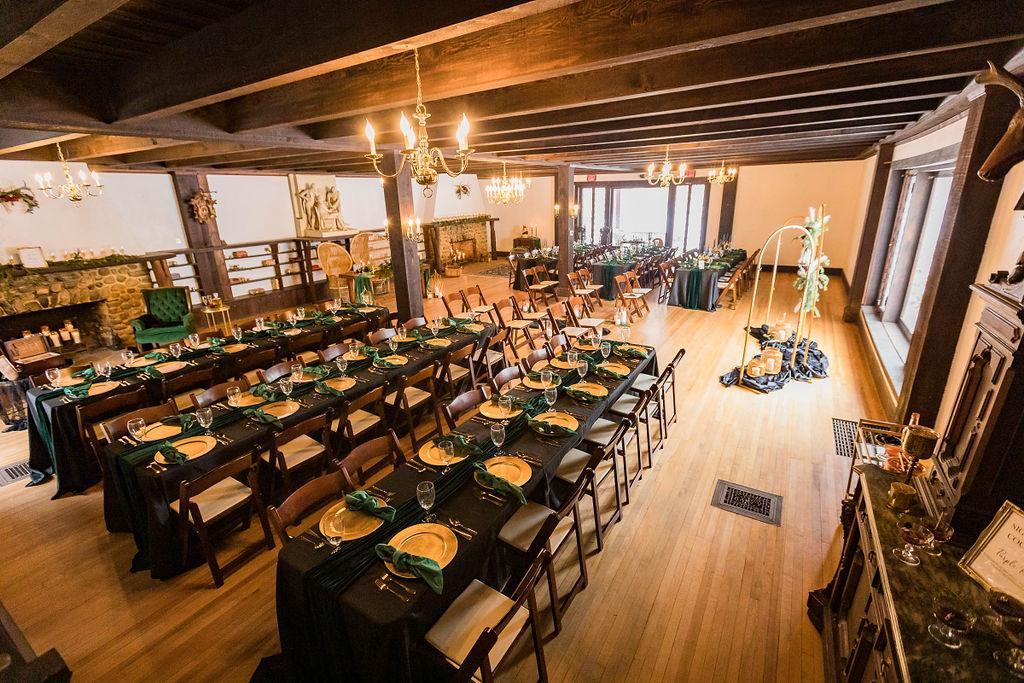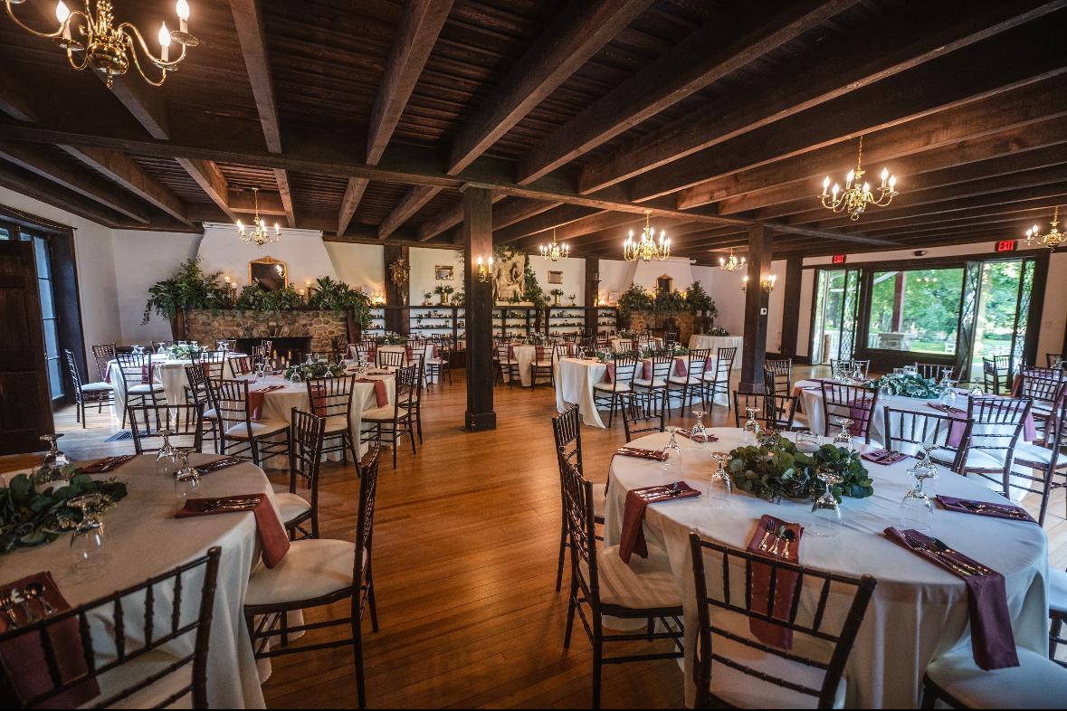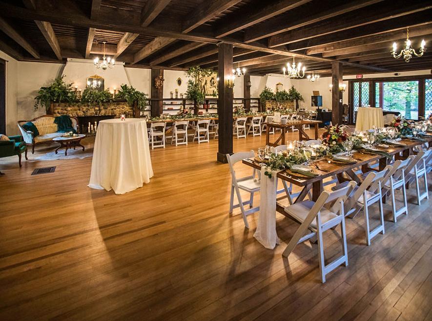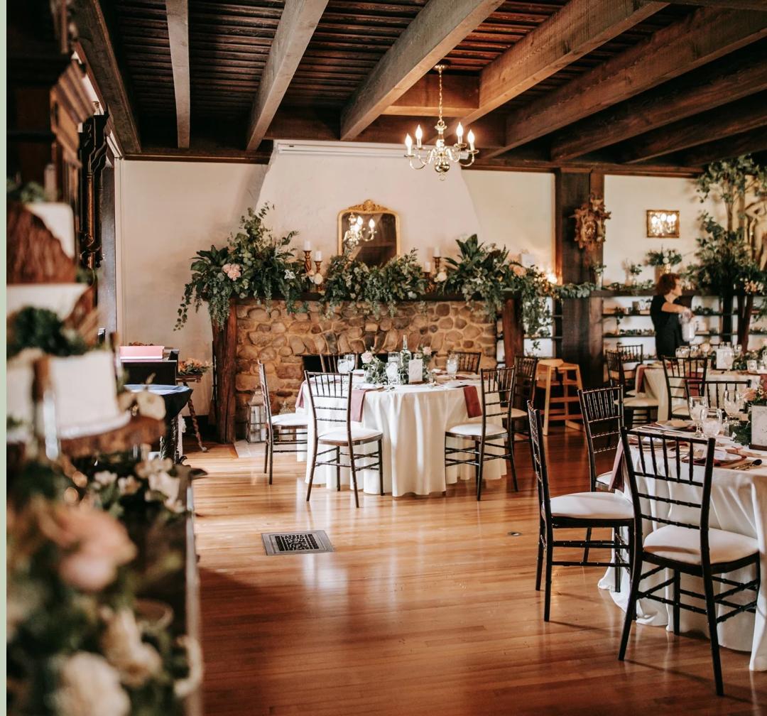 The ballroom, accented with vintage decor and two massive fireplaces, antique furniture, hardwood flooring, and chandeliers, can accommodate up to 115 guests.