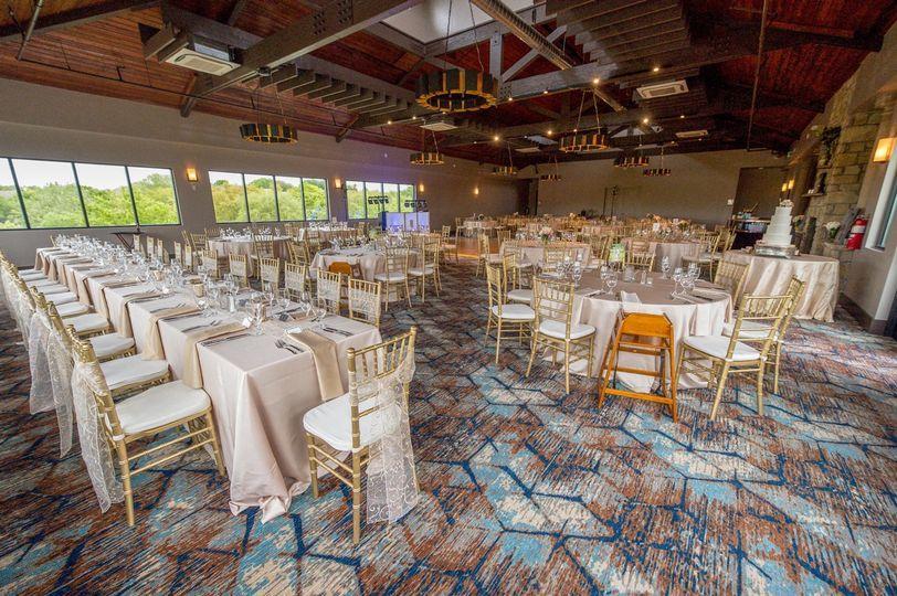 This space features floor-to-ceiling windows to show off our golf course and waterfall, a built-in bar, and more traditional, muted tones; perfect to add color and decor to!