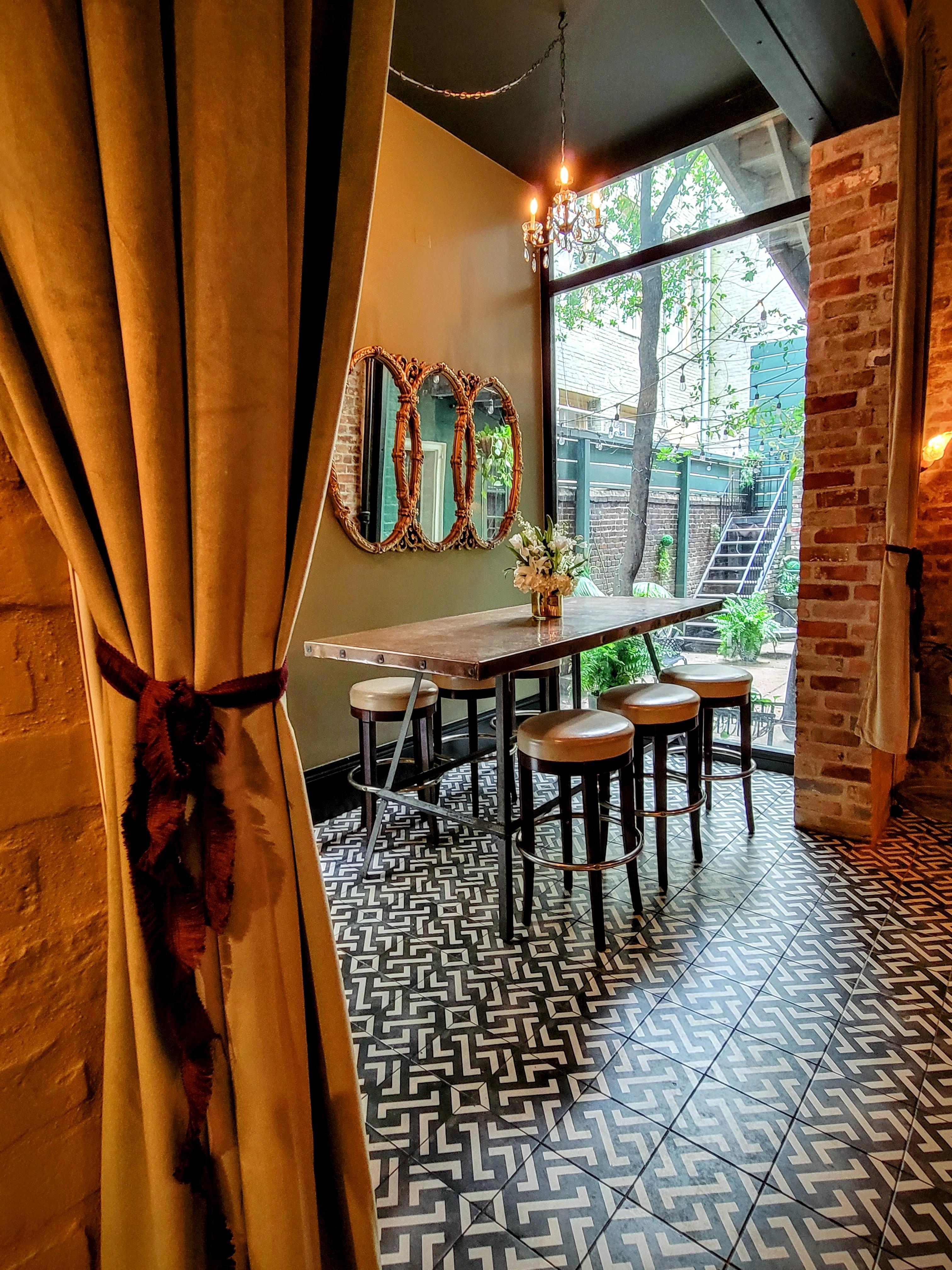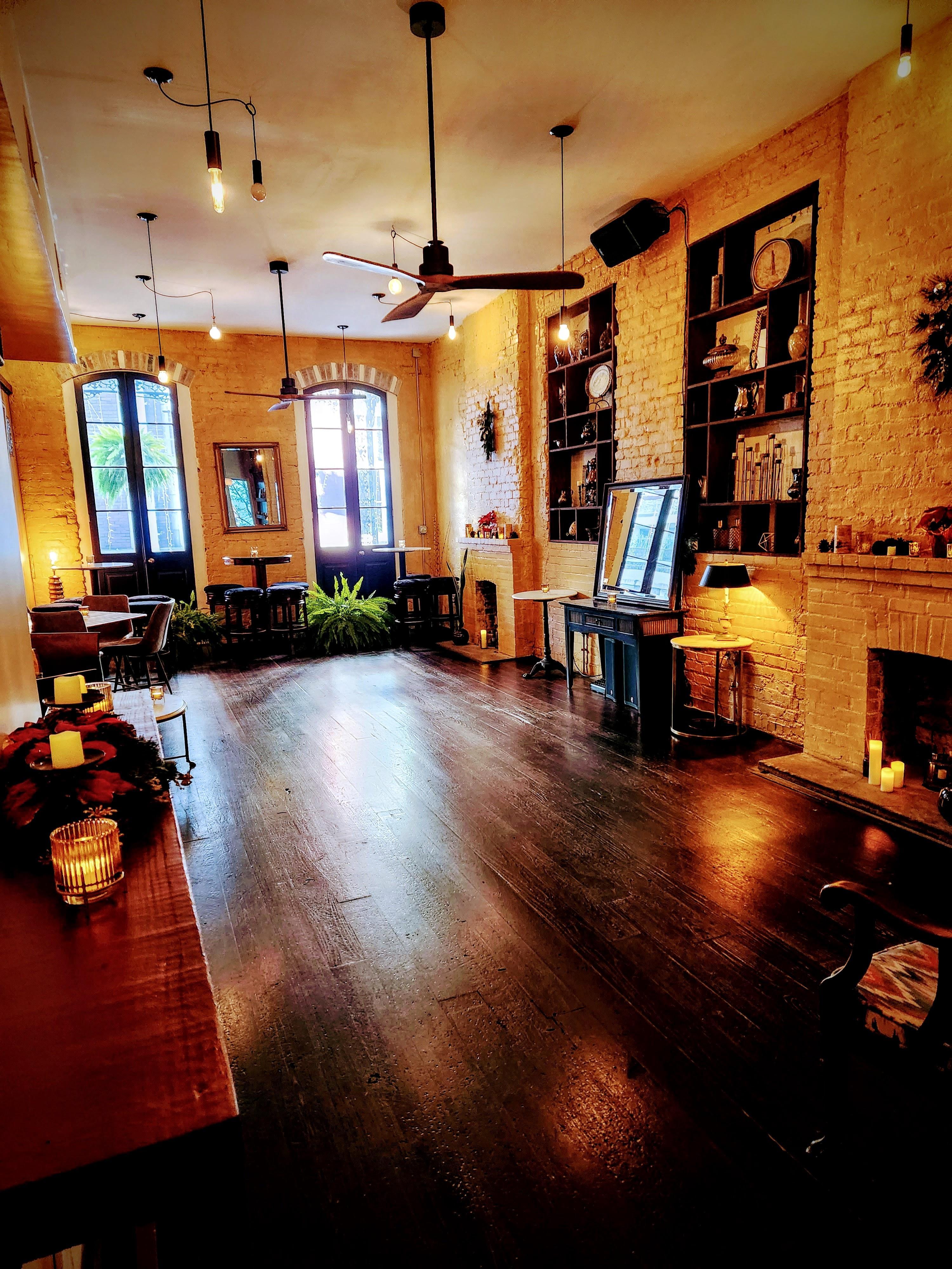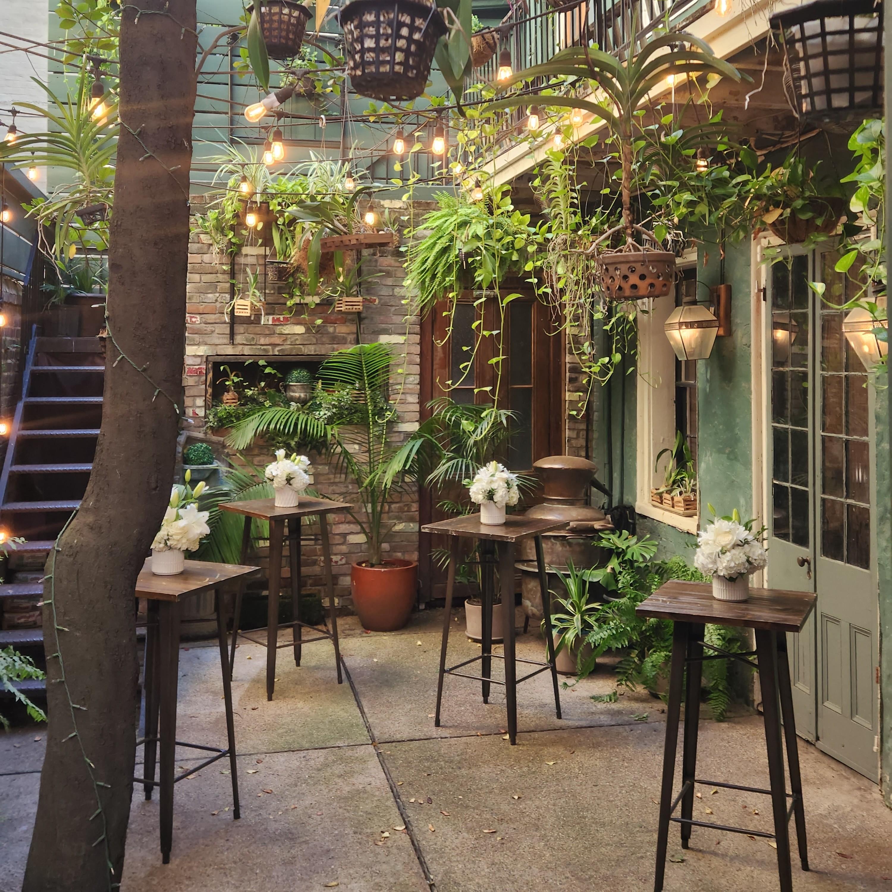 The main floor dining, bar and courtyard is part of a venue buyout that includes the 2nd floor parlor and balcony.