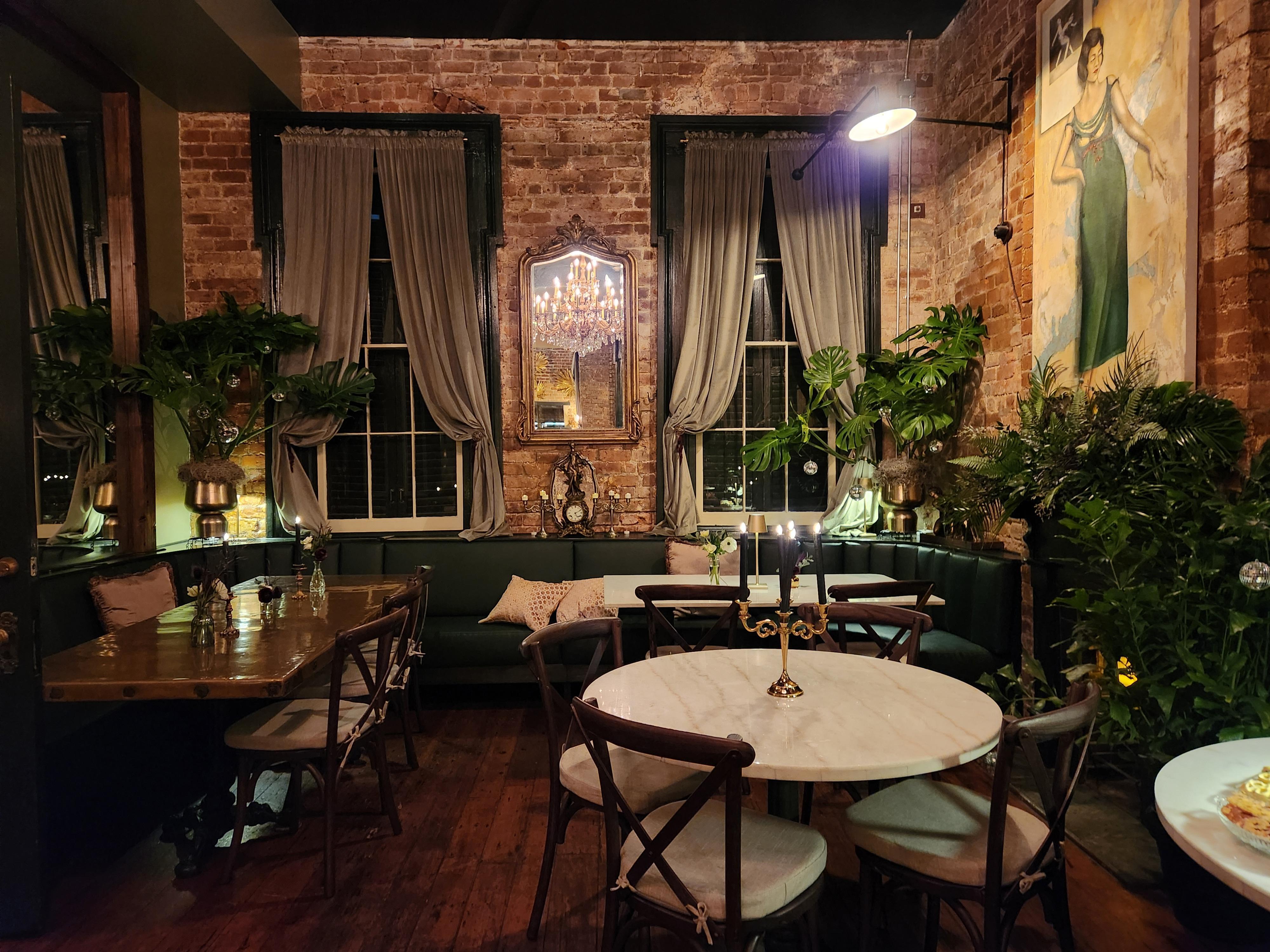 This space features built in banquette seating with marble tables, velvet curtains and a stunning chandelier. A full bar is attached along with a small dessert nook and an lush courtyard.