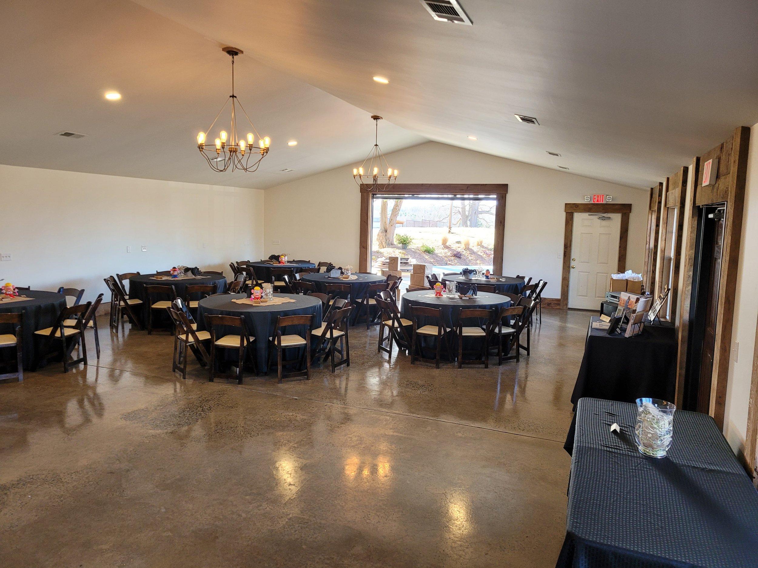 Hi this place is great! It has some of the most beautiful views in Randolph COunty - there are real live animals there... concrete walking paths - indoor and outdoor options - climate controlled facility - Wedding barn the bathrooms have some sort of custom made epoxy coated solid oak counter tops - there is real farm equipment but they will move it out of site if needed sunset off of a roll up garage door - very unique and much less expensive than others