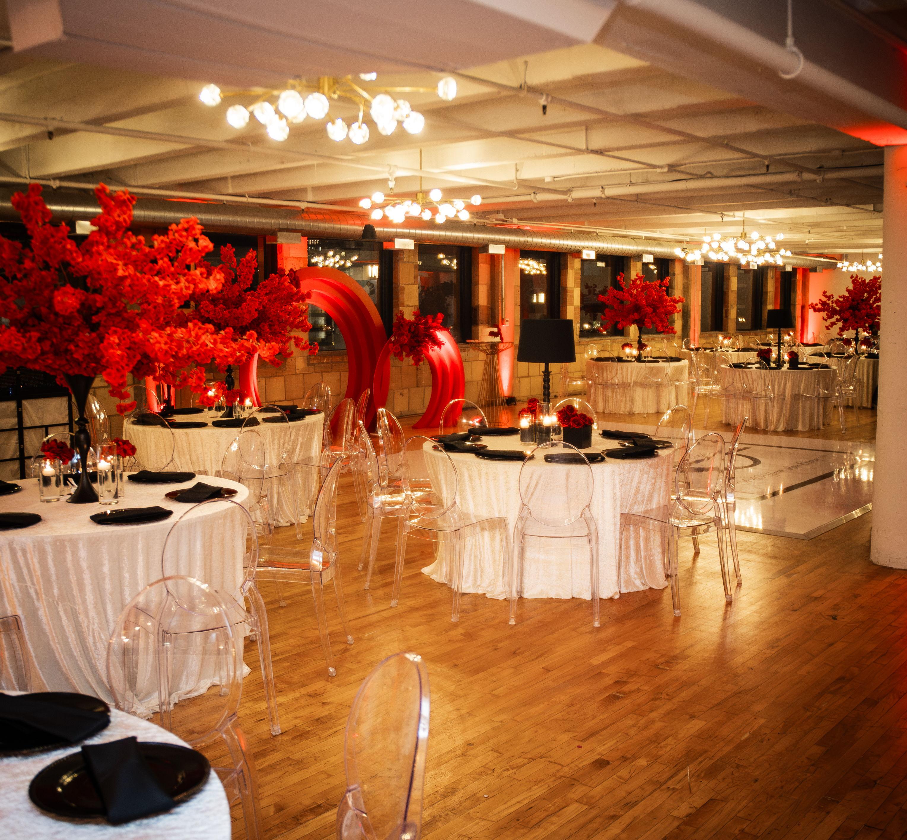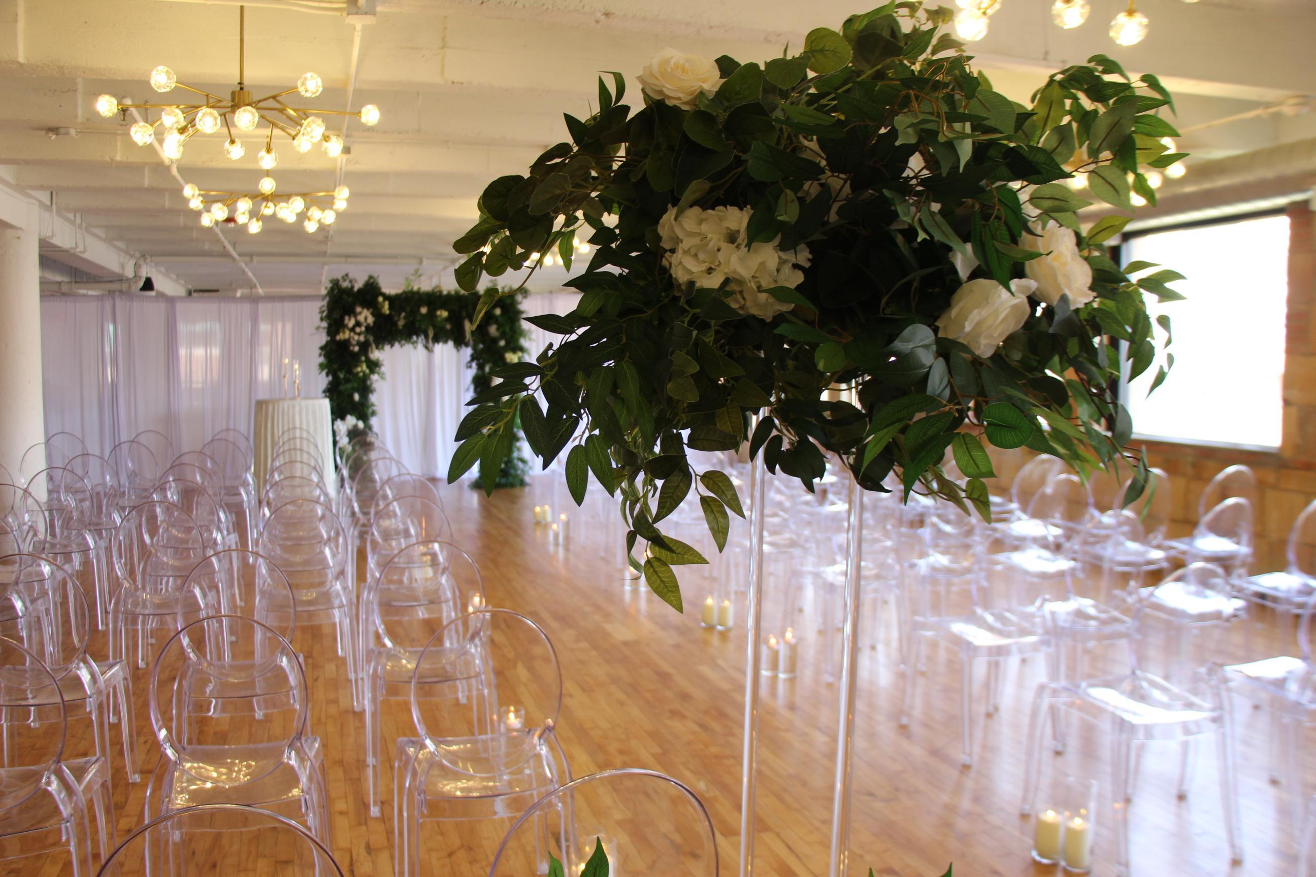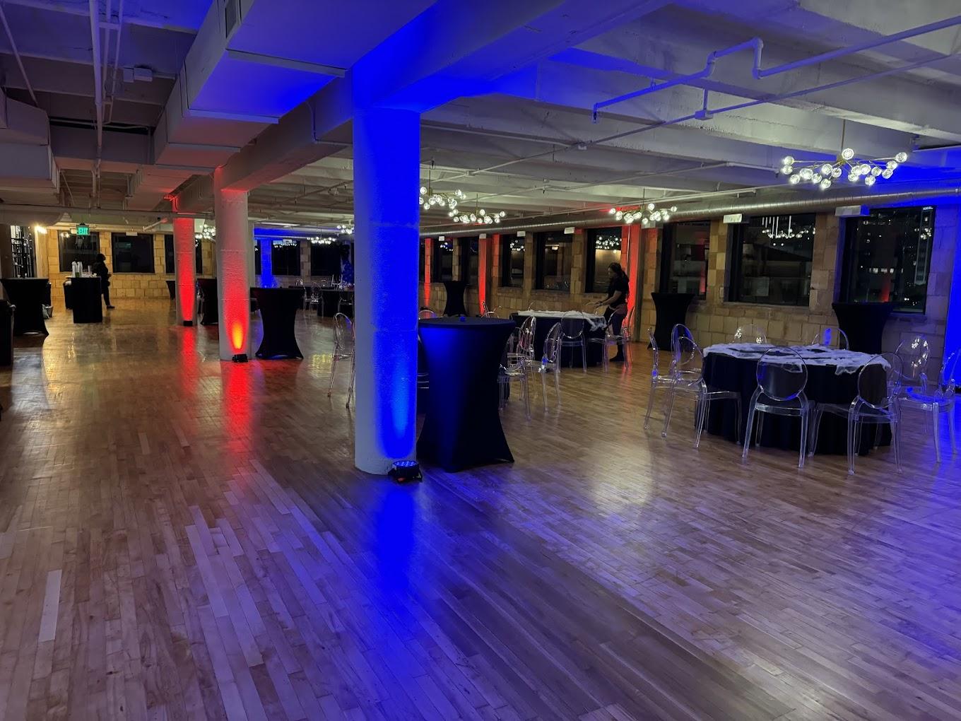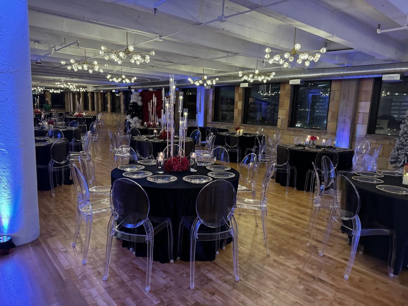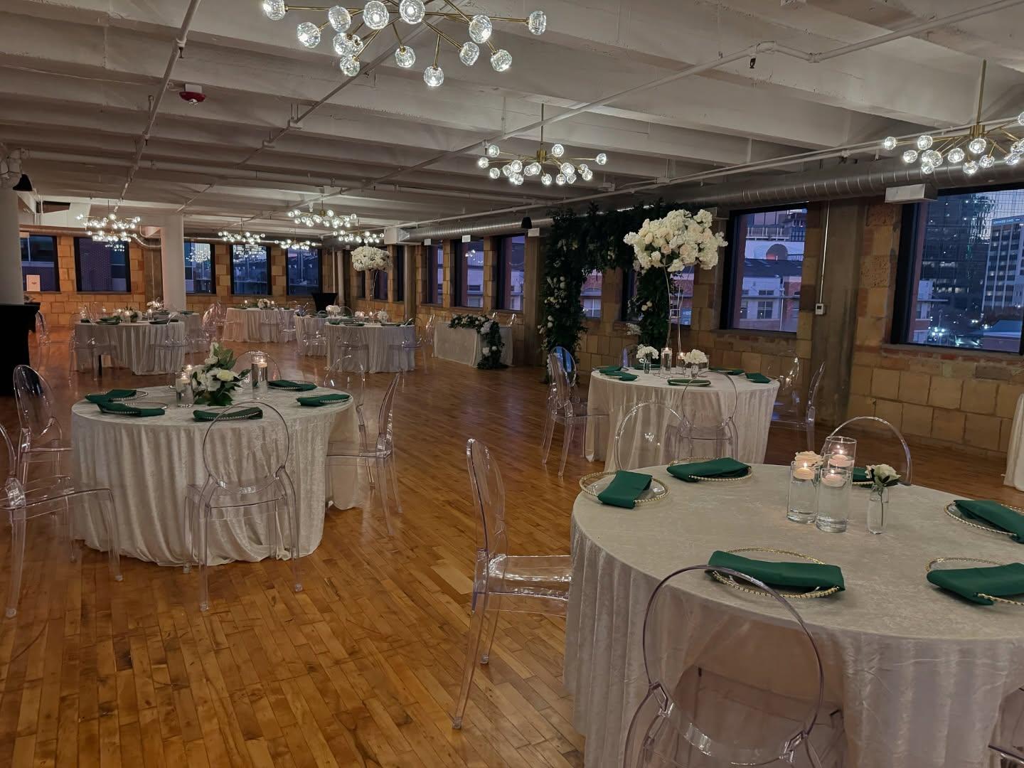 Amenities & Add-ons: • 160 clear ghost chairs • 60in round tables • Rectangular tables • Prep Kitchen • 4 easels • Bluetooth sound system • Uplighting • Event Day Concierge • Secure Parking