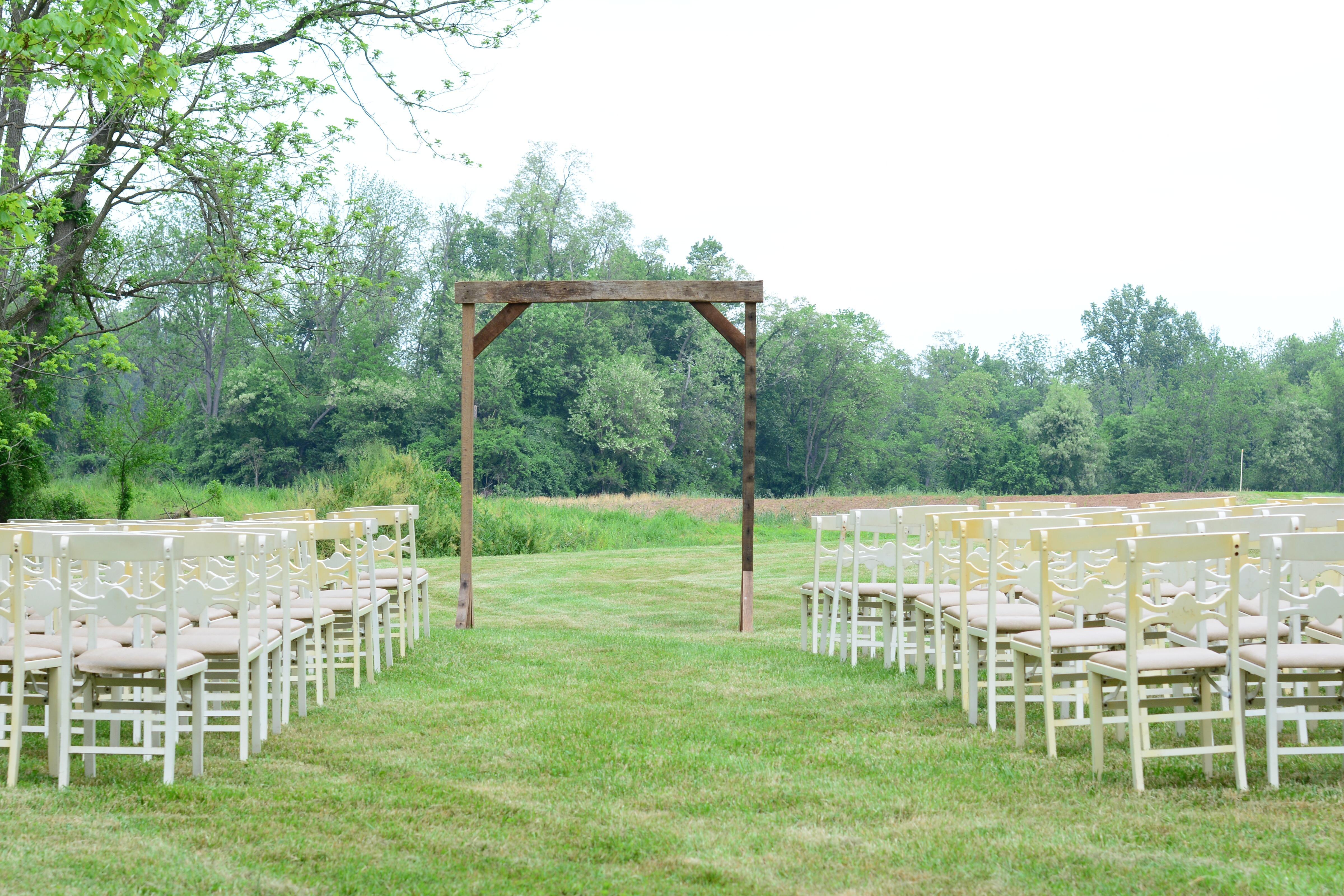 Included with the space is a rustic wooden arch, 200 antique white wooden folding chairs, multiple prop options for ceremony decor. If space is being used for cocktail hour we have whiskey barrels and rustic bar top table options.