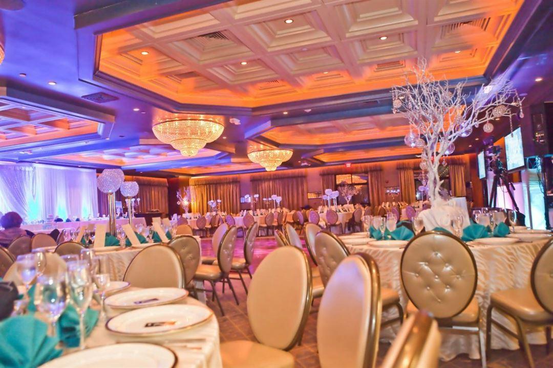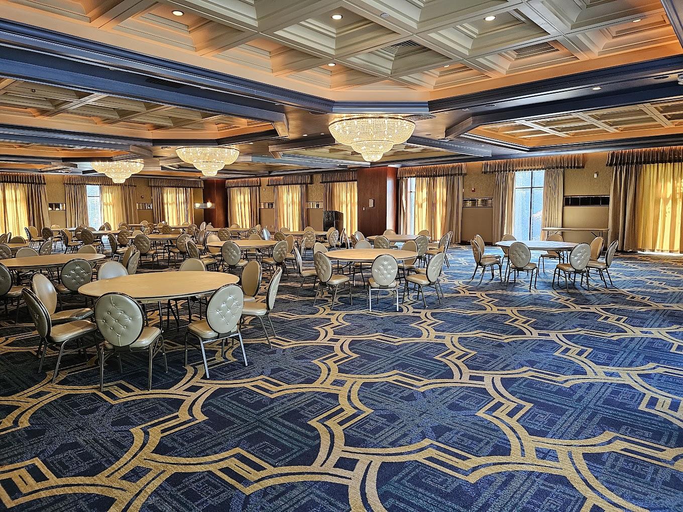 Optimal viewing stage for presentation- Palladian windows with terrace garden view- Diamond crystal-style chandeliers- Deeply coffered ceiling with rich blue accenting