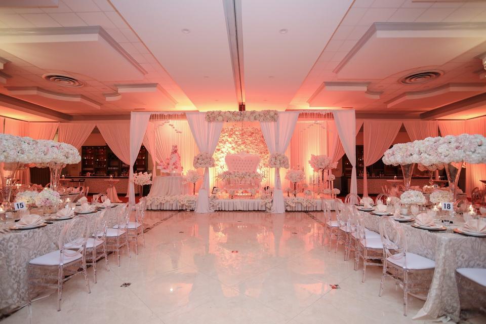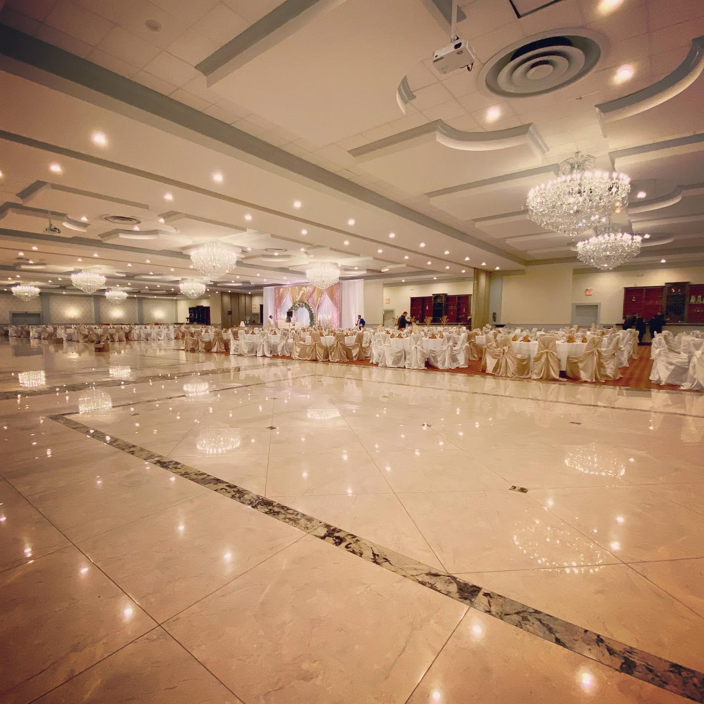 The expansive banquet hall of the Imperial house can accommodate up to 1,200 guests. For smaller wedding events, the venue can use one of four hall separators to adjust for the appropriate space, creating a private feel to this large space. The detailed ceiling architecture and brilliant chandeliers add a stunning look – a perfect setting for dining, dancing and taking memorable pictures. The venue offers a classic décor that is easily personalized to each and every couple that uses the space. Following a delicious meal and great conversation with your guests, step onto the large marble dance floor. You and your guests will enjoy dancing the night away with enough space to move in comfort.