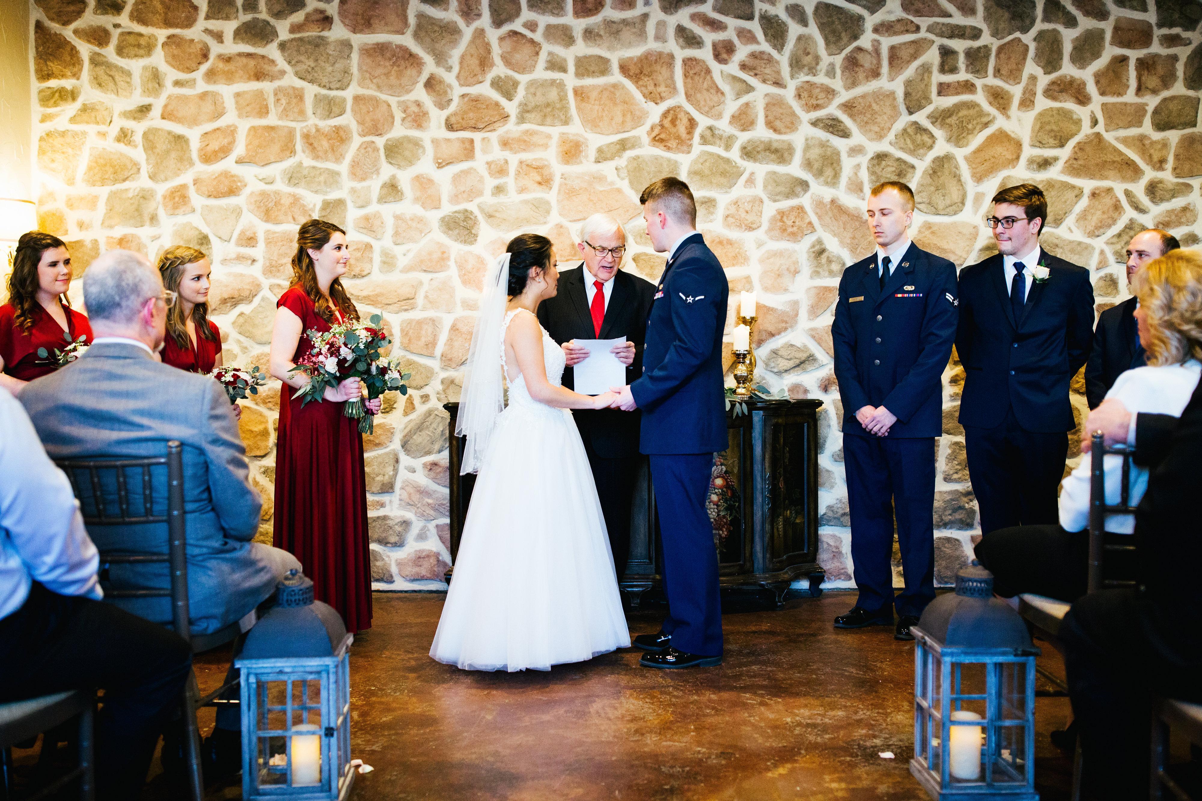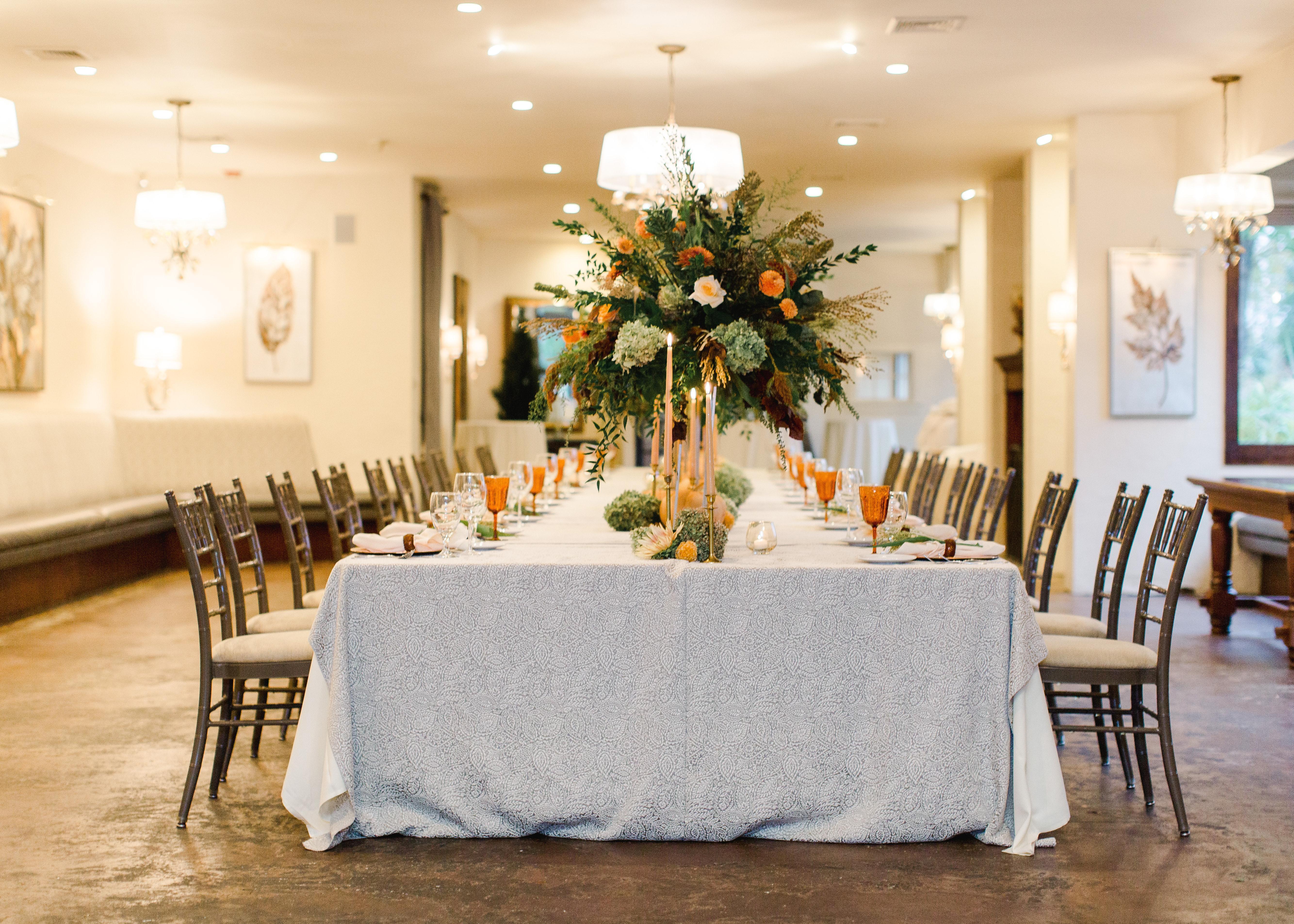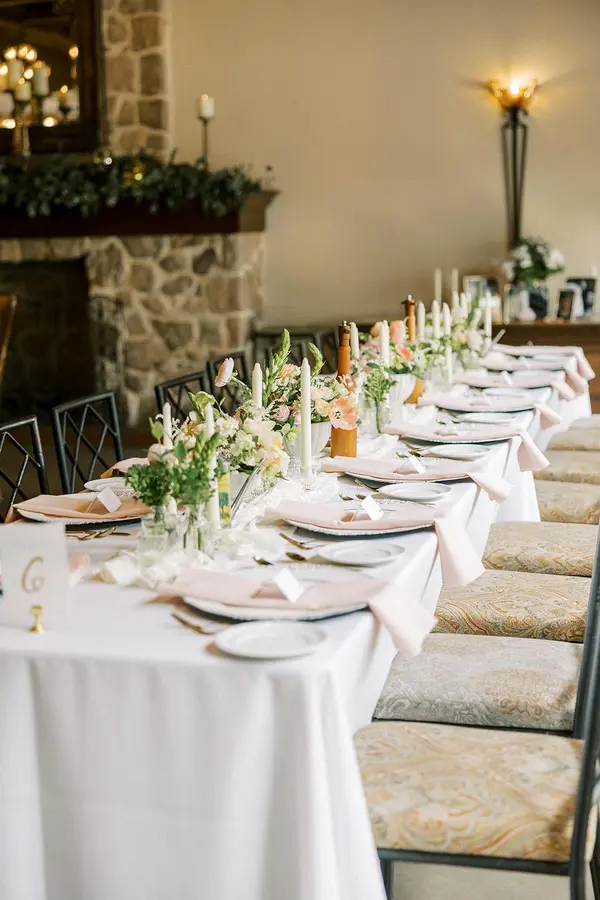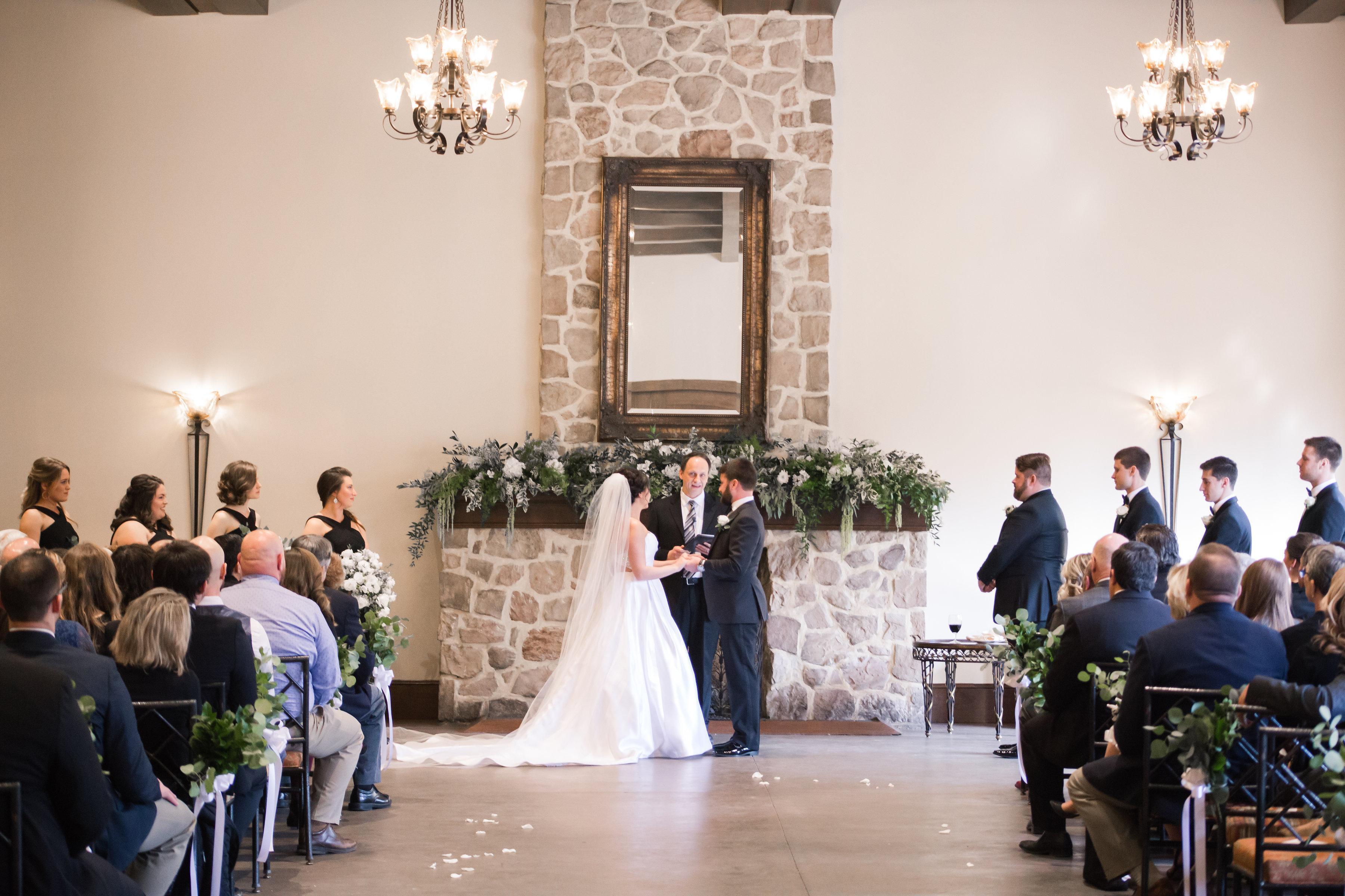 Round and/or rectangular tables - Custom linen options - Chiavari-style chairs - Reception venue with adjoining cocktail hour space - Ceremony with a fireplace backdrop - Wedding loft