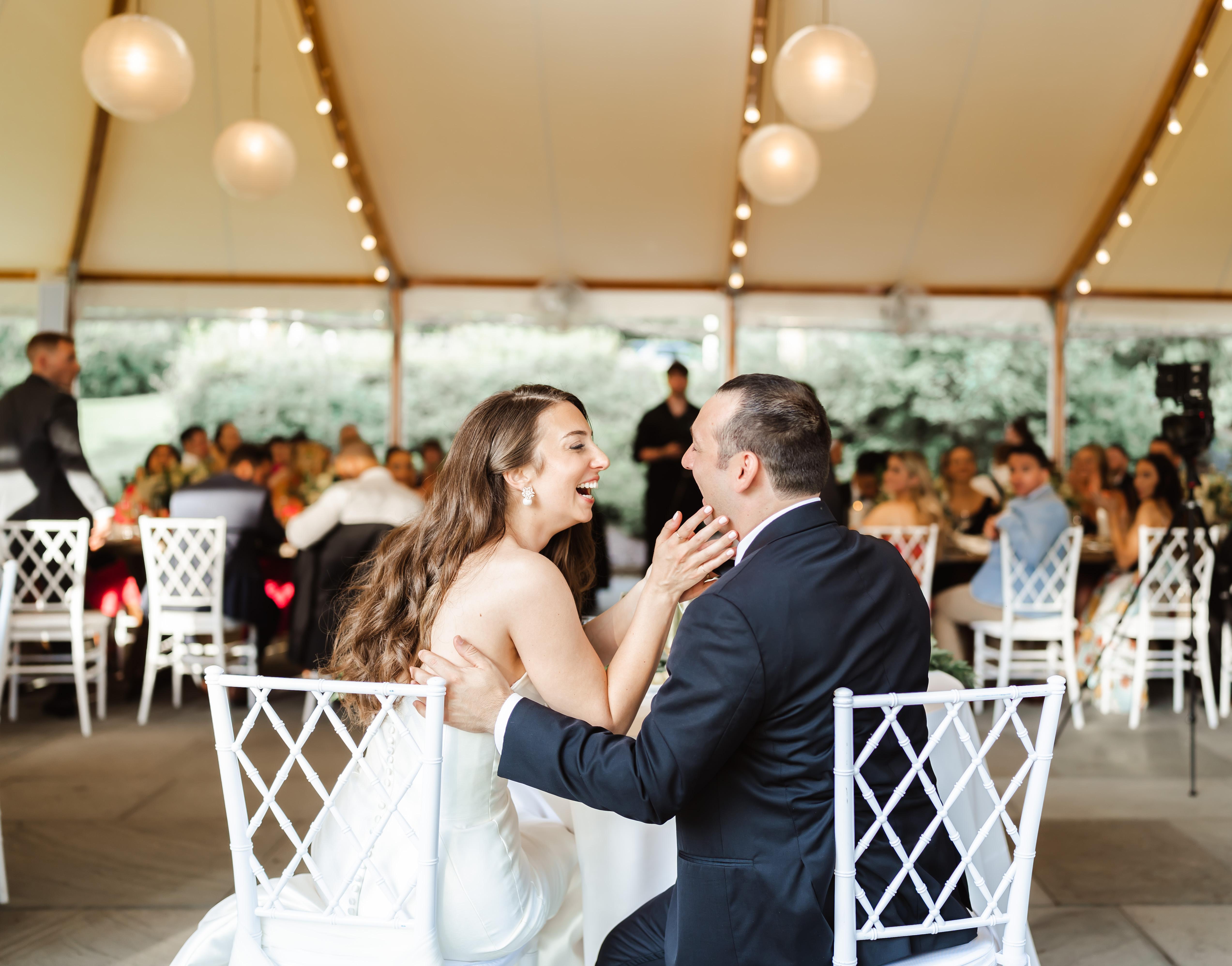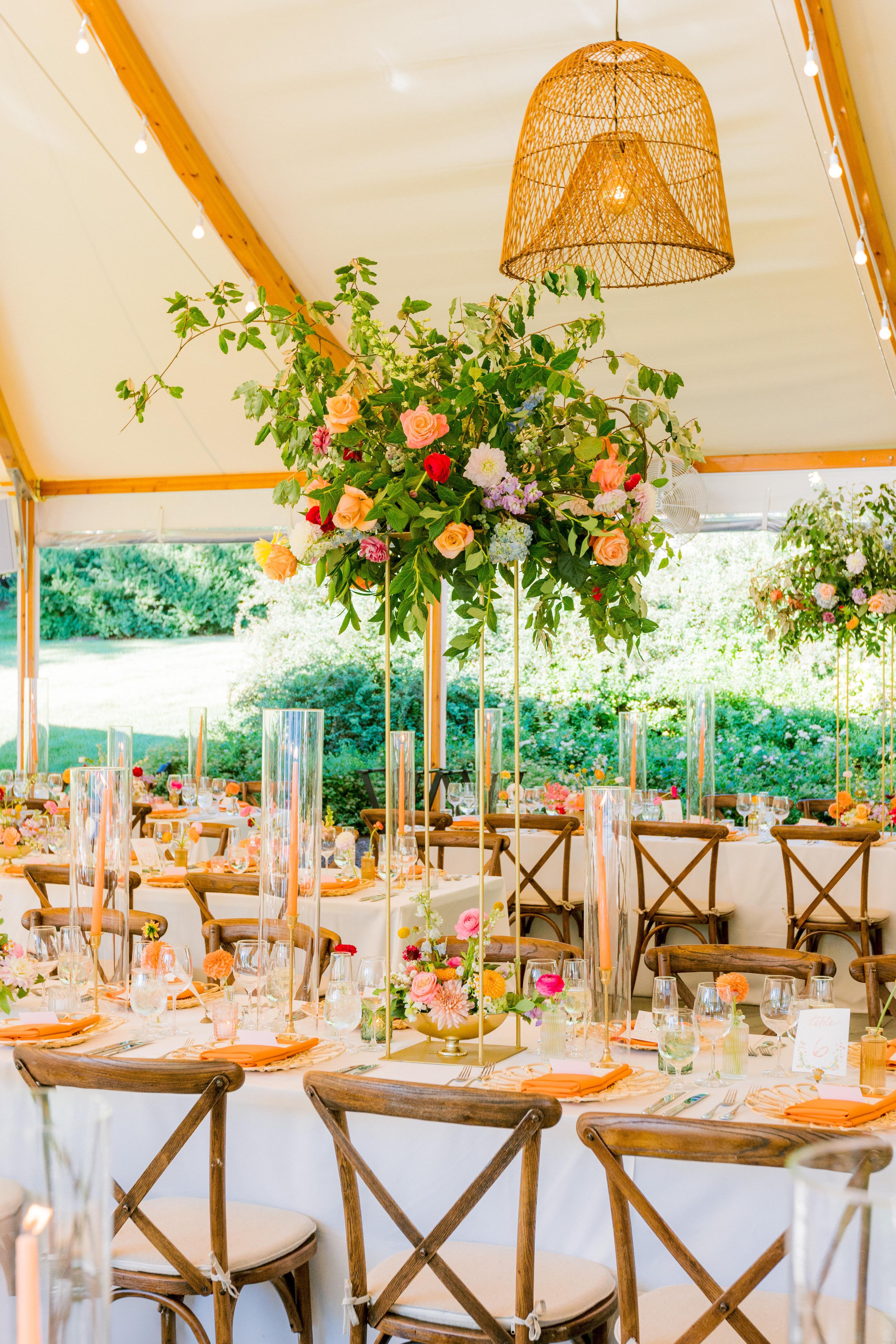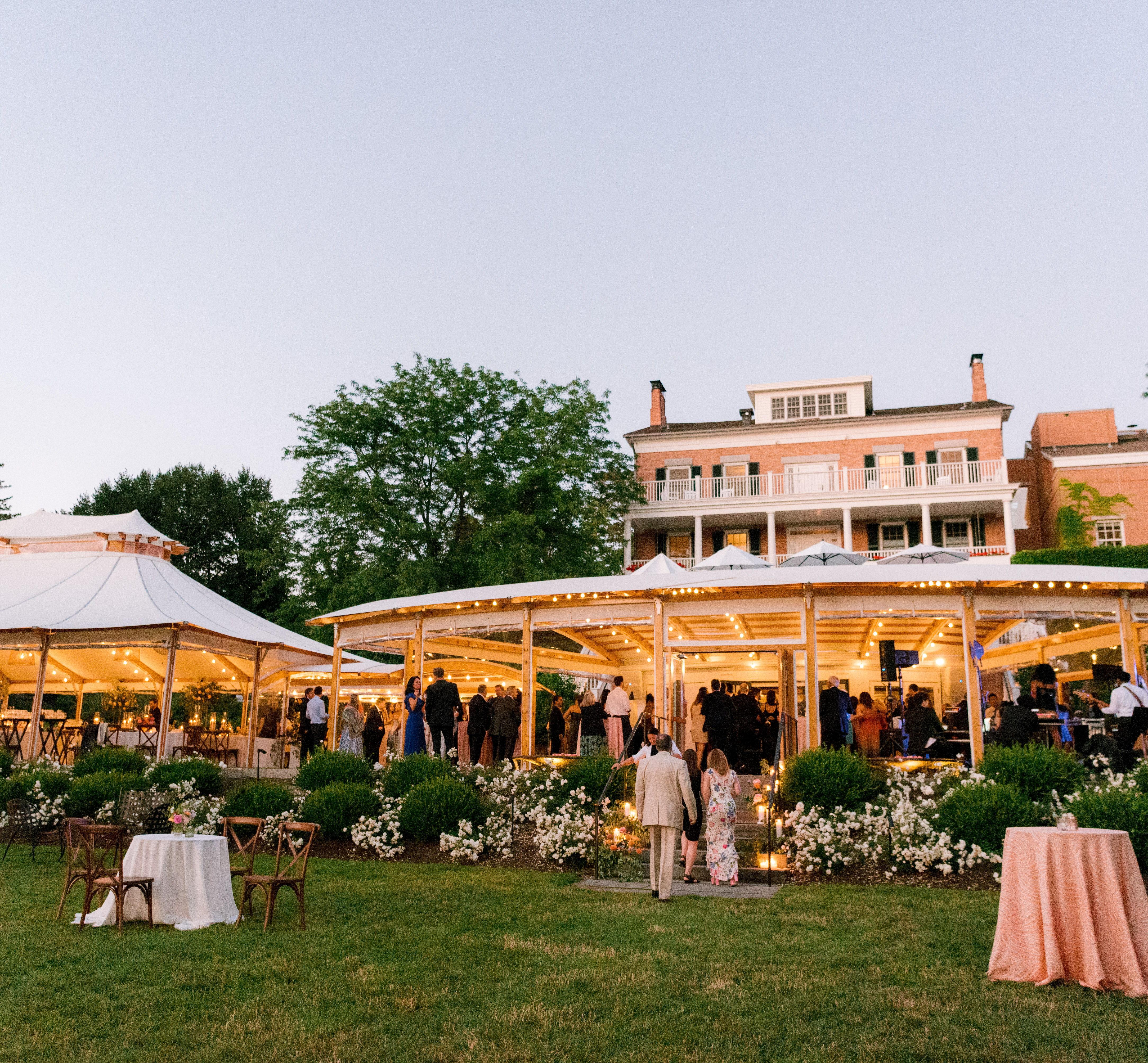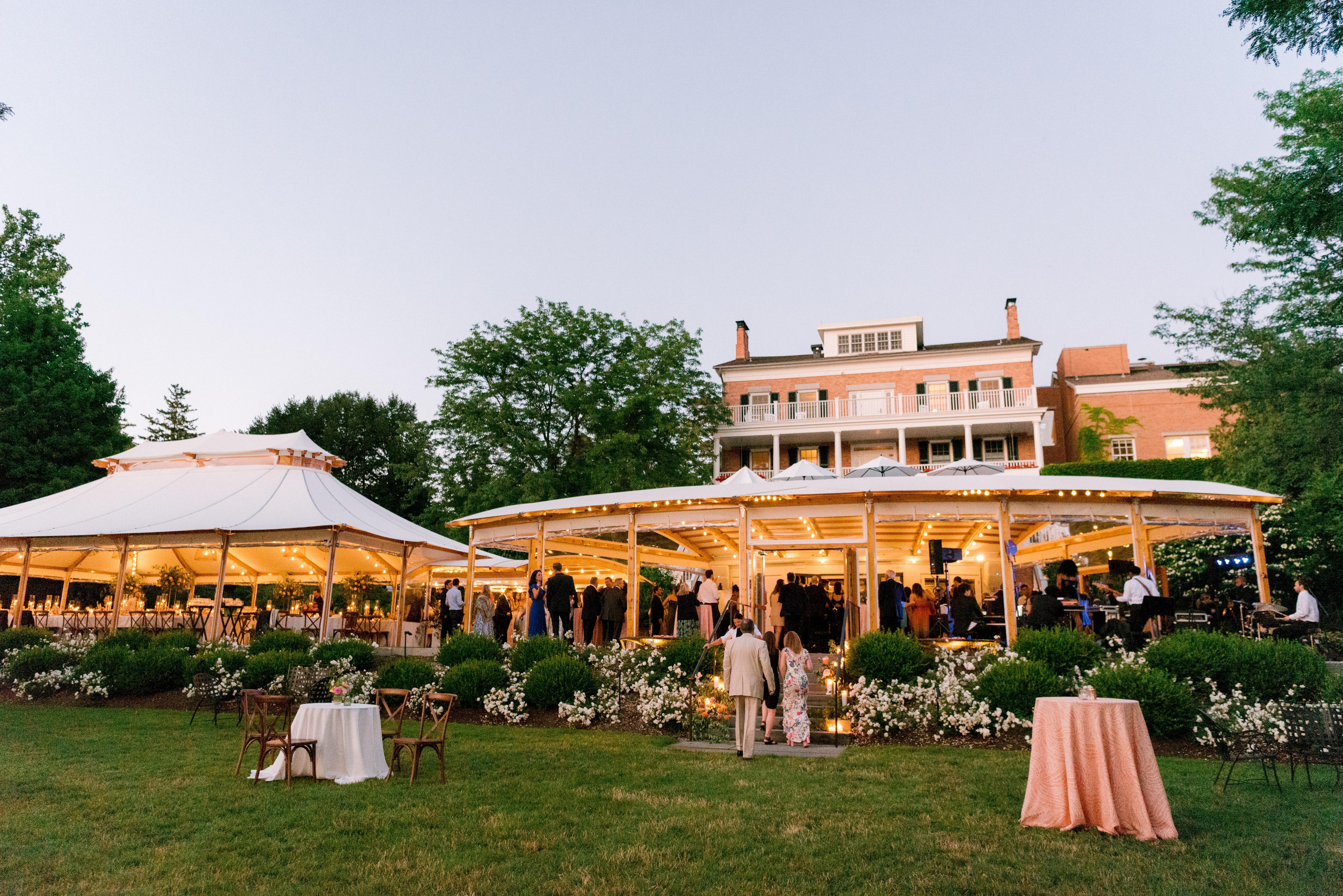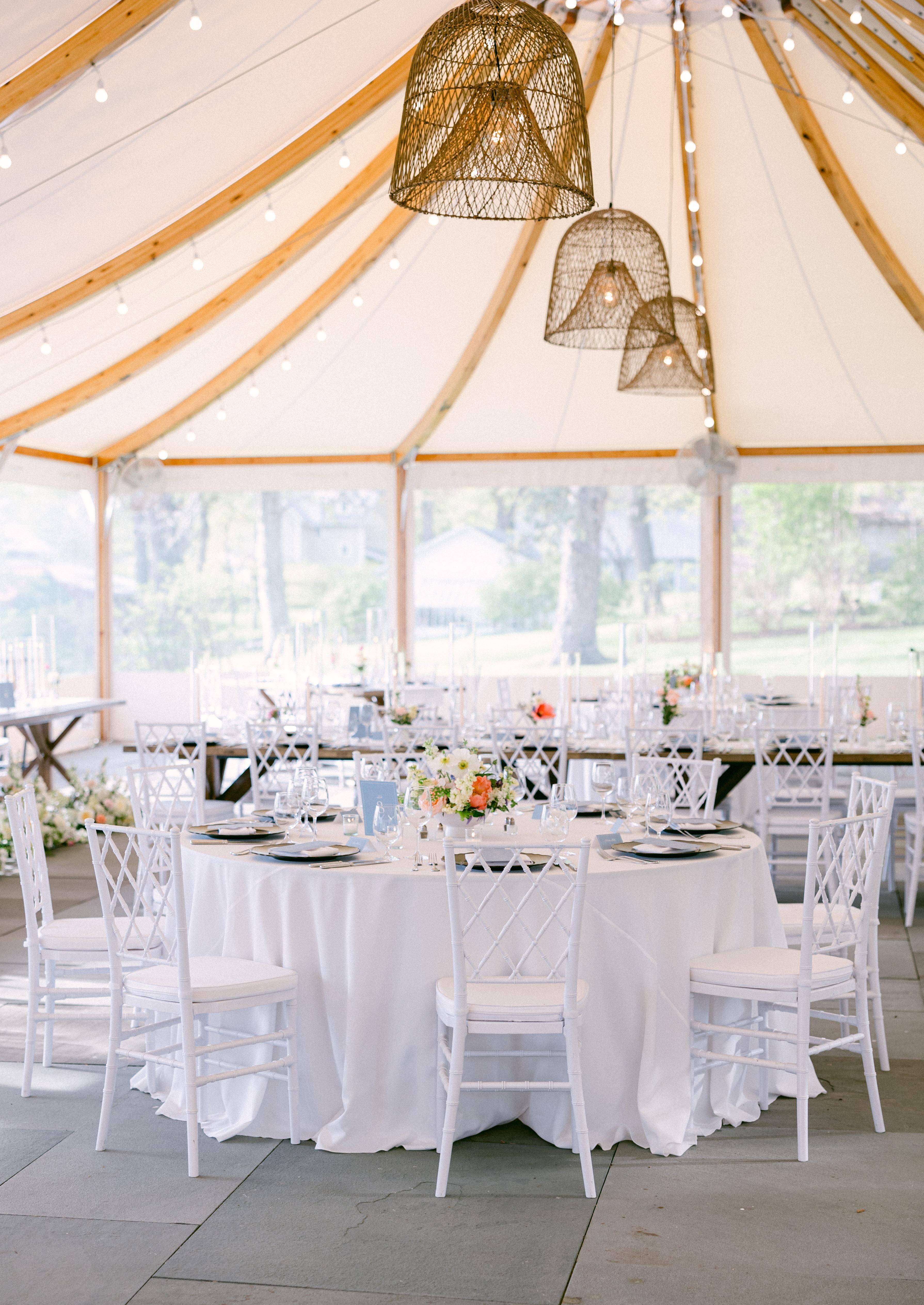 Soaring white tents help ensure that guests will enjoy our lakeside location regardless of the weather - Fire pit on the shore - Cathedral ceiling with chandeliers Peak weddings start at $50,000.