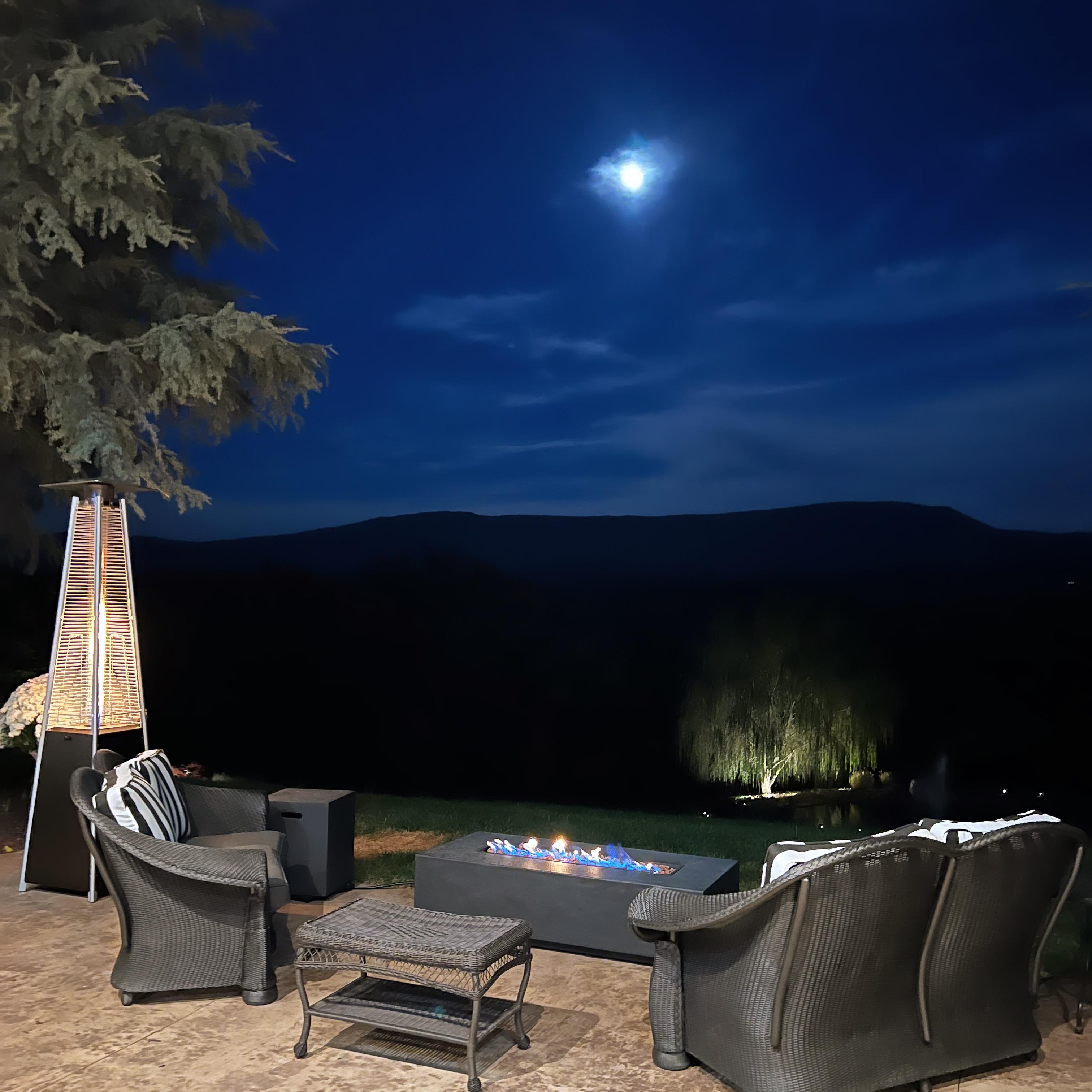 Enjoy cocktail hour on the expansive stamped concrete terrace overlooking the gorgeous Blue Ridge Mountains! Firepit and patio heaters are available for chilly weather.
