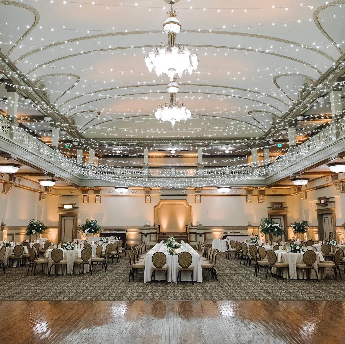 Lit by the magnificent original chandeliers, the balcony overlooking the ballroom is perfect for your grand staircase entrance, continuing thru the ballroom & your adoring guests, take your first swirl on the 27x27 hardwood dance floor.
