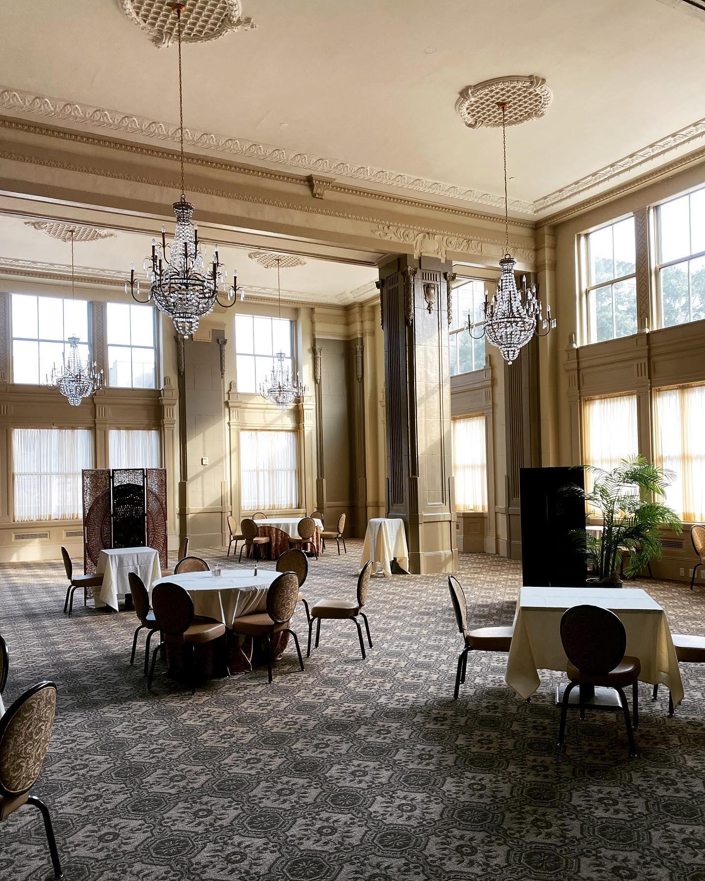 Special Features: 30' windows, 9 vintage crystal chandeliers, and incredible detailed architectural moldings, non-permanent dance floor available and included