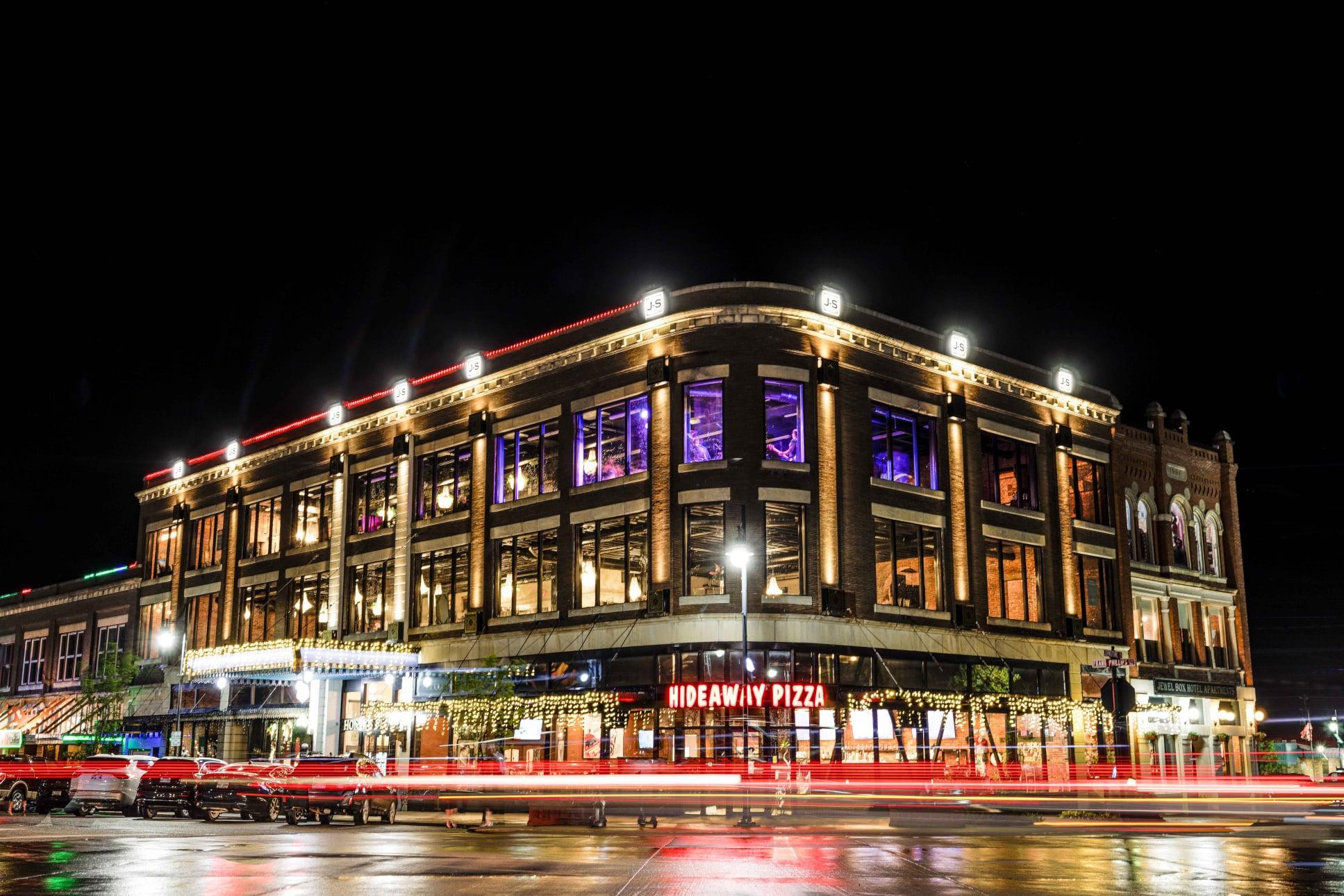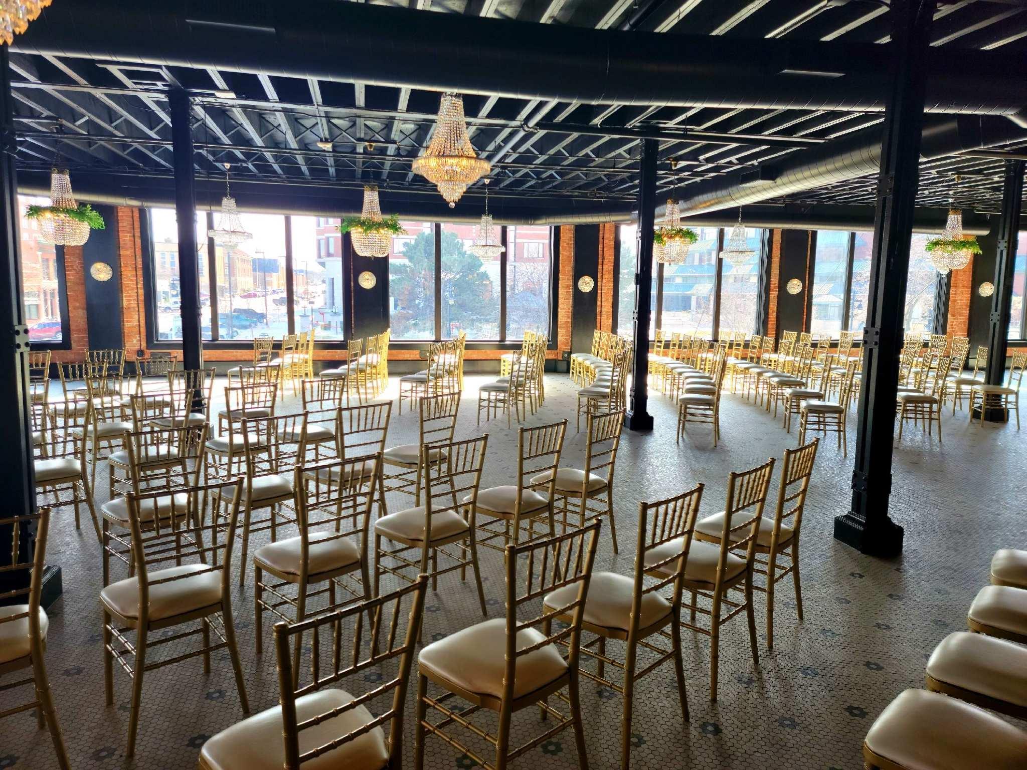 This space features a beautiful view of downtown Bartlesville. Both floors are decorated with crystal chandeliers, black and white tiled floors, and original brick walls.