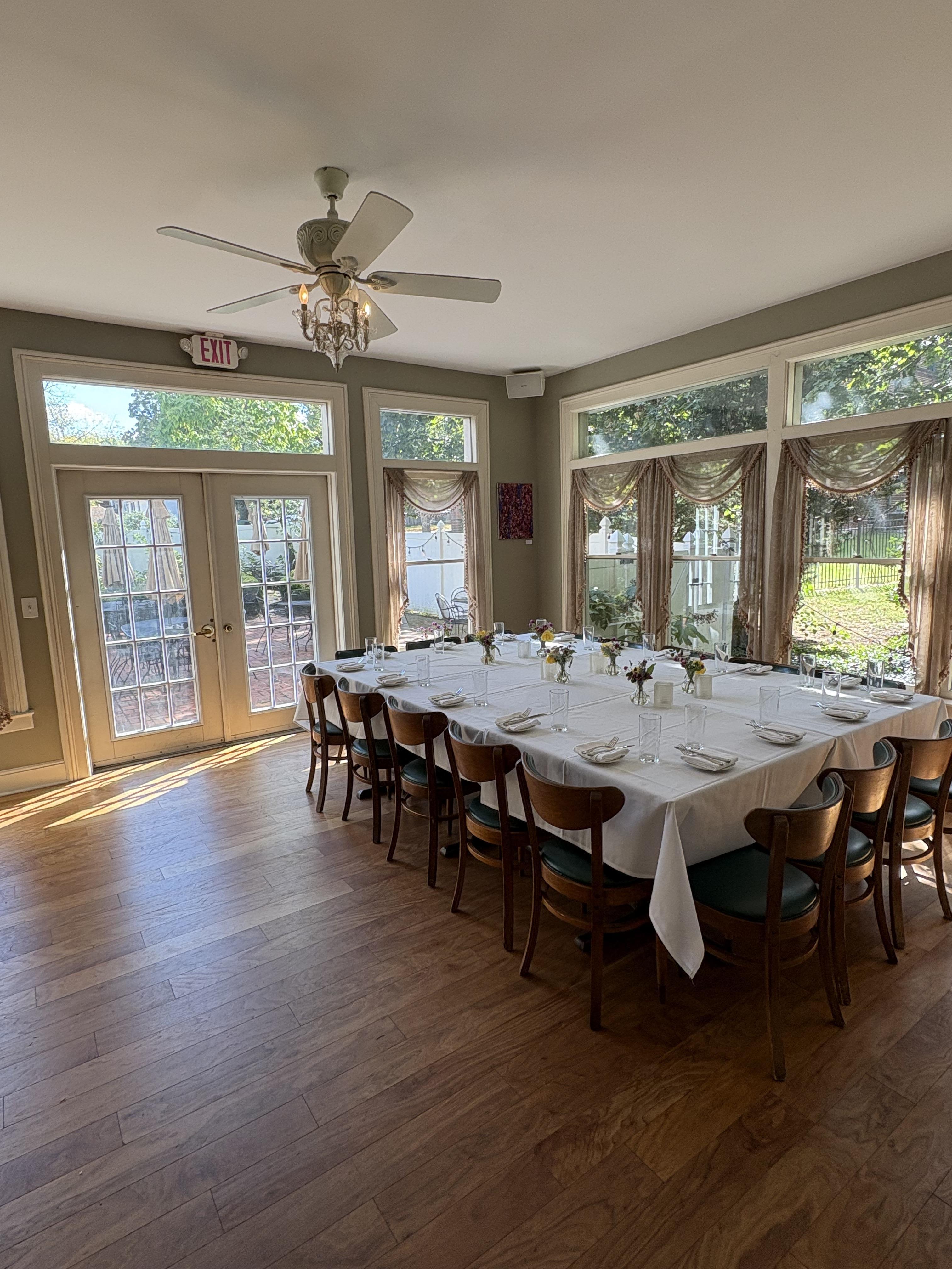 - Privacy to enjoy your special day without any uninvited guests nearby - View of our back patio & lush chef's garden - Cocktail hour post-ceremony - Many large windows - Tables, chairs, and linens - Highly trained waitstaff - Option to add exclusive use of our patio for an additional $1000.