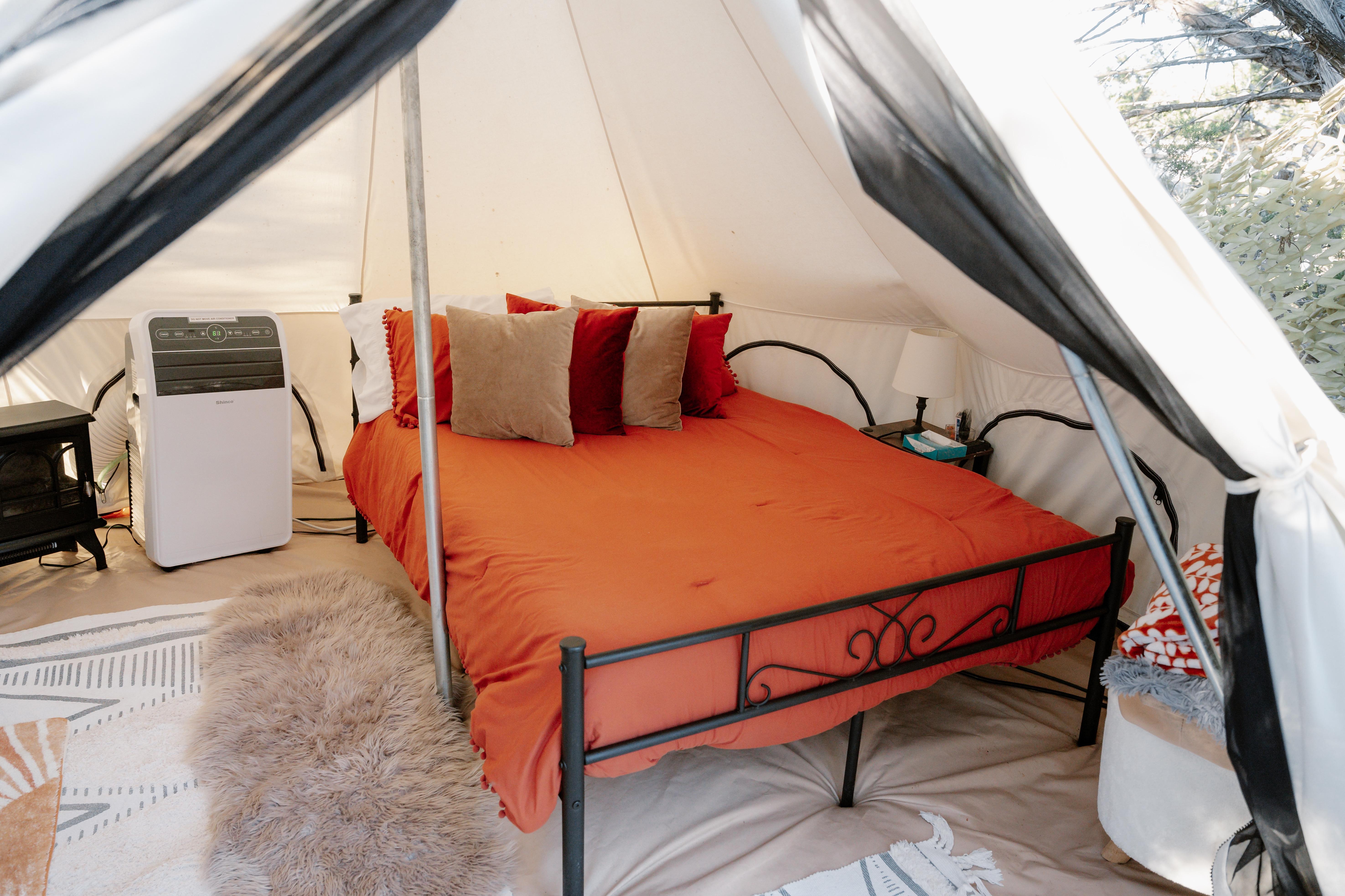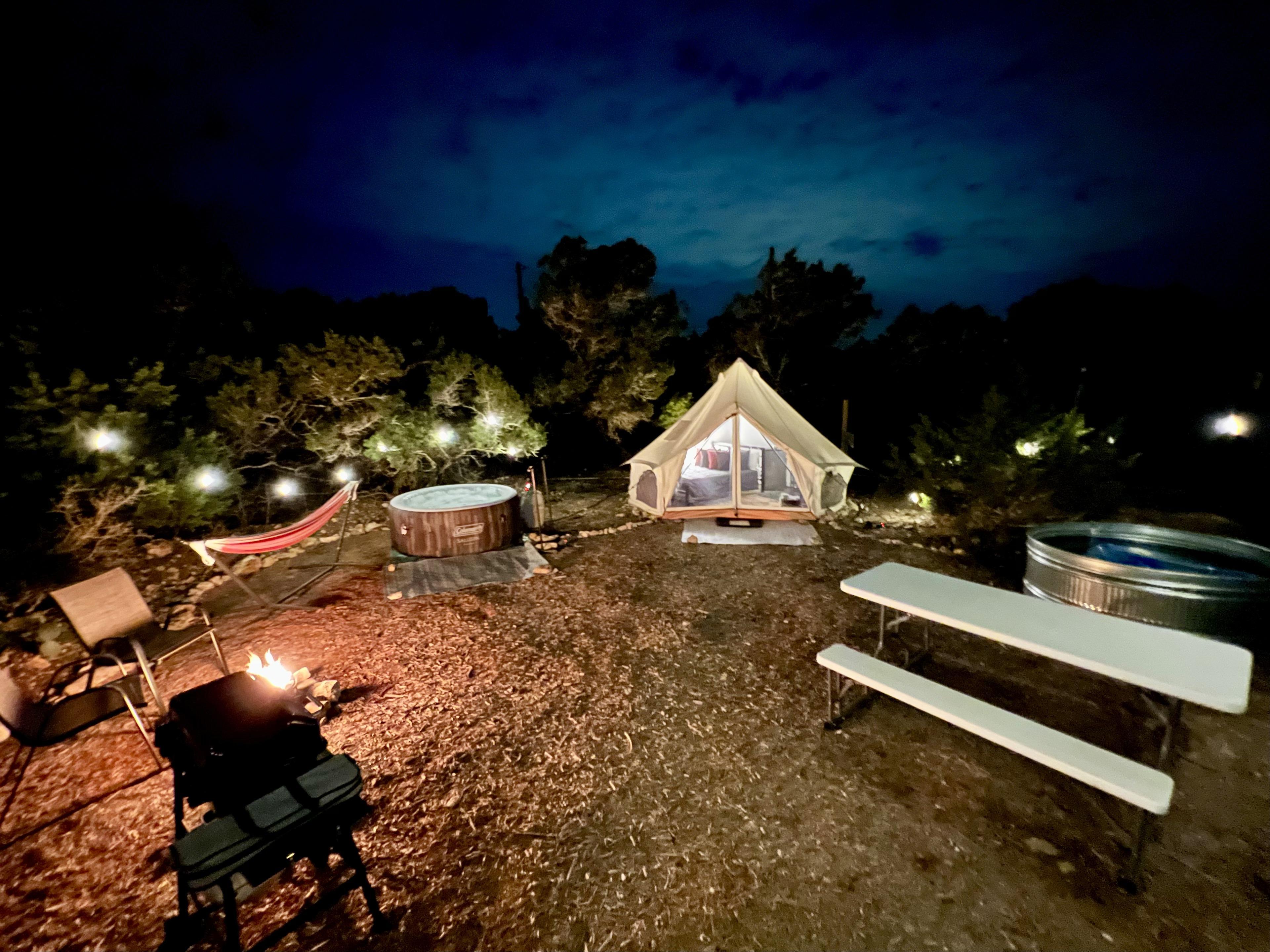 Facility rental includes the two nights in our six luxurious bell tents (up to 12 guests). Every glampsite is tucked away in the juniper trees for privacy, featuring its very own hot tub, hammock, fire pit and grill. Our unique and trendy canvas tents include all of the amenities of home, including a cozy bed, mini refrigerator, coffee maker, heat and A/C, and all of the essentials. (P.S., There's no need to worry about the weather! Our tents are 100% waterproof and anchored into the bedrock.)