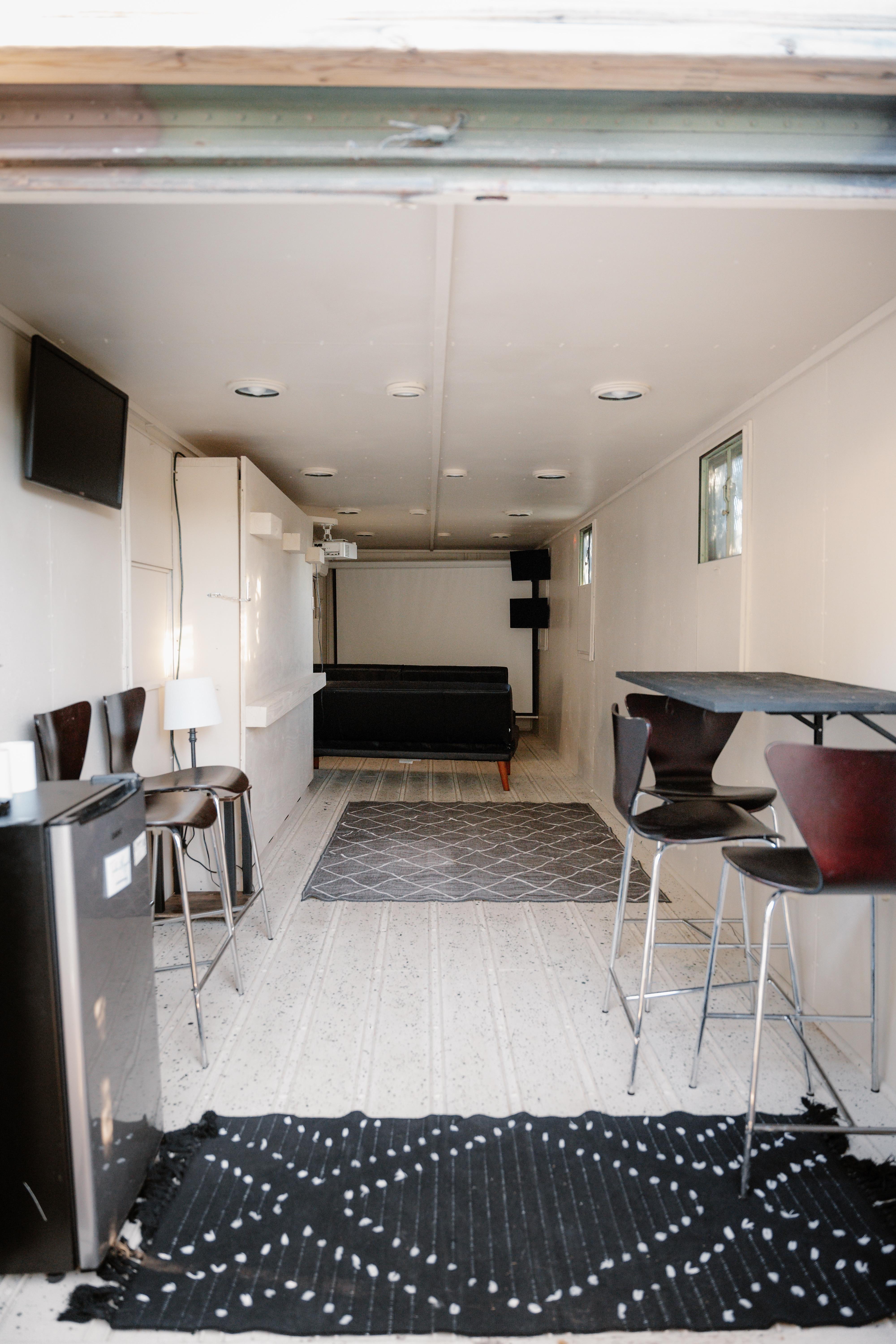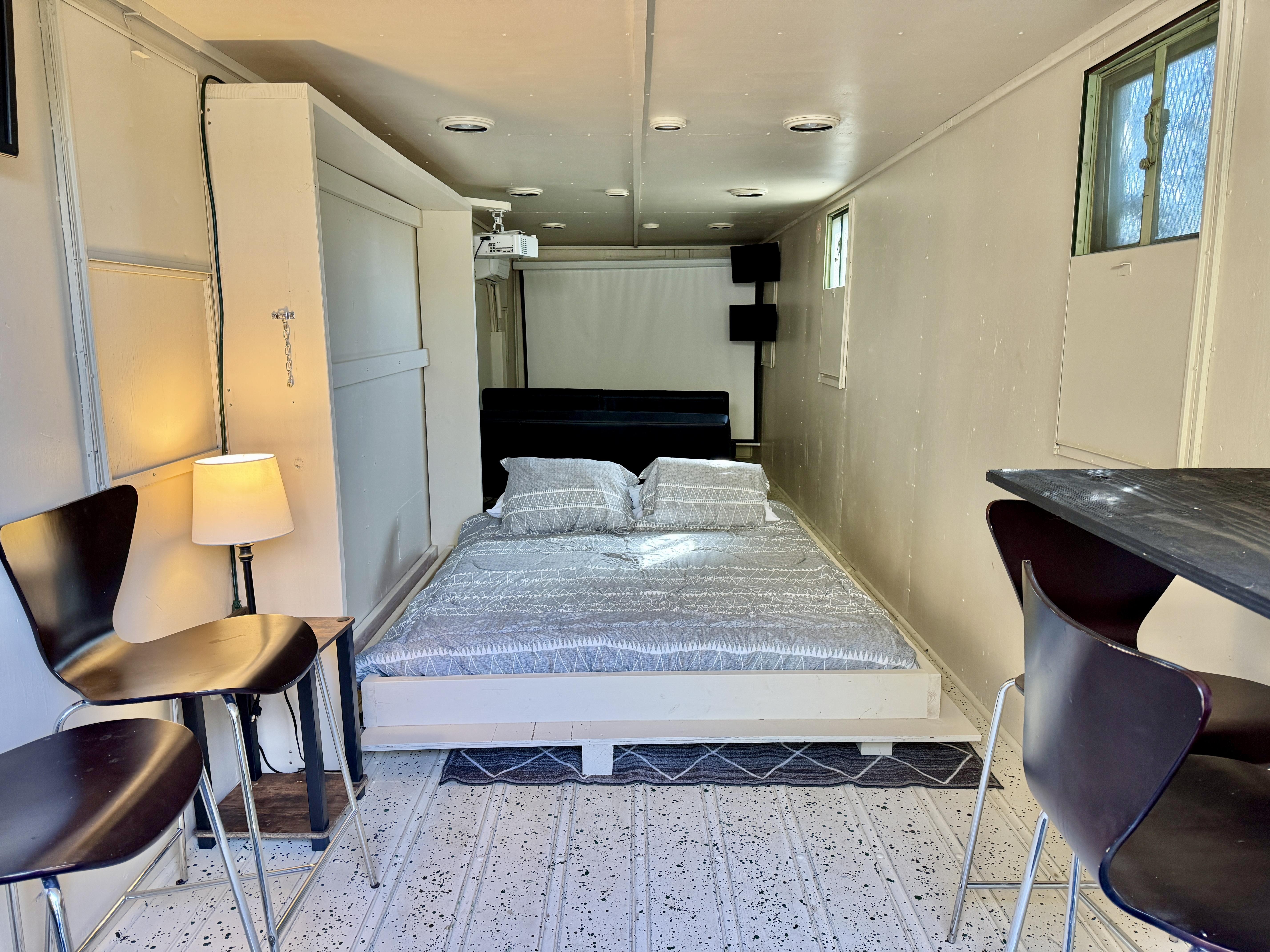 - Projectors and 100" projector screen - Three additional TV screens for streaming or gaming - WiFi - Mini refrigerator - Queen-size Murphy bed - Two futons that fold into beds - Outdoor hot tub and fire pit