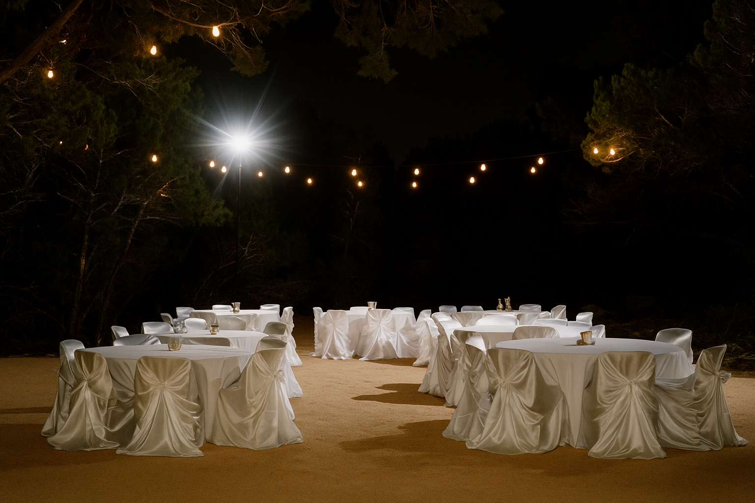 - Tables and chairs for up to 100 people - Bar space - Dedicated ceremony site and seating - Optional sound equipment - Table and chair linens - Set up - String lighting