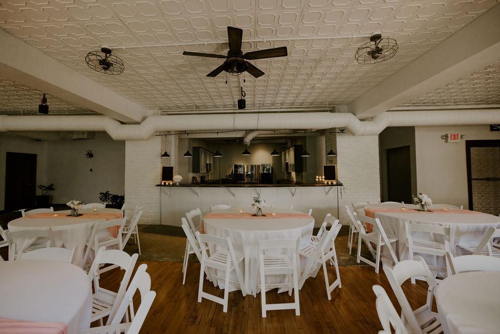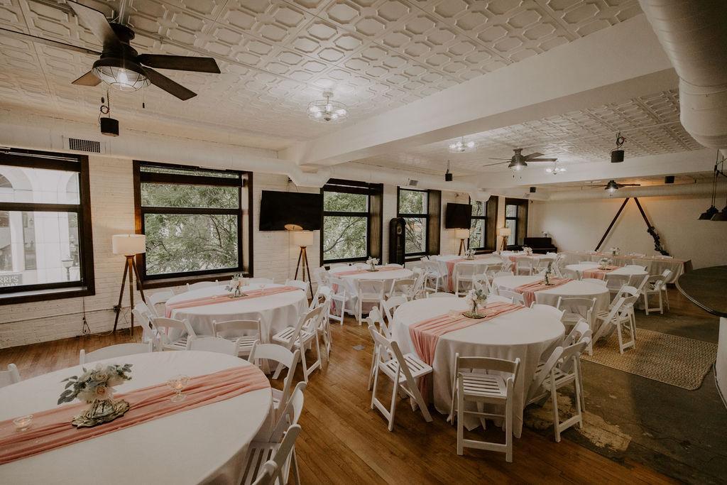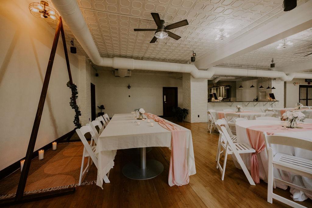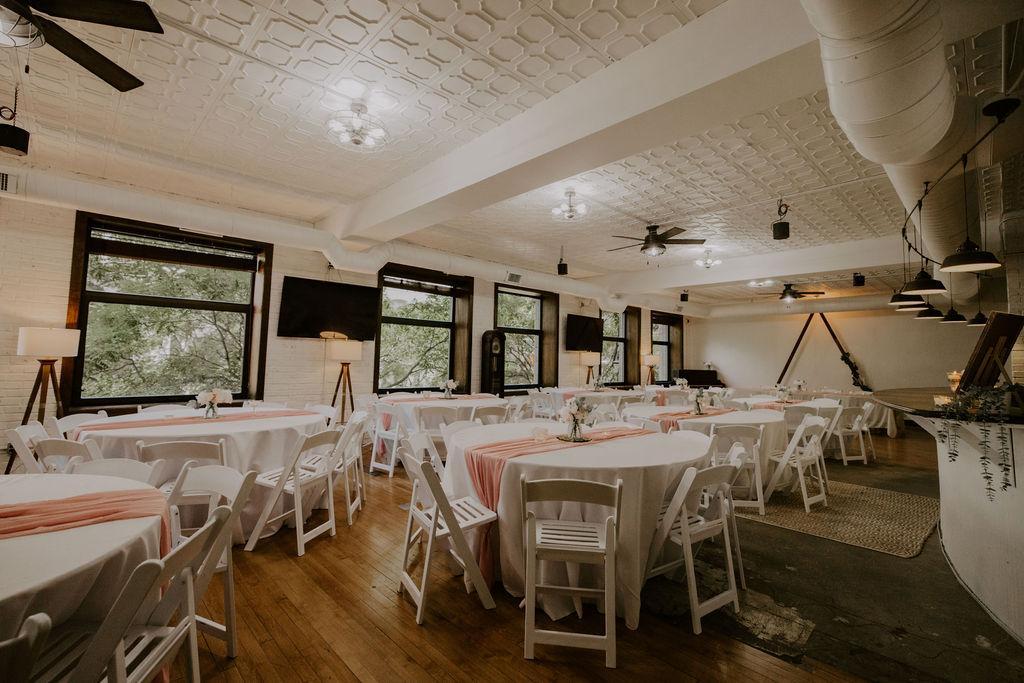 The Kalamazoo Loft, can host a range of nuptial events, including wedding showers, rehearsal dinners, and engagement parties. Whether your celebration is an intimate affair or a large gathering of up to 100 guests, this venue can accommodate it. You will be able to tailor this loft to fit your desired vision. It boasts a minimalistic yet stylish decor with light-colored flooring and walls, perfect for any wedding theme.