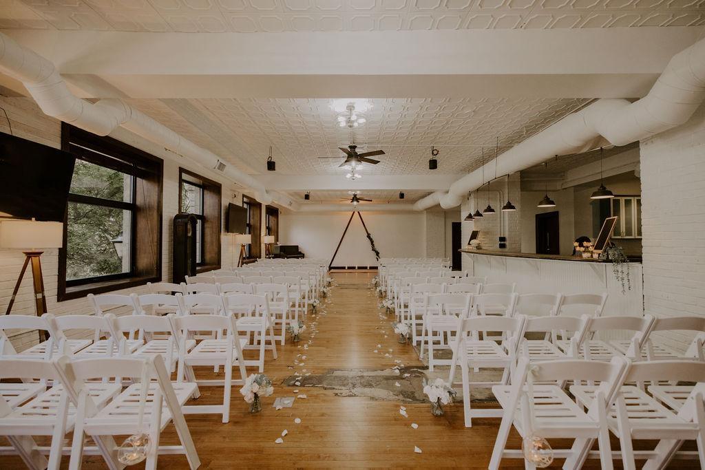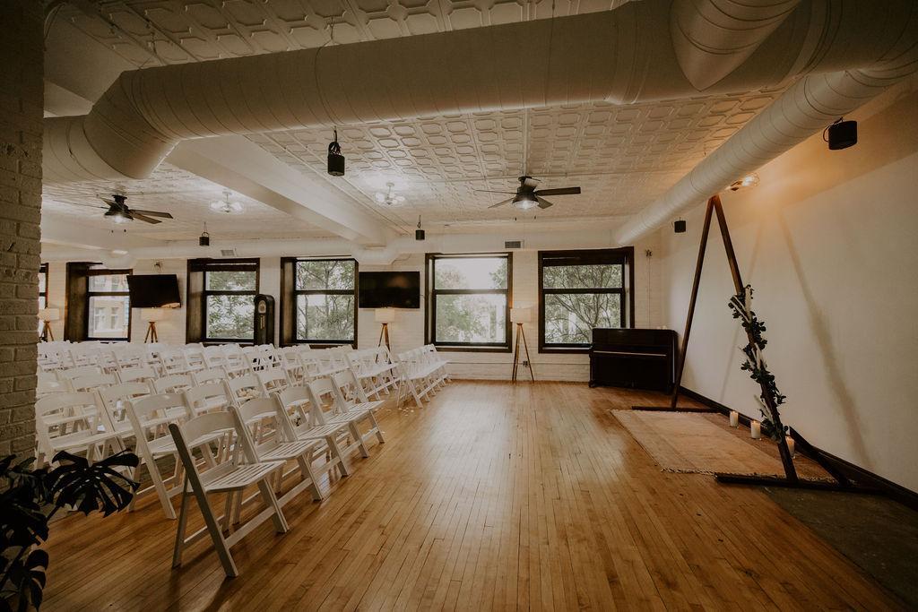 The Kalamazoo Loft is a warm and inviting wedding venue. Situated in the city's downtown area, this property is on the second floor of the famous historic Kalamazoo Building. With a lovely event space, groom and bride themed ready rooms and friendly staff, you and your guests will surely have a great time celebrating! Facilities and Capacity Besides ceremonies and receptions, at The Kalamazoo Loft, you can host a range of nuptial events, including wedding showers, rehearsal dinners, and engagement parties. Whether your celebration is an intimate affair or a large gathering of up to 115 guests, this venue can accommodate it. With over 5,000 square feet of versatile event space, you will be able to tailor this loft to fit your desired vision. It boasts a minimalistic yet stylish decor with light-colored flooring and walls, perfect for any wedding theme. The property also features a bar where loved ones can get their refreshing drinks, as well as a kitchen area for caterers.
