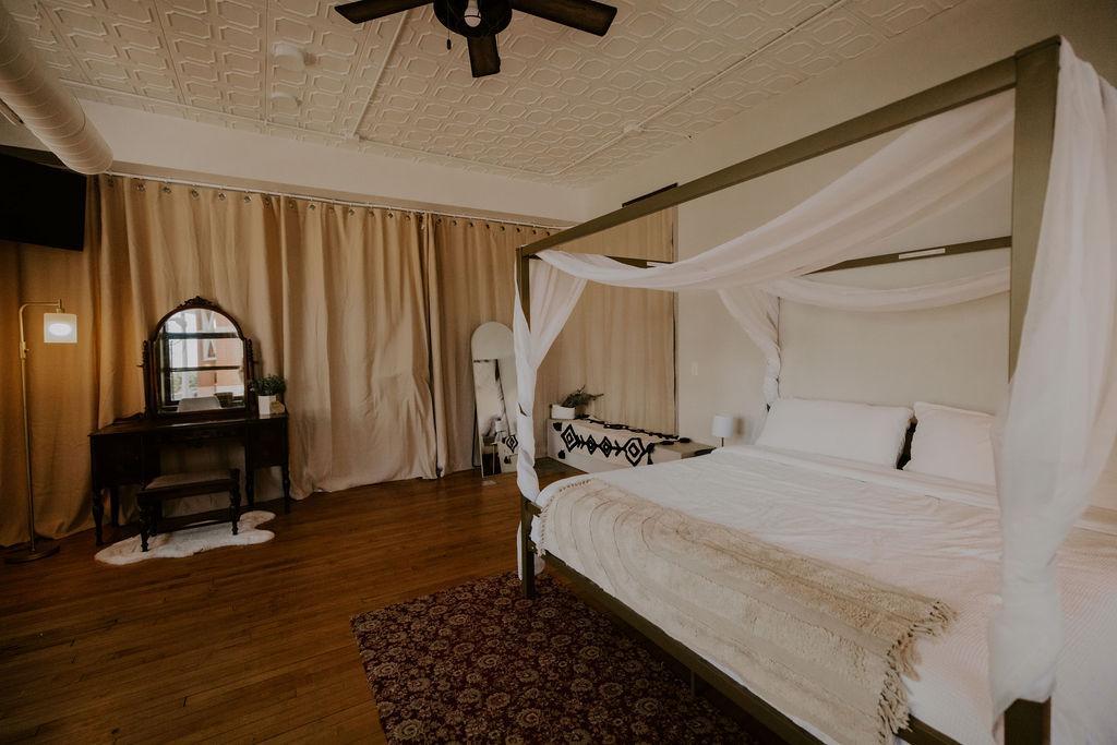 Get ready for your big day with a glass of champagne while you get your hair done in this beautiful bride themed room with space enough for your bridesmaids and attendants.