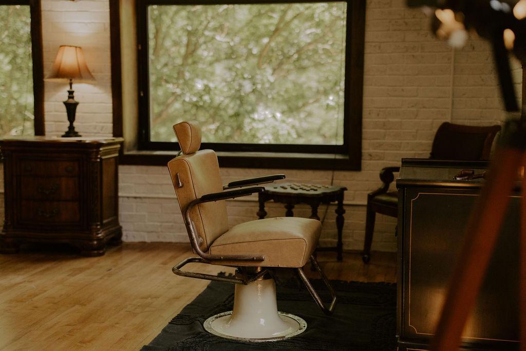 Large Groom Getting Ready Room with a smart tv, antique barber chair and even a checkers board. Get ready for your big day in style and comfort!