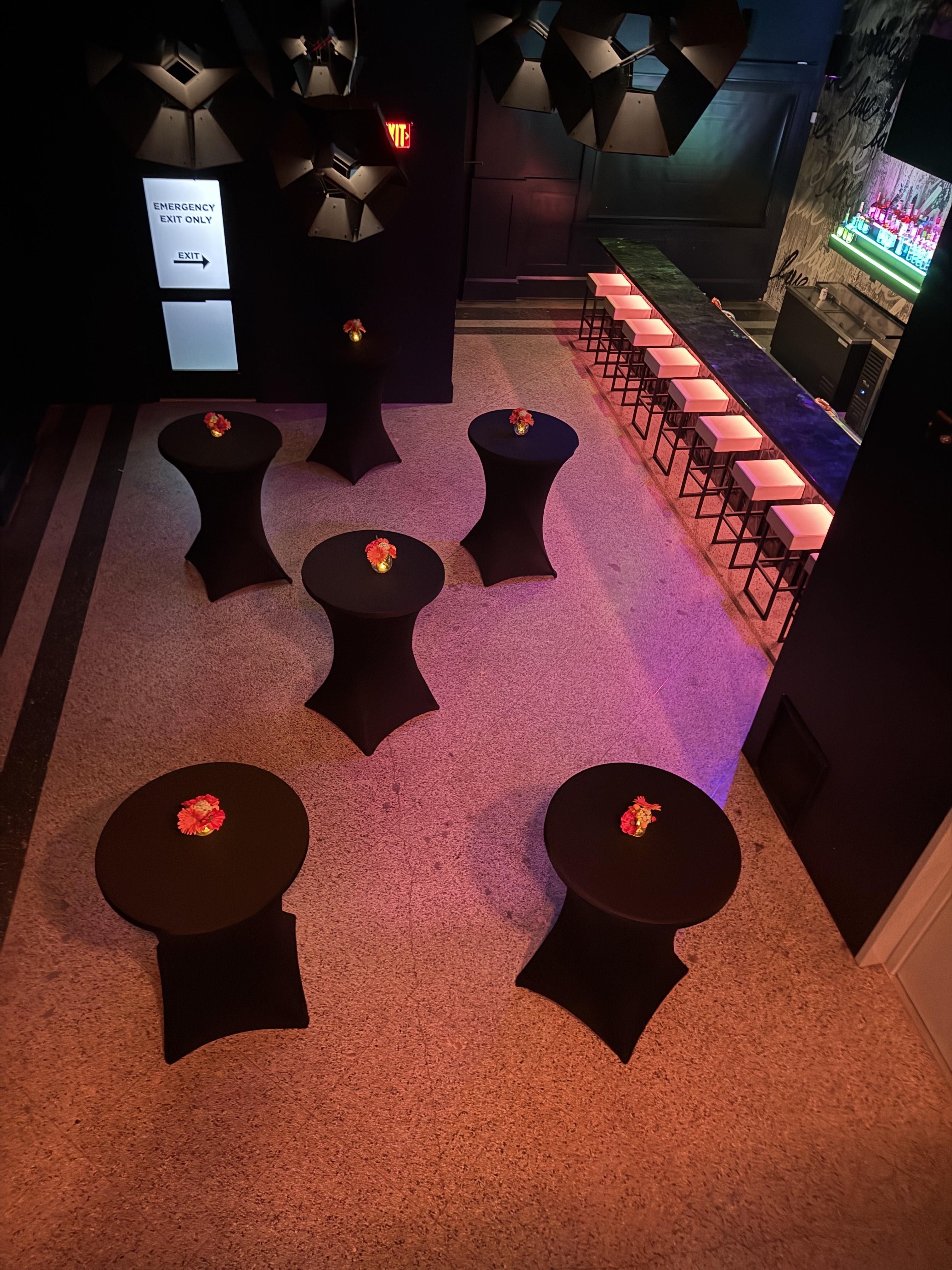 -Tables/chairs/linens included up to 120 people seated (additional can be rented) -bartenders included -lighting scheme and visuals specifically catered to your event -microphone available