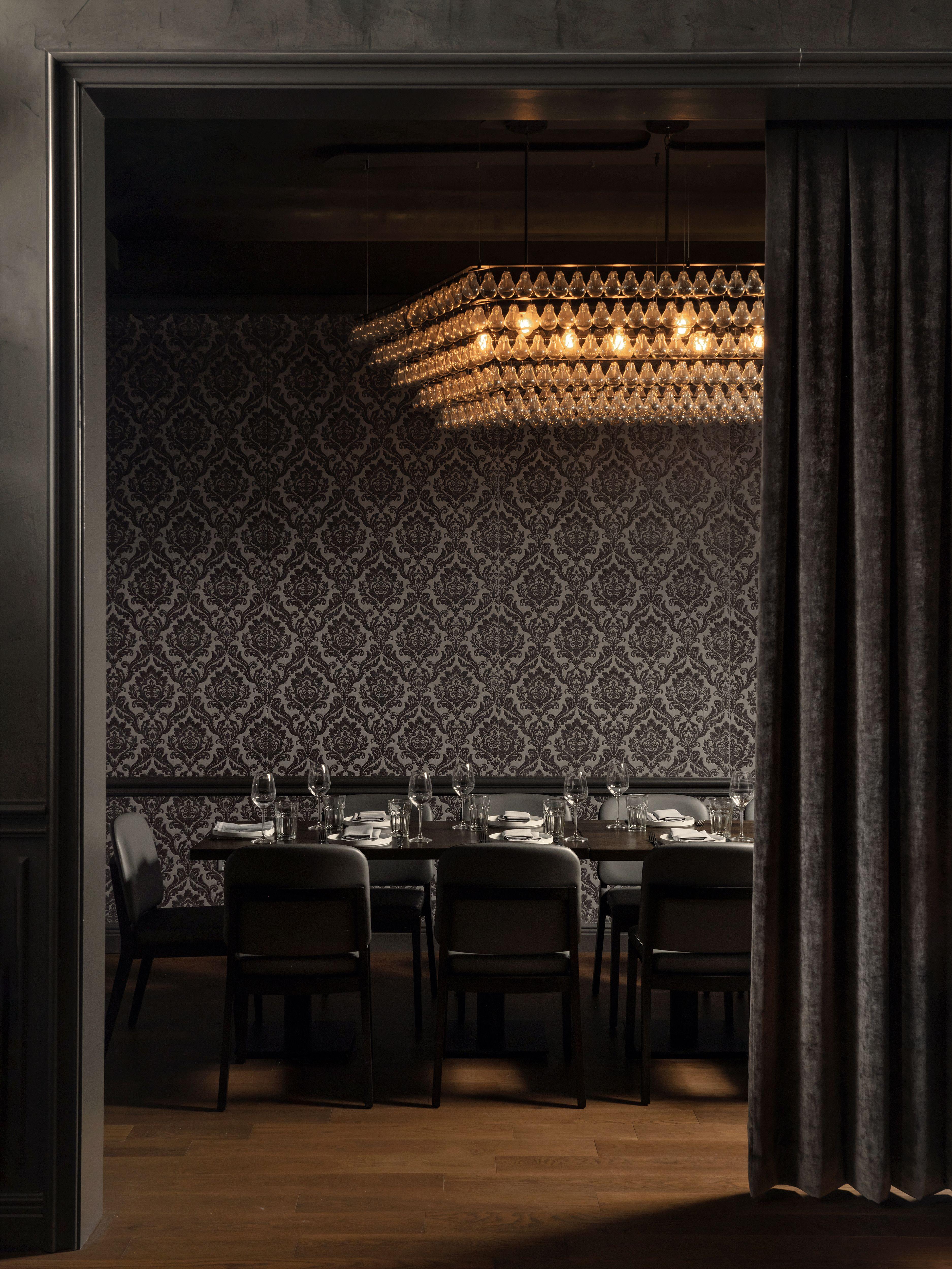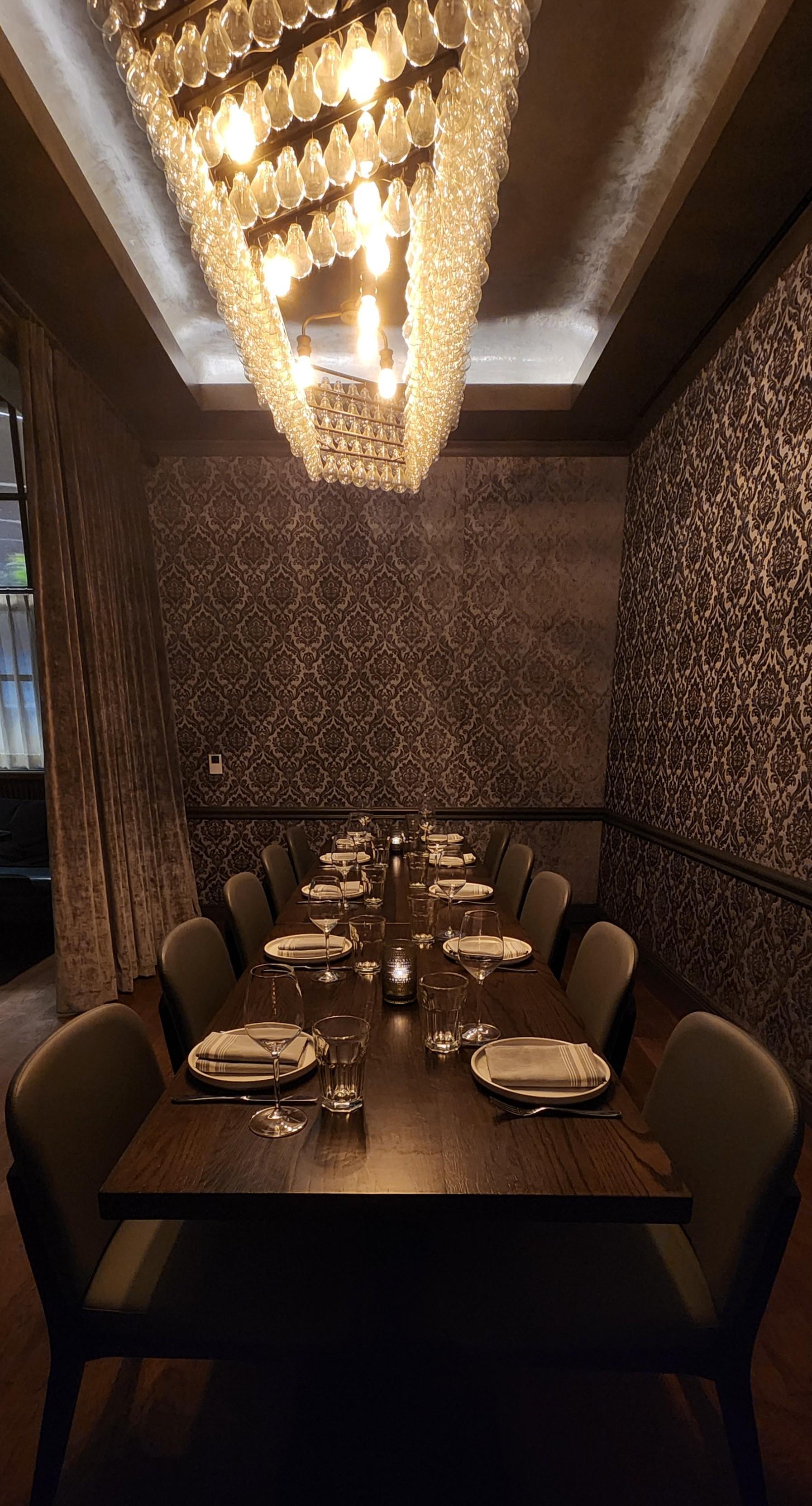 Tucked away for an elevated private dining experience, the Chandelier Room offers an intimate and elegant setting up to 14 guests. Framed by velvet damask accents and bathed in the soft glow of a stunning centerpiece chandelier, this refined space is ideal for seated dinners, celebratory toasts and meaningful conversations. Whether hosting a special occasion or a private gathering, guests will enjoy the ambiance of a thoughtfully designed room that blends comfort, style, and culinary excellence.