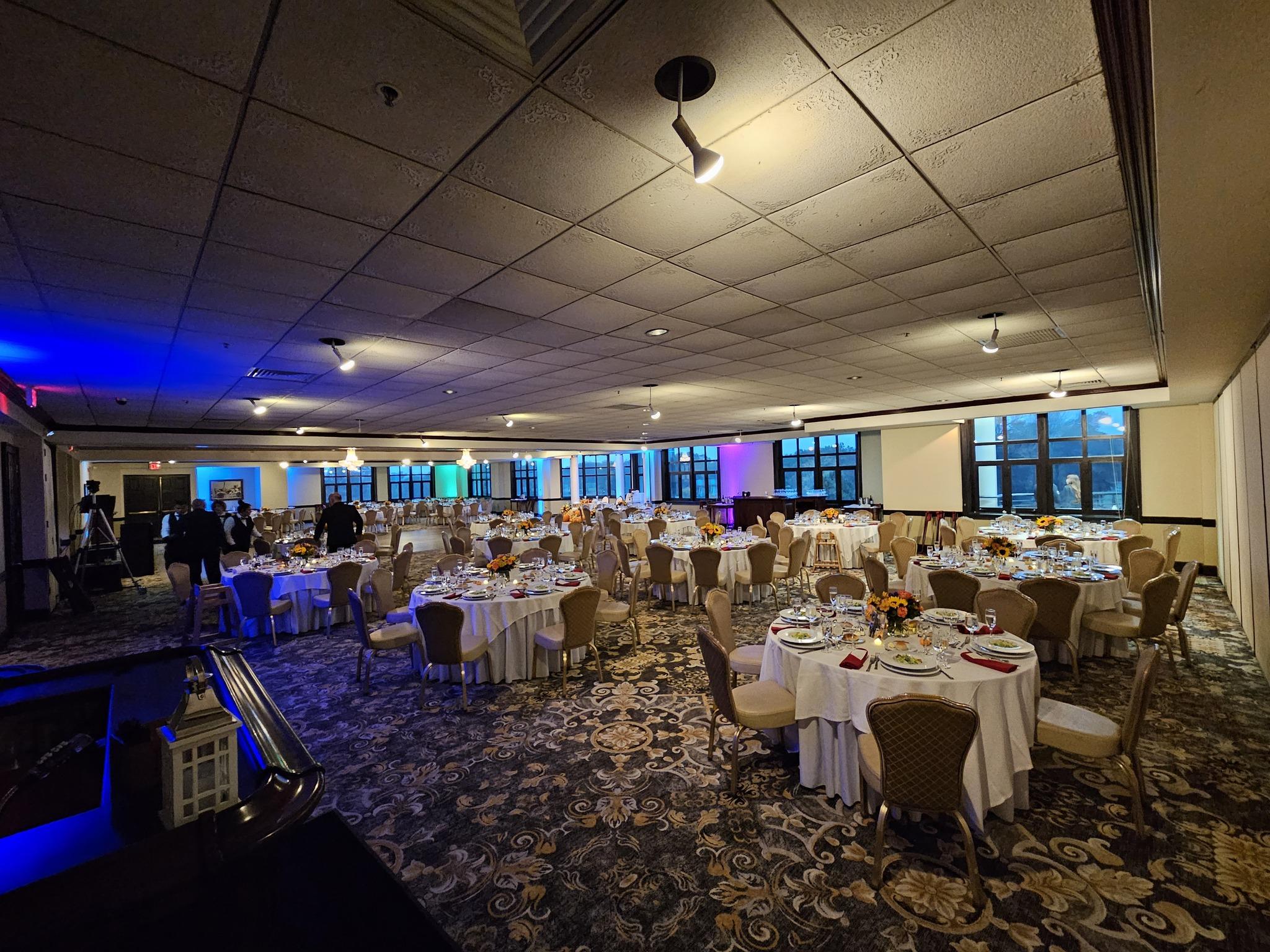 At The Knoll East Clubhouse, we can accommodate any event with up to 250 guests. The recently renovated space boasts a modern-rustic design, complemented by soft-colored wedding decorations and panoramic views framed by windows.