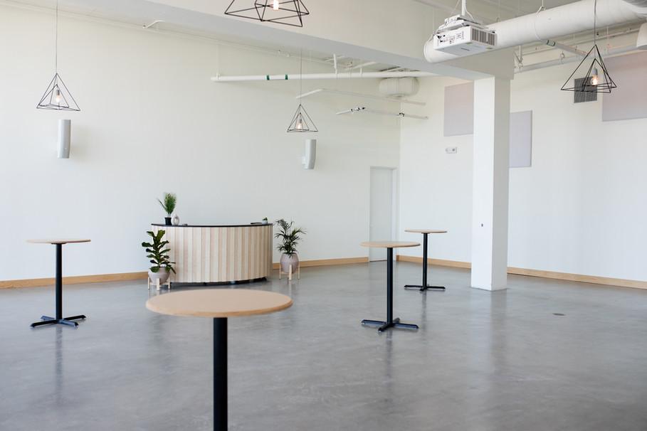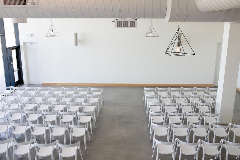 12 hour rental | Free WIFI | Capacity: - 120 theatre style - 200 mix + mingle | 15' sliding door | Projector available for rent (in fixed location) | (4) hanging light fixtures and (6) dimmable can lights