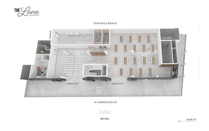 2 hour access w/ curfew at 10pm | Bay View | Capacity of 350 guests | On-site catering area on north end | Full access to (2) sliding door entrances