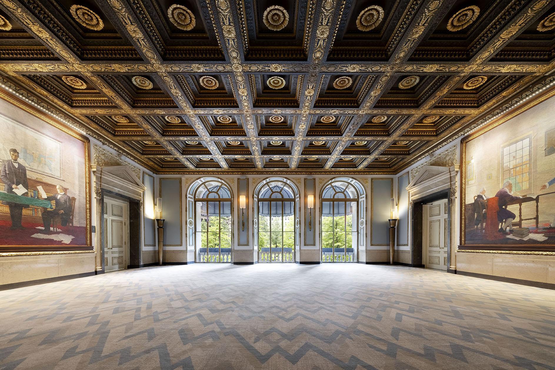 Originally The Federal Reserve Bank of Boston's President's office, the Wyeth room features original gold coffered ceilings, large oversized windows overlooking Norman B. Leventhal Park and two N.C. Wyeth murals.