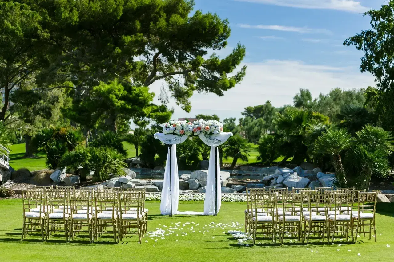 The country club has the ability to host the largest and most extravagant parties as well as smaller, more intimate ceremonies. With both indoor and outdoor event spaces, couples can create the dream wedding they’ve always envisioned. For couples seeking to make the most out of the Las Vegas sunshine and the grounds' fabulous greenery, the Presidential Lawn is a breathtaking and sought-after location for any wedding ceremony. Couples can explore the lawn’s endless possibilities and configure the space to best suit their preferred style and celebration. Featuring beautifully landscaped gardens and decorated grounds, couples can exchange their vows with the championship golf course as their backdrop. For traditional and historic wedding receptions, the iconic Rotunda Room has hosted various-sized gatherings over many years.