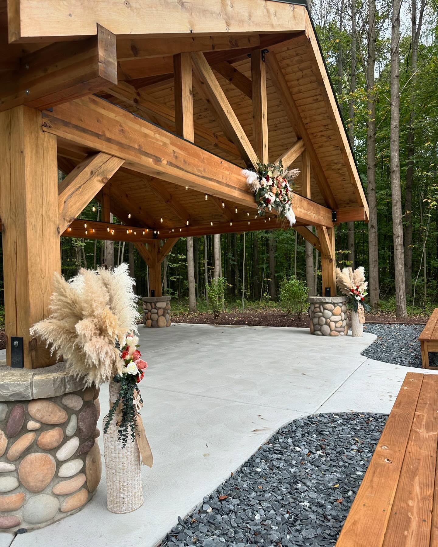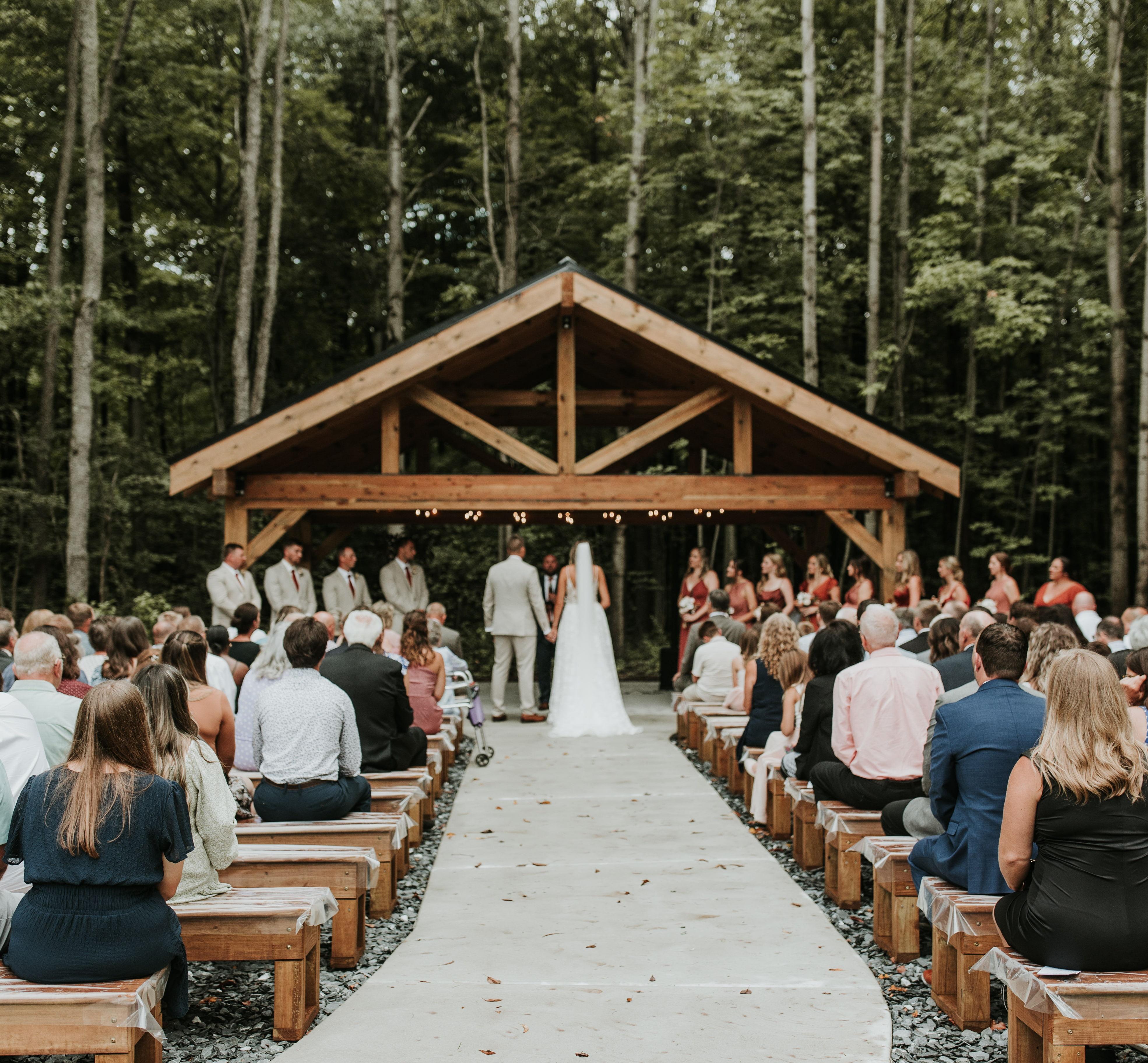 The Timber View is in a clearing among the trees directly behind the barn venue. Draped with string lights and benches for your guests, this space will be a beautiful location for your ceremony. The Barn View is another option location located on the left (north) side of the barn - This location will accommodate up to 150. There is also a nice patio area with string lights in the rear of the venue that is included in the venue price.
