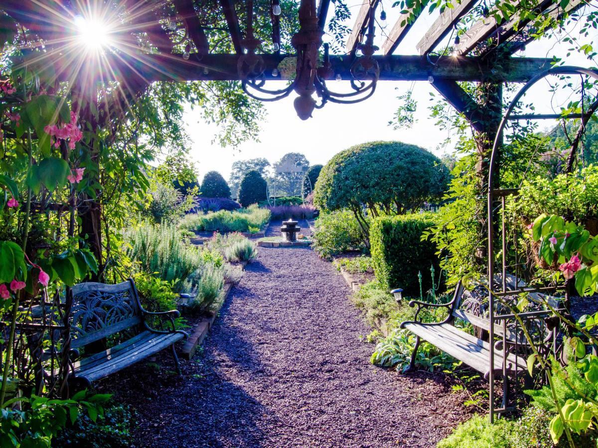 This space features a lighted pergola upon entering the gardens, with an old mill-wheel fountain in the center, with gravel walkways circling the garden. A garden angel arbor completes the space. Perfect for cocktails in the garden!
