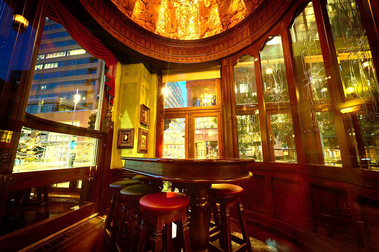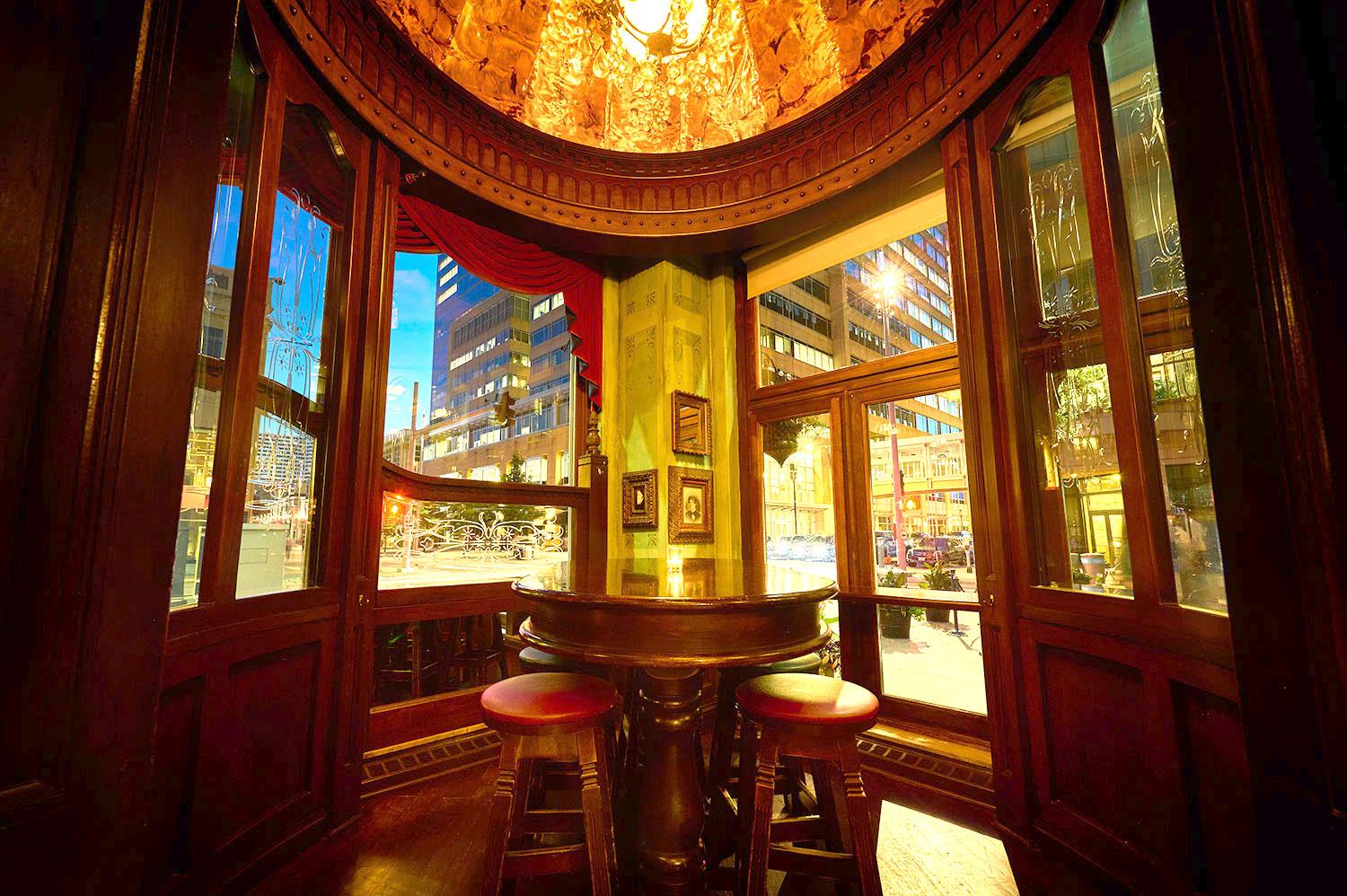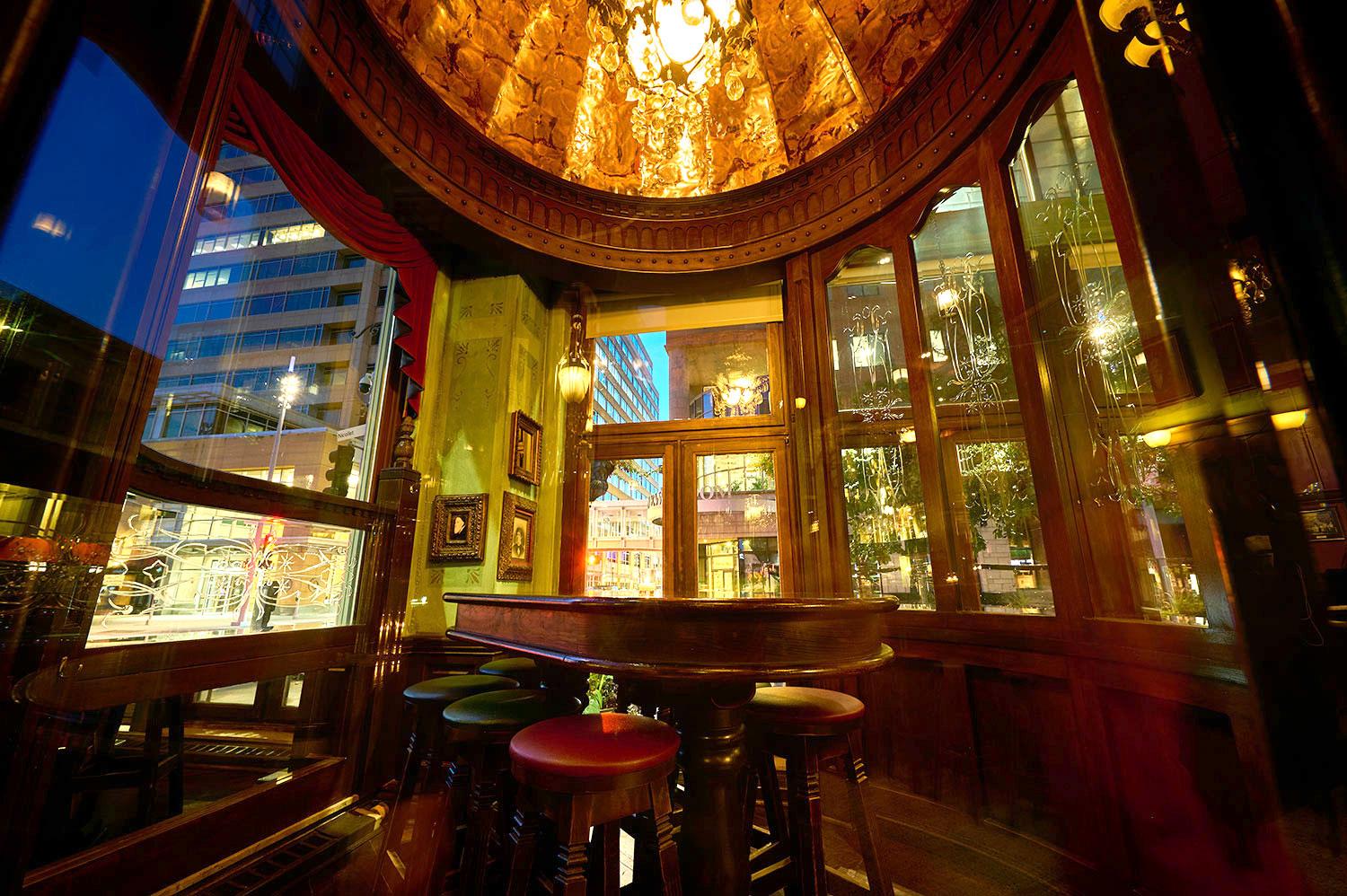 The front corner boasts a gorgeous Tiffany chandelier, a private table and views of Nicollet Mall, another wall is a series of cozy snugs laden with etched-glass windows, and in the middle is a generous space for mingling. An ideal space for both extraverts and introverts alike!