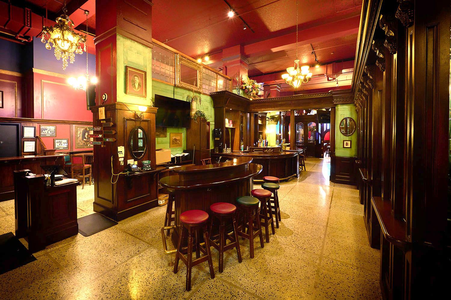 Designed and built in Ireland, the majority of our pub was shipped across the ocean and assembled onsite. Separated by large wood finishes and a bar that runs down the center of our establishment, the space naturally supports intimate group conversations while celebrating within a larger communal group. A win-win for big group events!