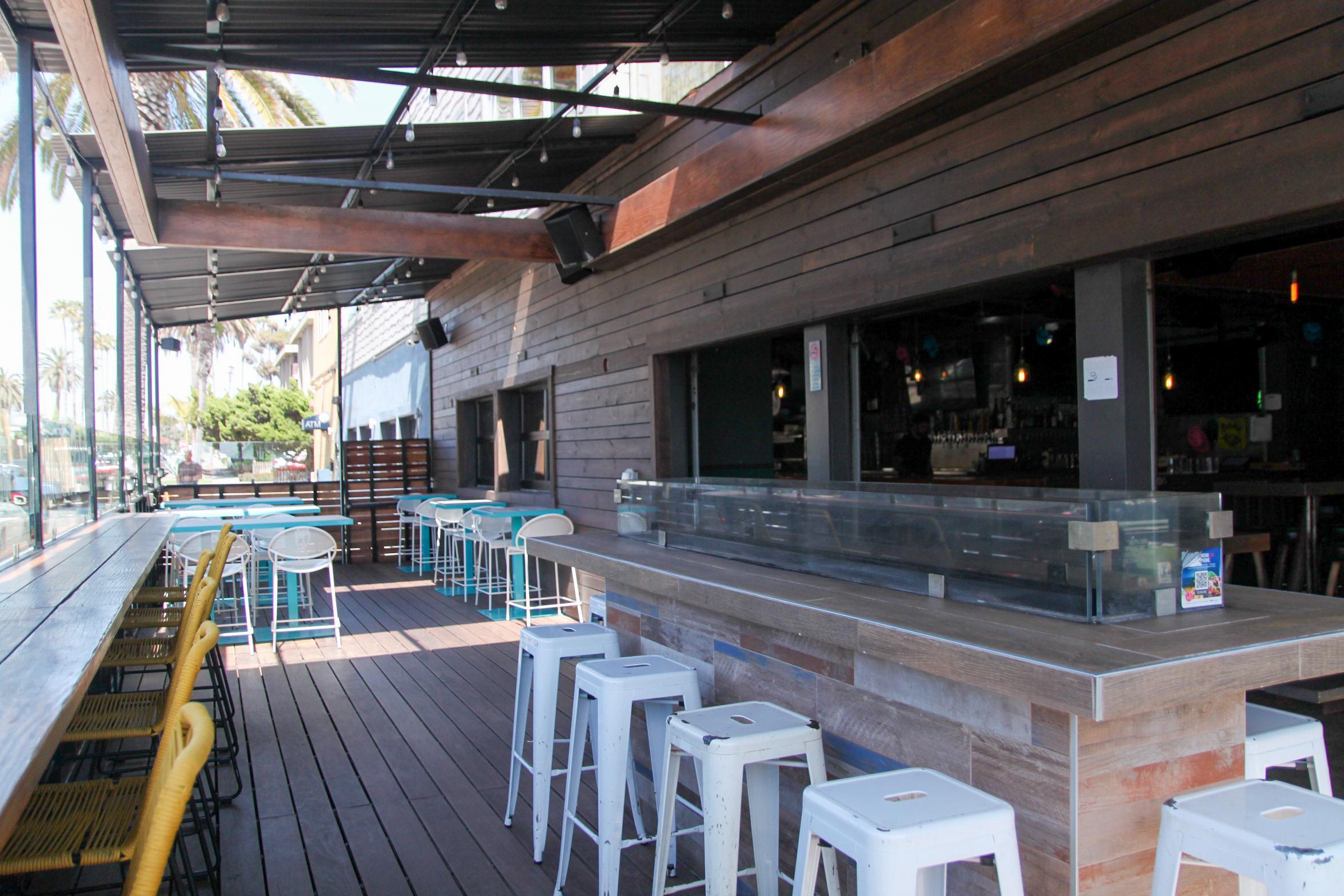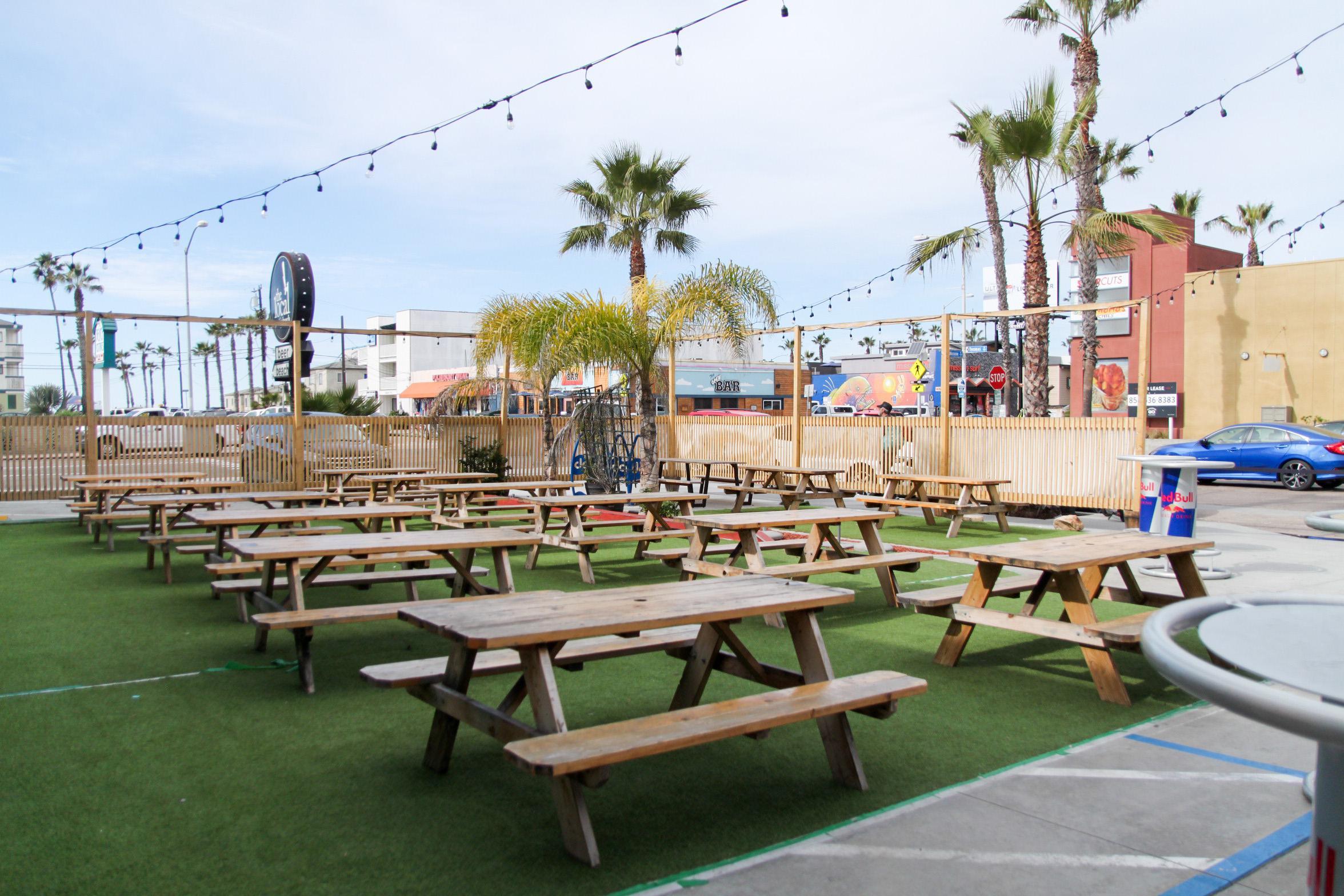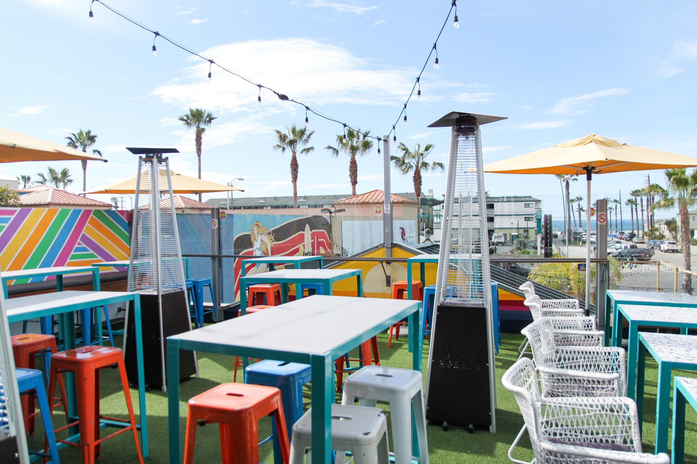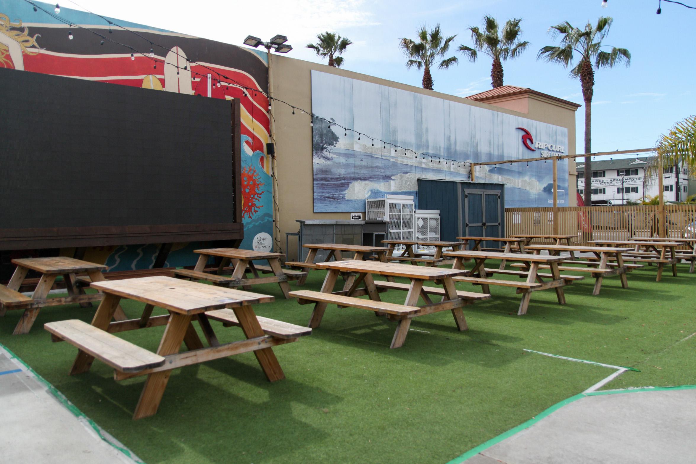 Fully outdoor casual atmosphere, picnic style tables, umbrellas, jumbotron TV, views of the pacific ocean, space heaters