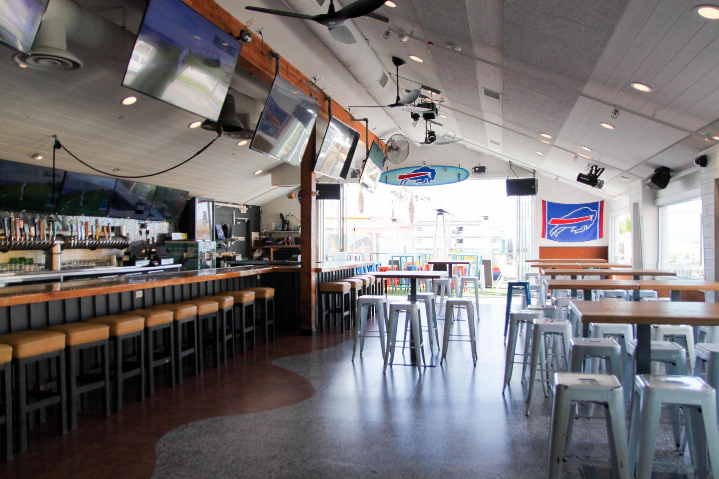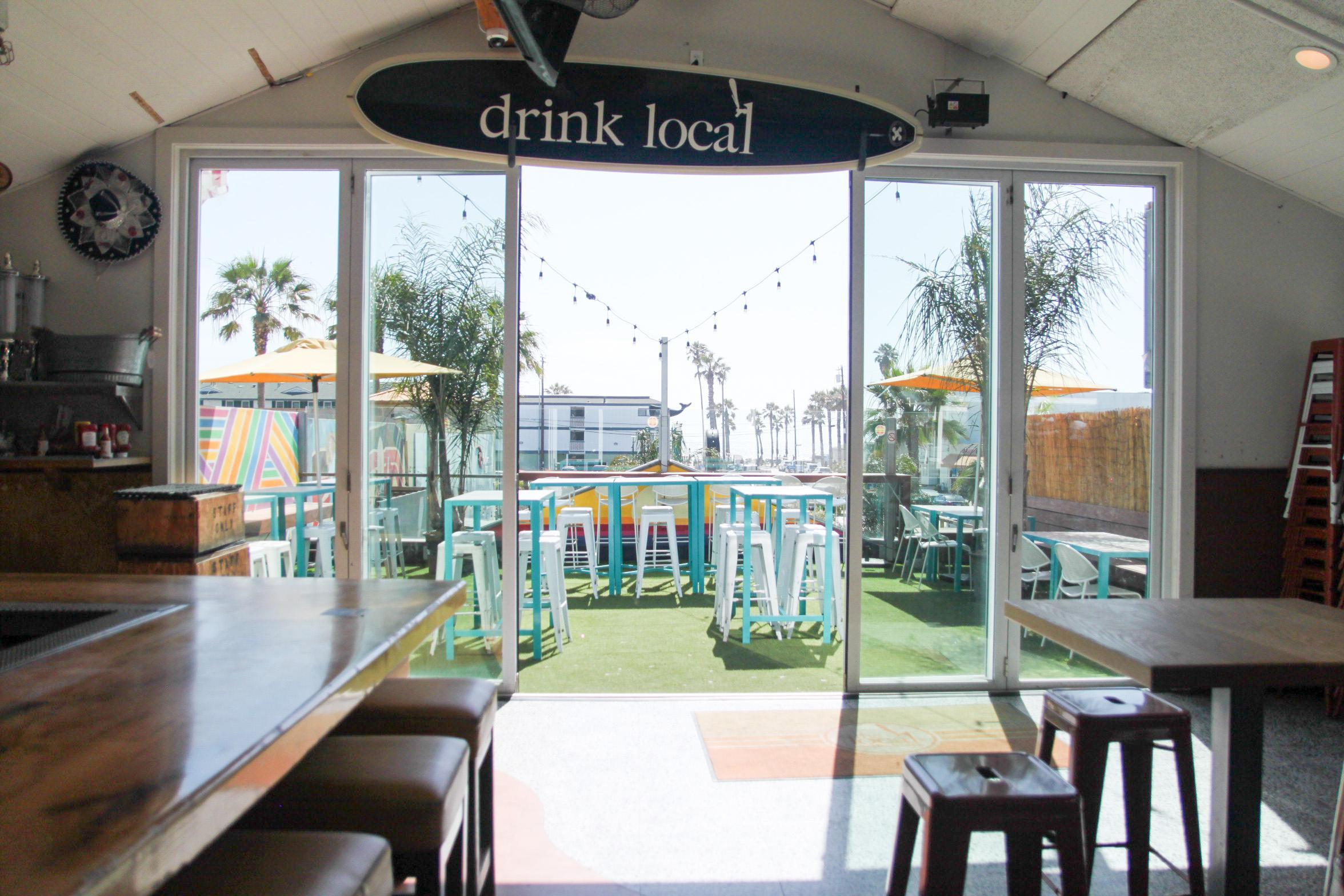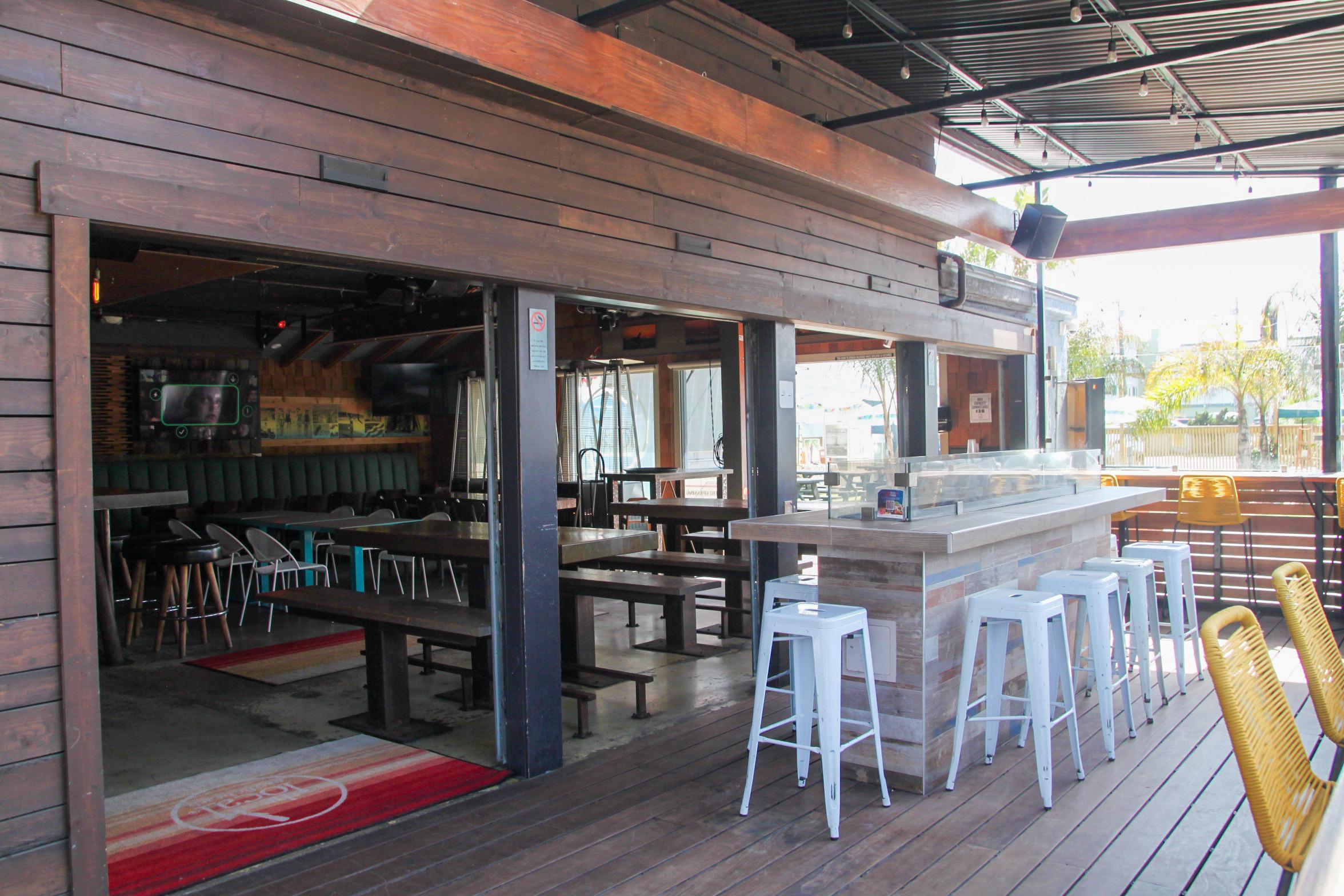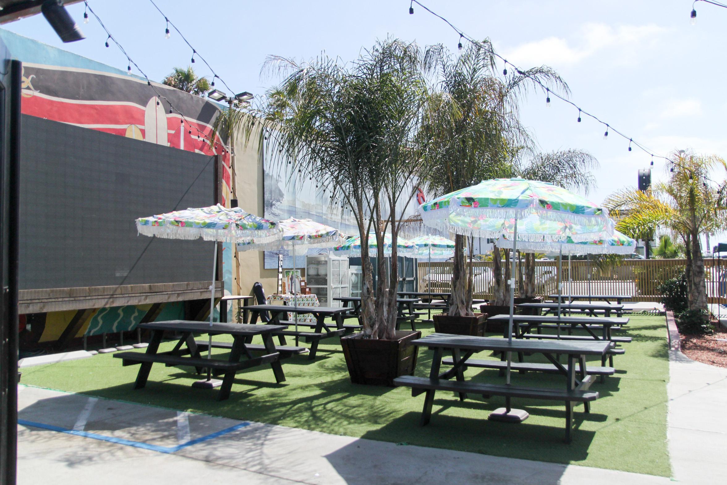 Fully outdoor casual atmosphere, picnic style tables, umbrellas, jumbotron TV, views of the pacific ocean, space heaters